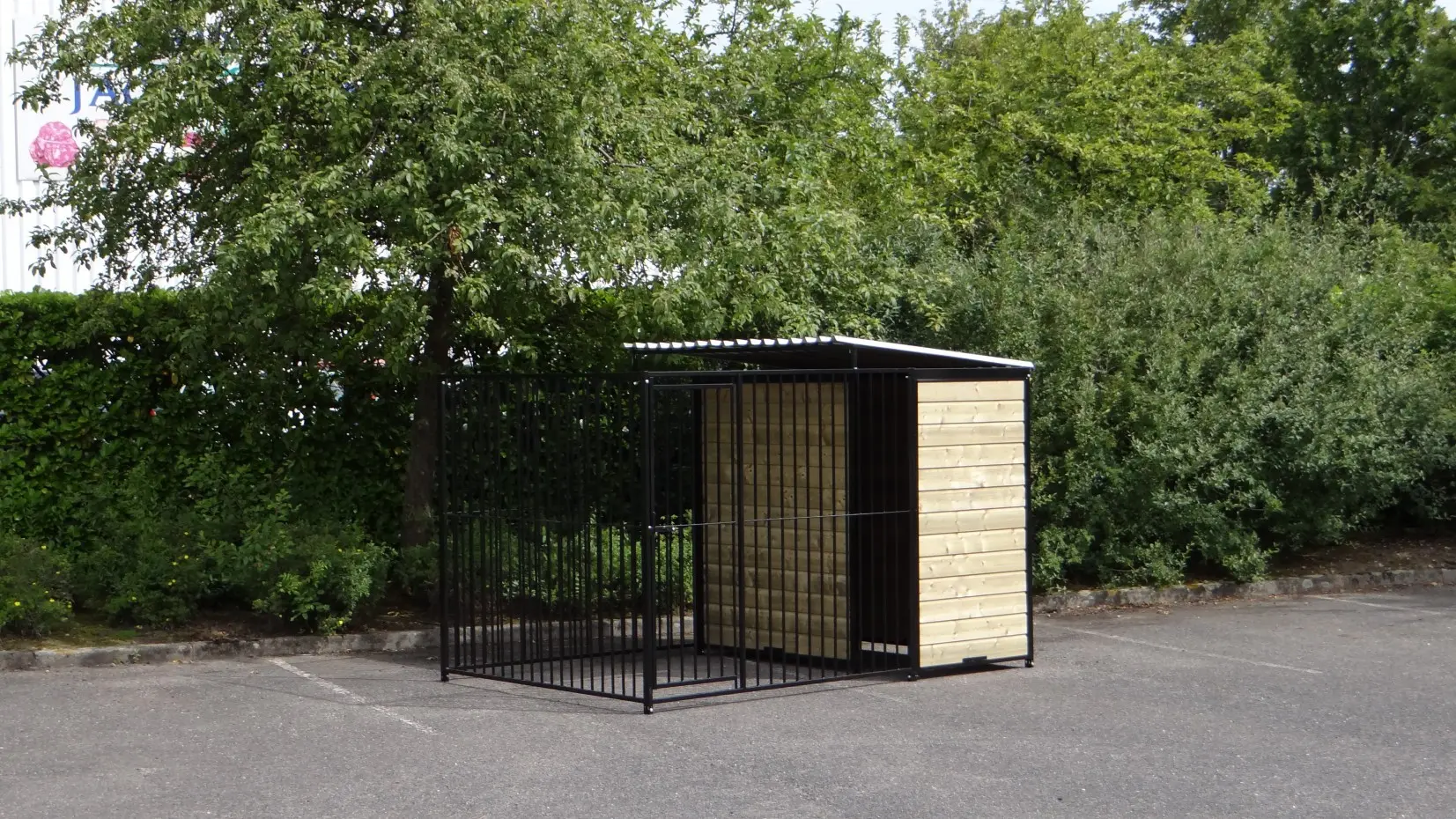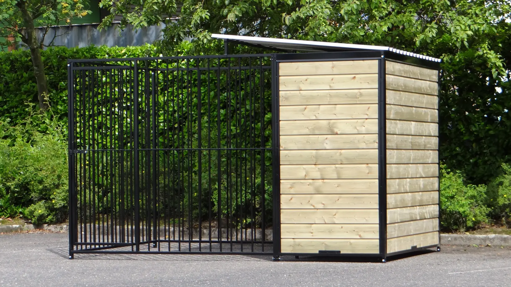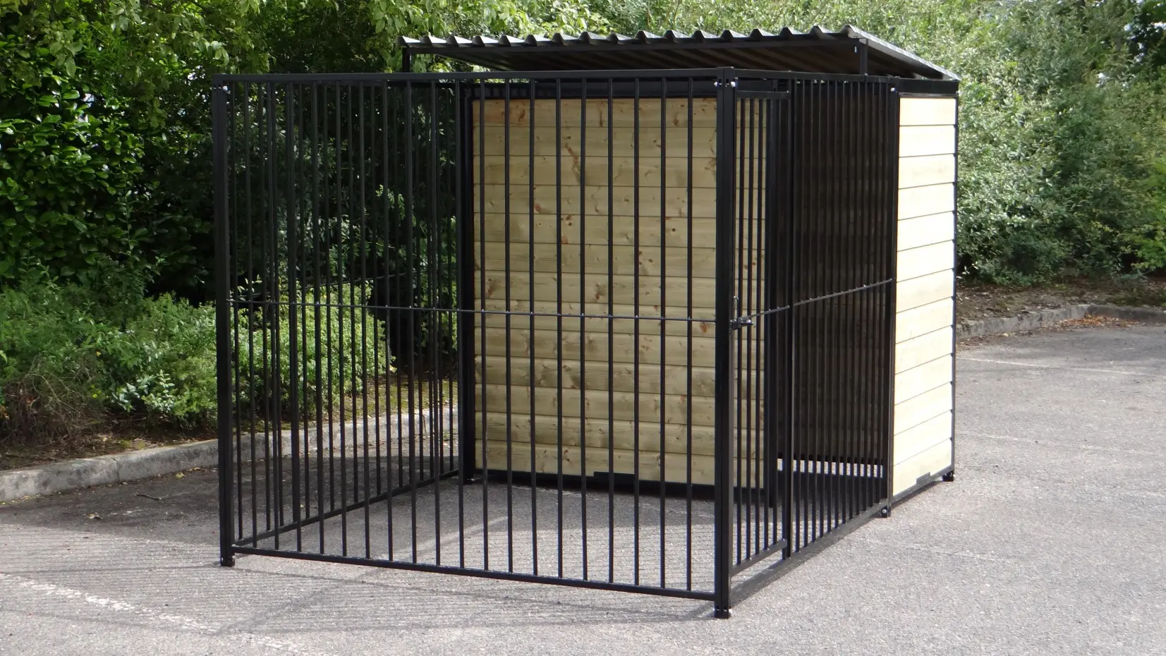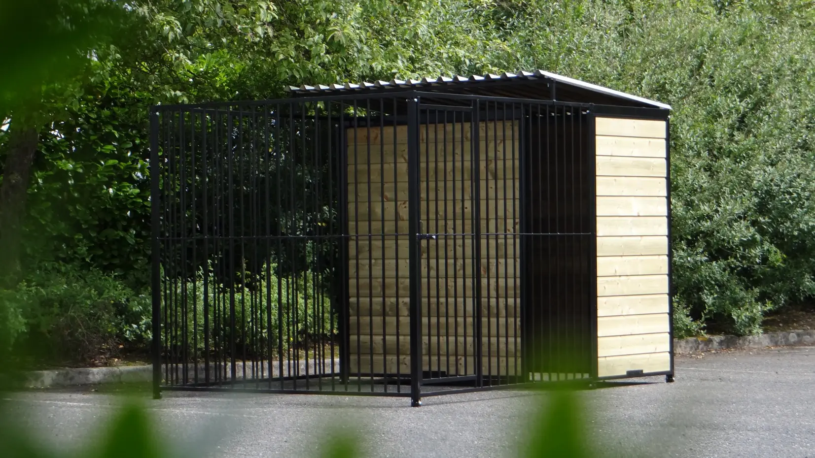 This strong, black powdercoated dog kennel is a wonderful dog kennel for your dog. Equipped with a half roof and wooden walls. The kennel is 3 x 2 meter and the kennel has a windwall for an optimal protection for your dog.