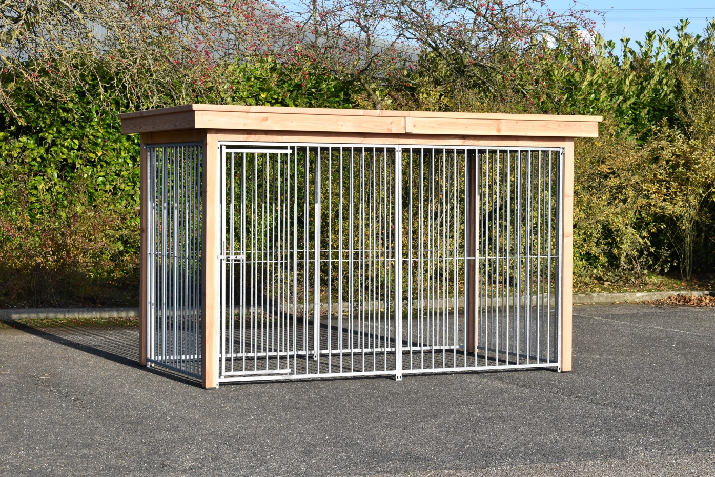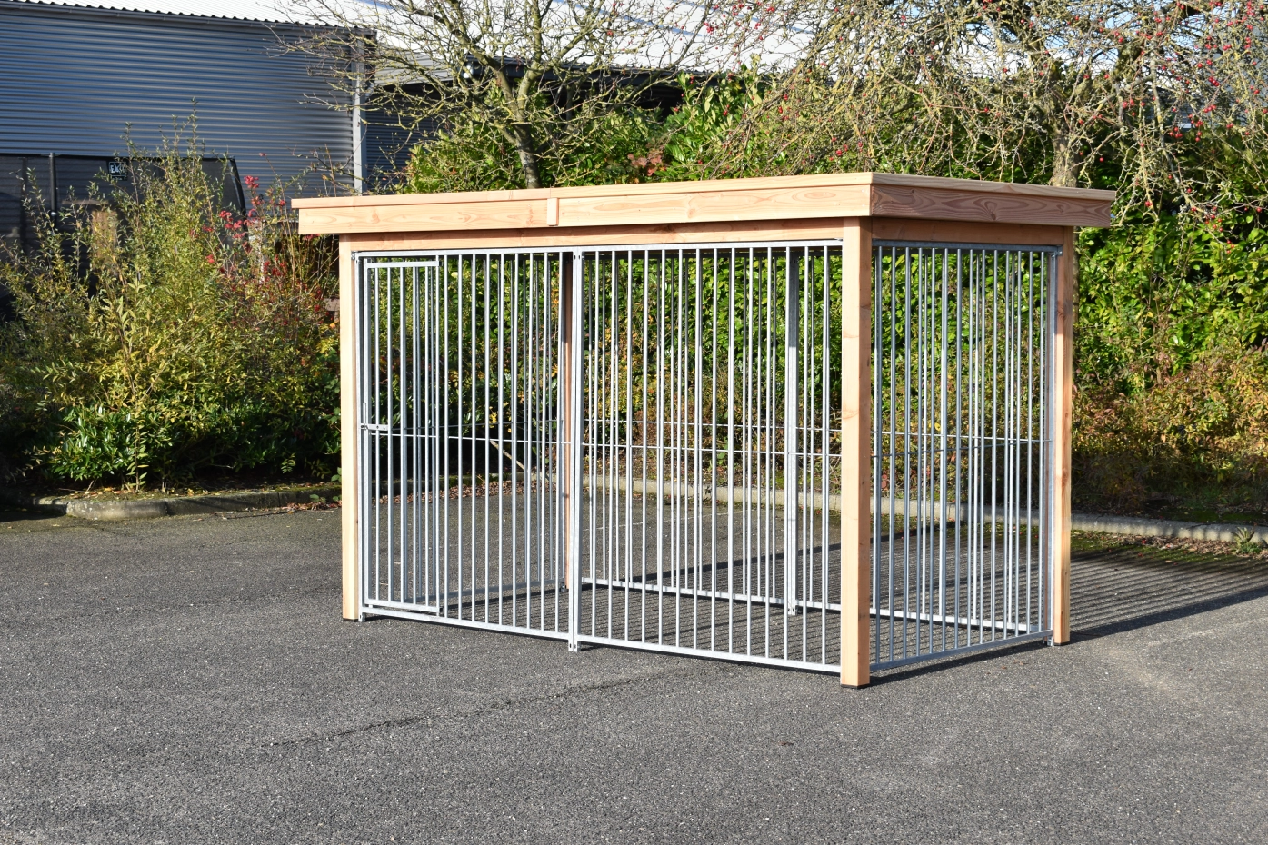 The dog kennel Flinq exists of 6 galvanized panels. The kennel has a Douglaswooden framen and a luxury roof. Without further treatment, the wood will quickly turn grey. To preserve the color of the wood you can treat it with Douglas oil.