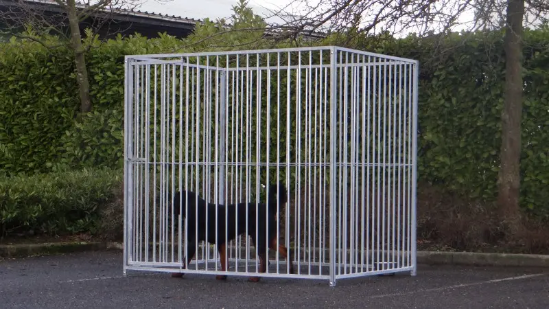 Galvanized dog kennel of 2x1,5m. The kennel exists of 2 panels of 2m and 2 panels of 1,5m, one of them has a door.