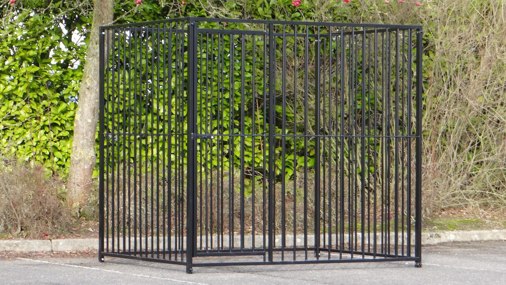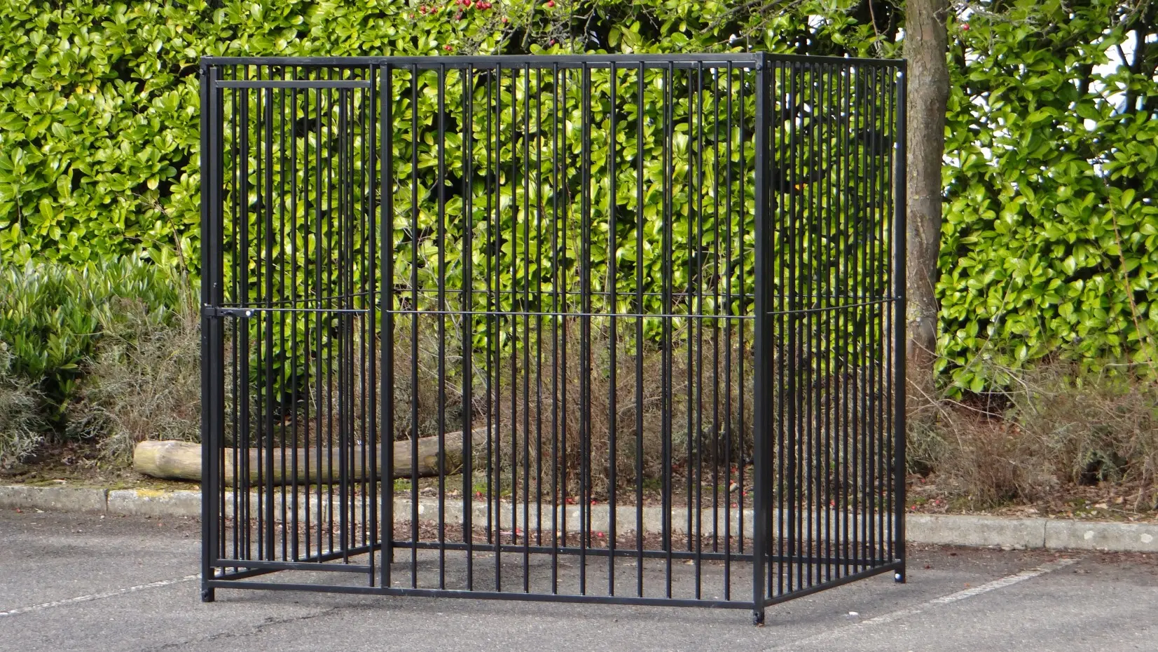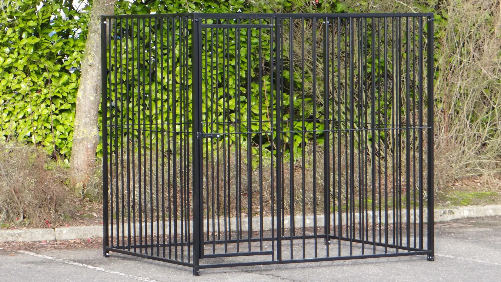 Black powder-coated dog kennel of 2x,5m. This kennel exists of 2 panels of 1,5m and 2 panels of 2m, one of them has a dooropening.