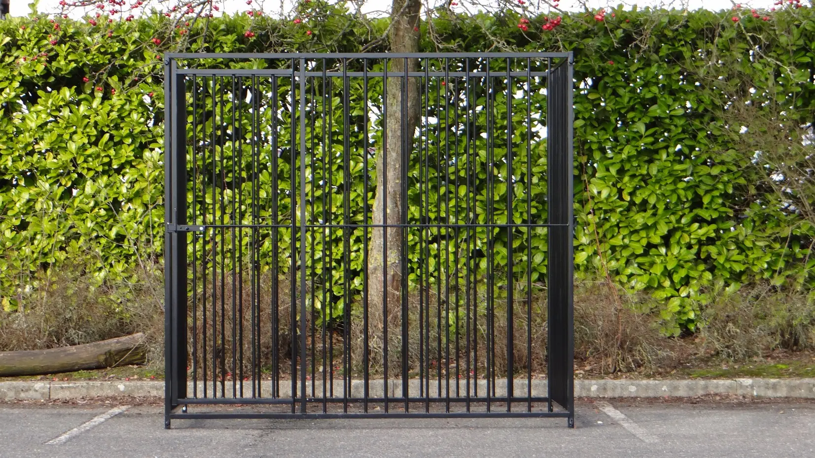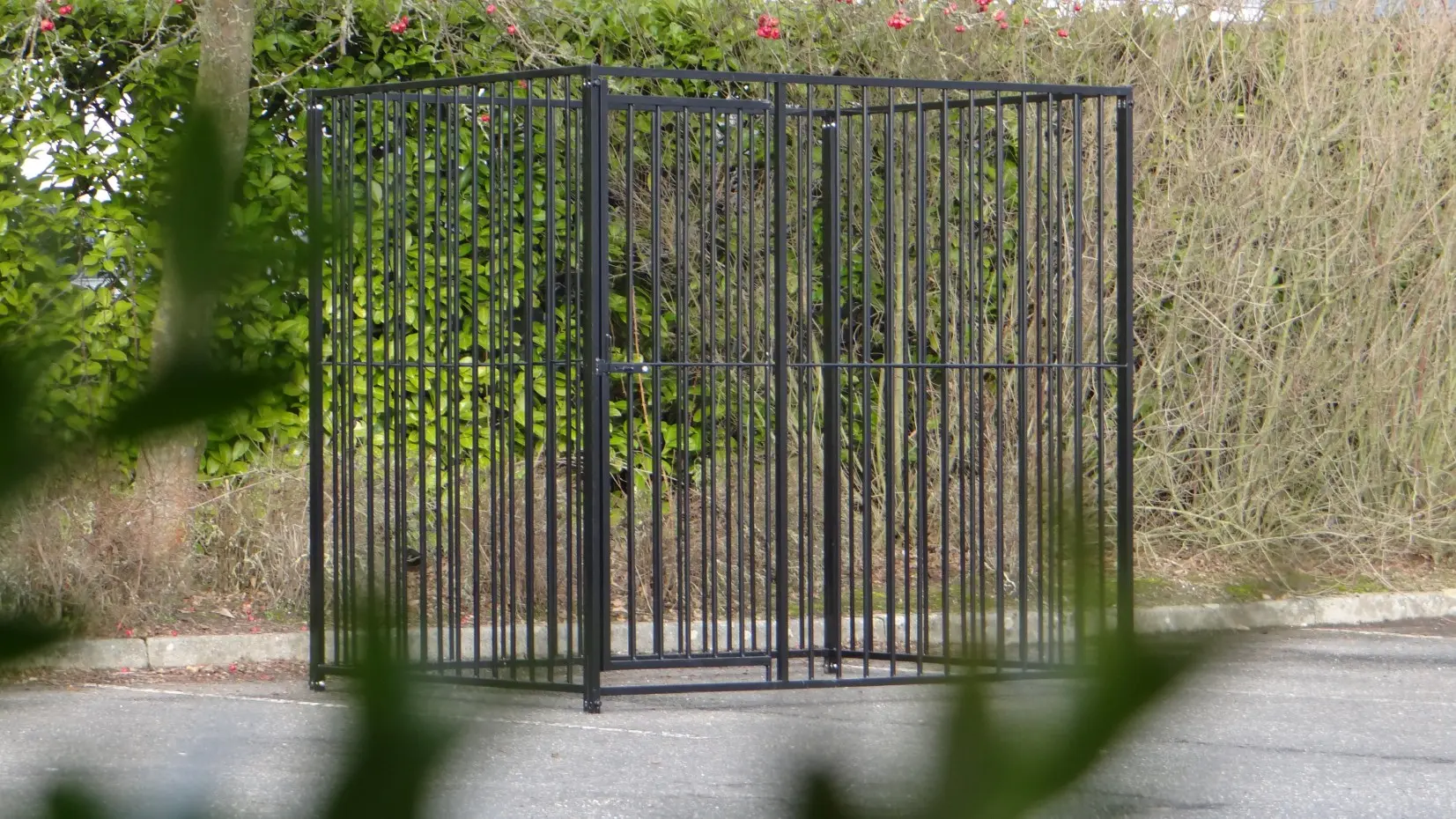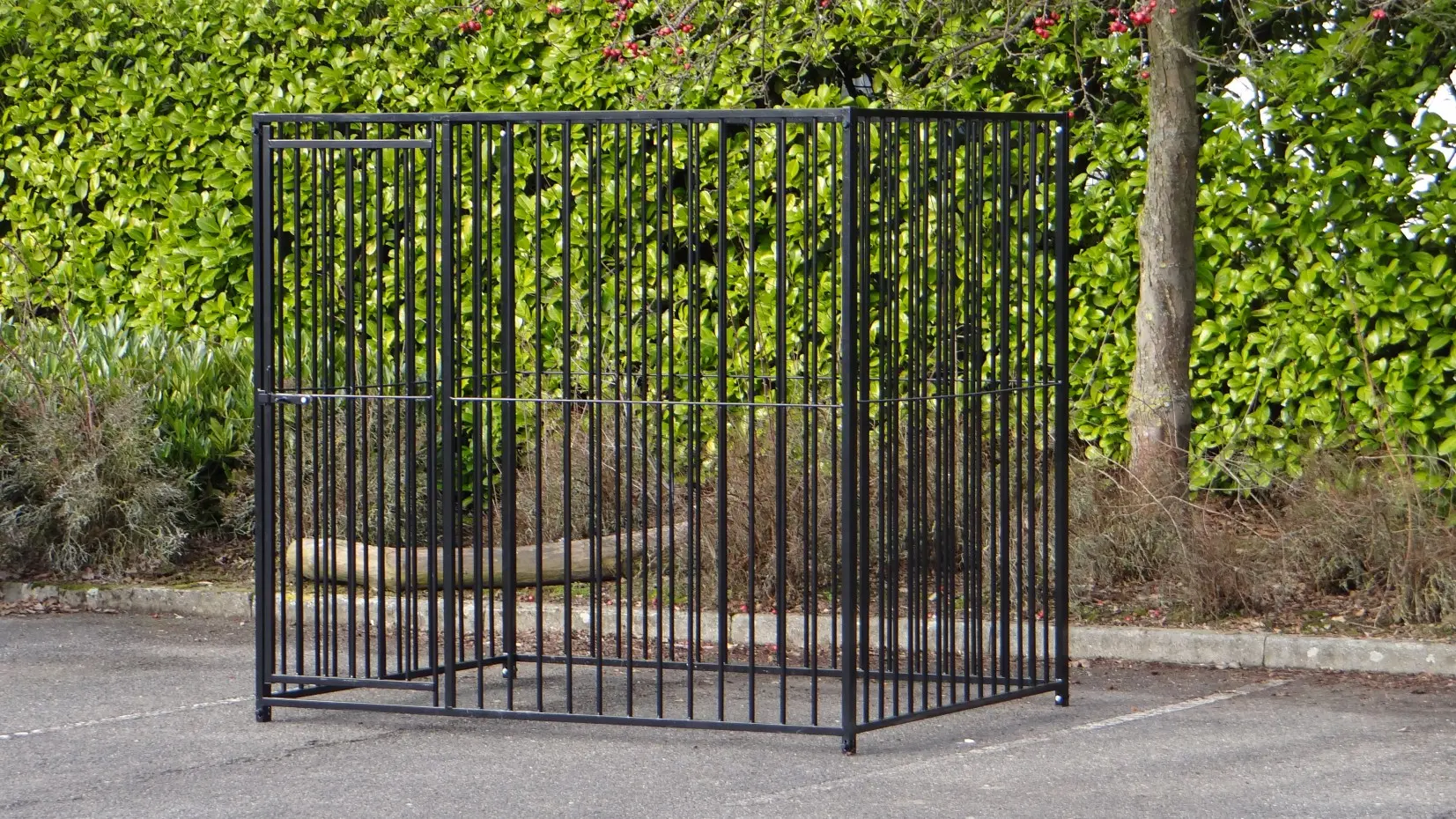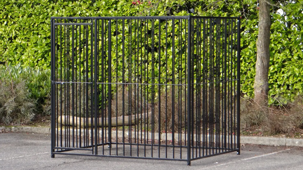 Black powder-coated dog kennel of 2x,5m. This kennel exists of 2 panels of 1,5m and 2 panels of 2m, one of them has a dooropening.