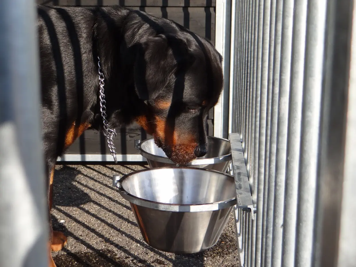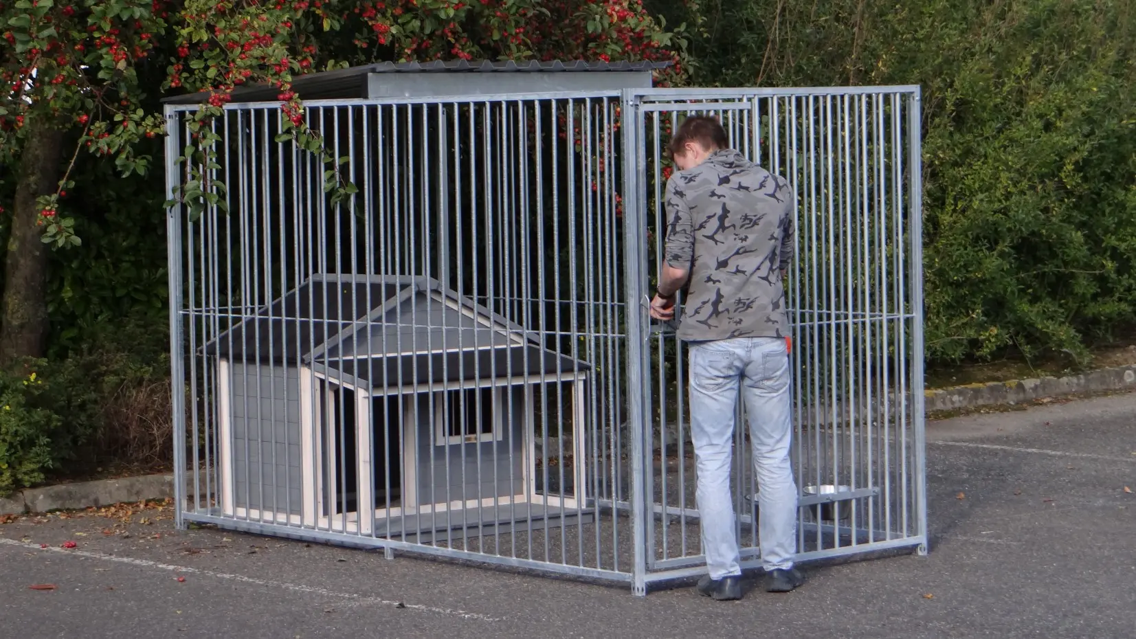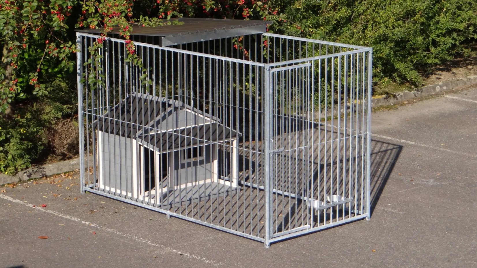 Dog kennel with galvanized kennel panels. The kennel is supplied with a half roof and includes the beautiful dog house Wooff. A feeding station is not included as standard. The rotating feeding station with double bowls is optional. This complete set provides a strong and secure outdoor space for your dog. The kennel and dog house are available from stock.