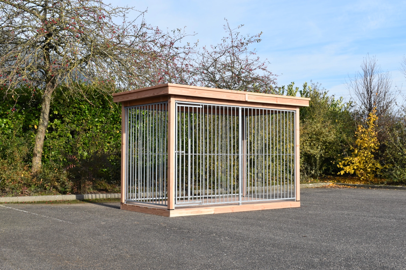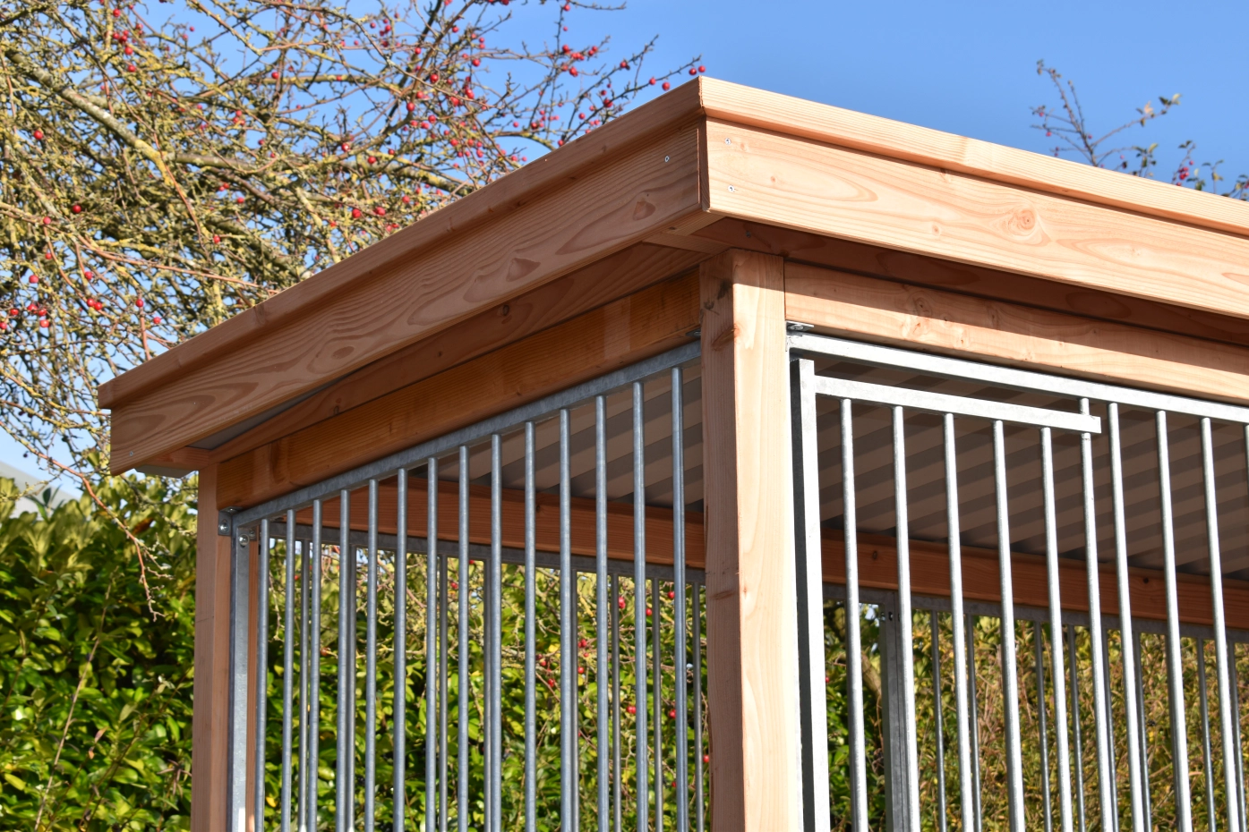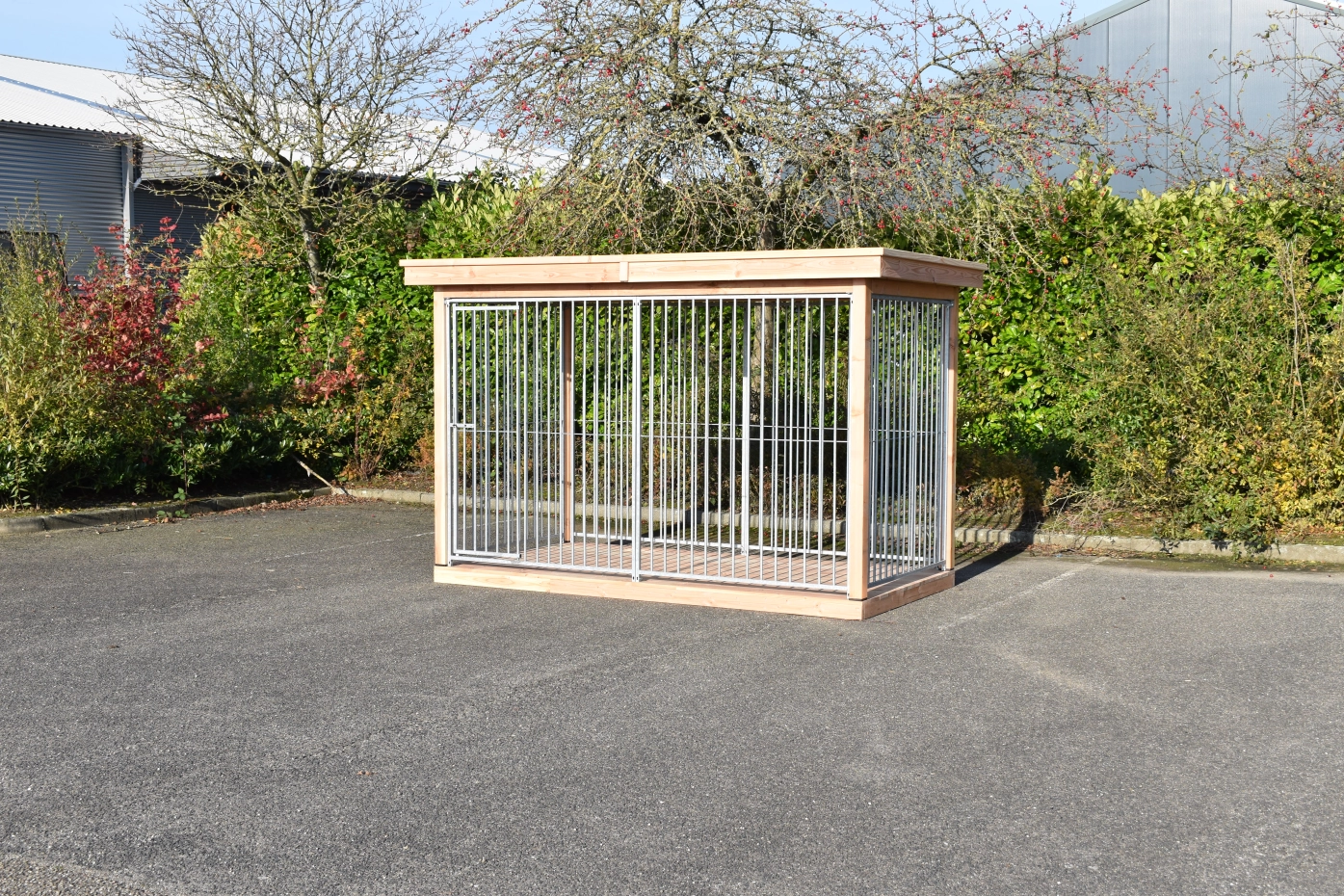 Dog kennel FLINQ has galvanised panels. The kennel has a floor, frame and a luxury roof of Douglaswood. To preserve the color of the wood you can treat it with Douglas oil. Even without further treatment, Douglas fir is very durable. Without further treatment, the wood will quickly turn grey.