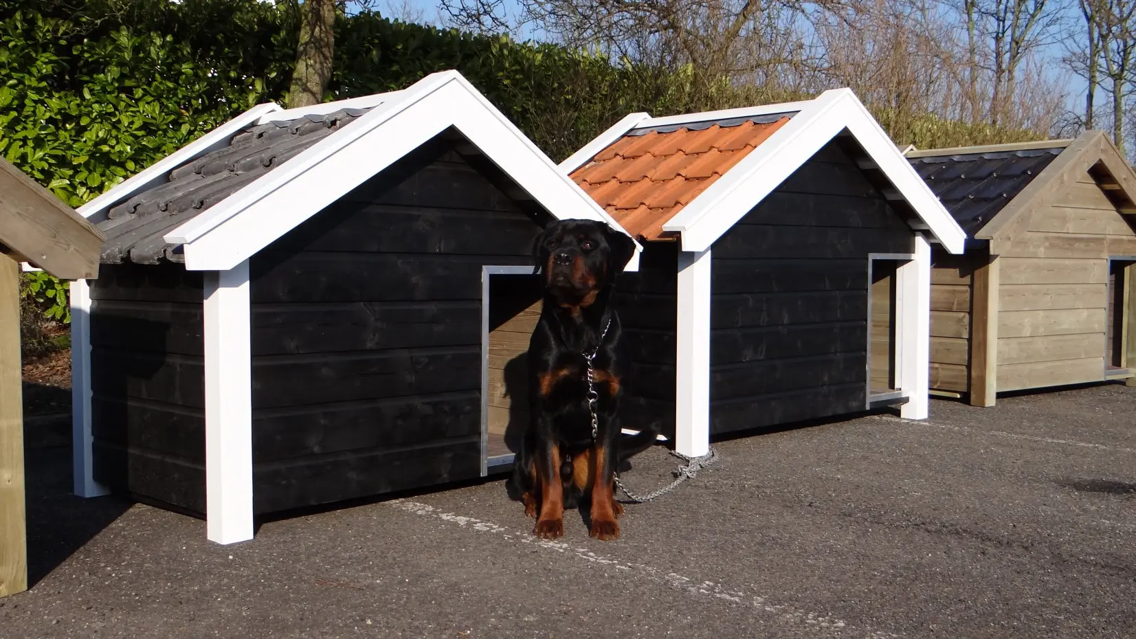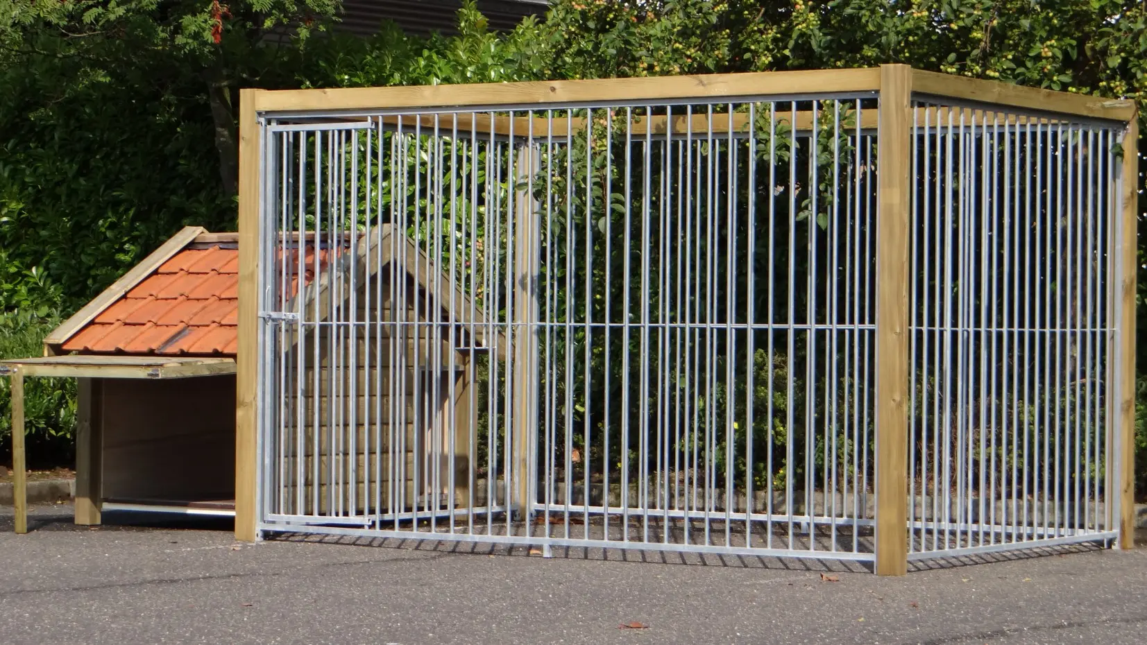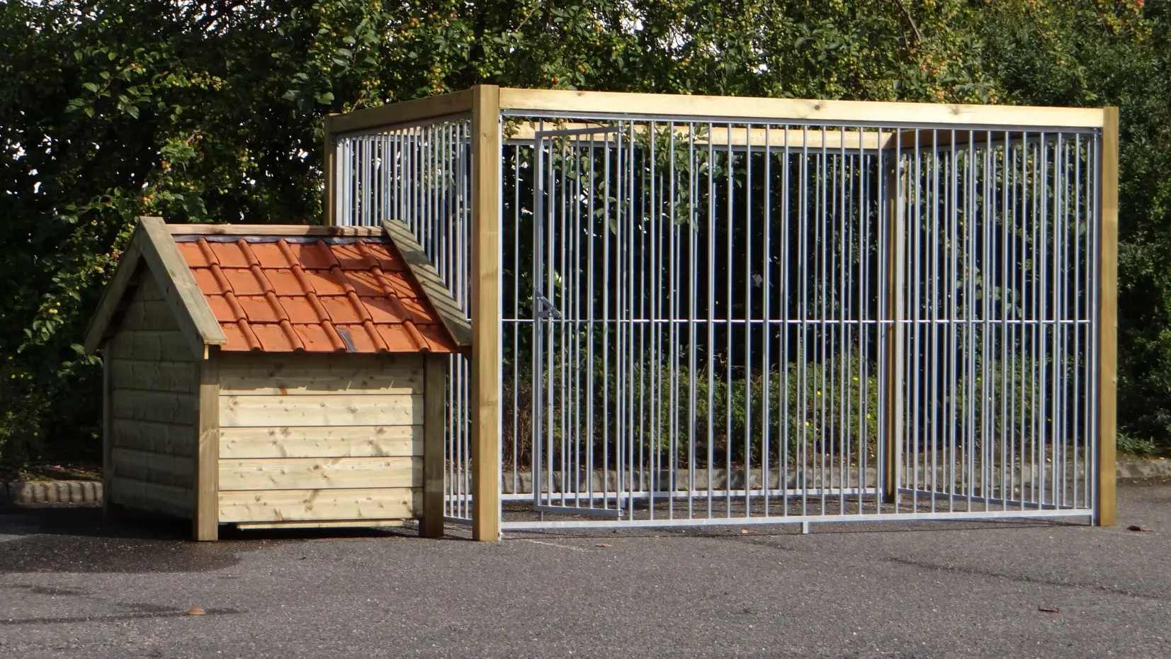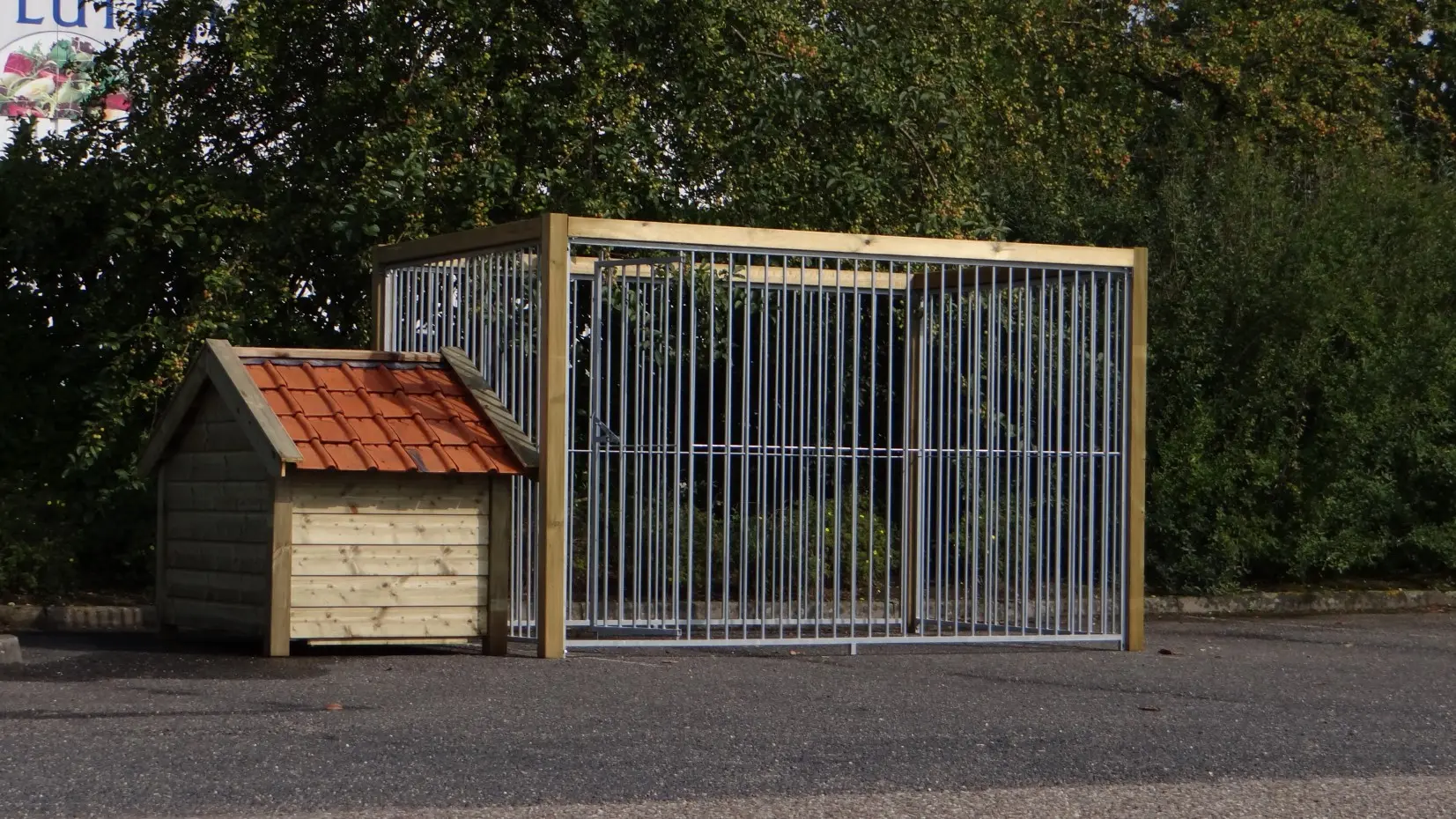 The dog kennel FLINQ is provided with the insulated dog house Snuf. In the kennel is an opening to the dog house, so that the dog can walk in and out. You can adapt the dog kennil after your own wishes. The kennel wil be delivered as a building kit.