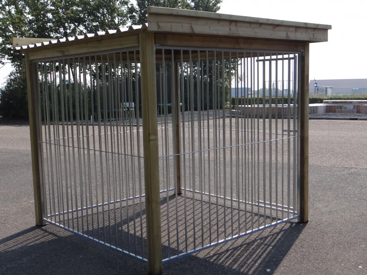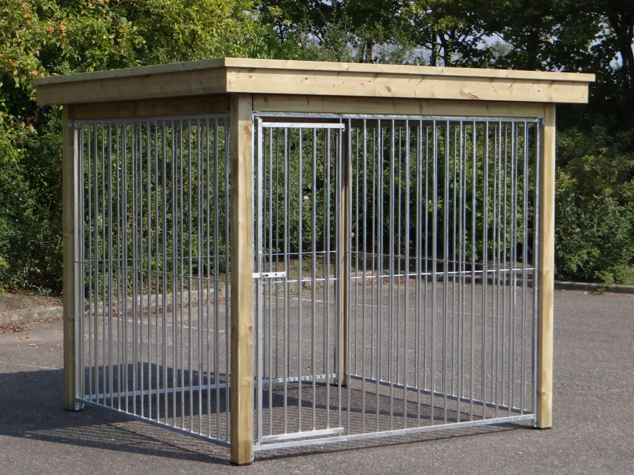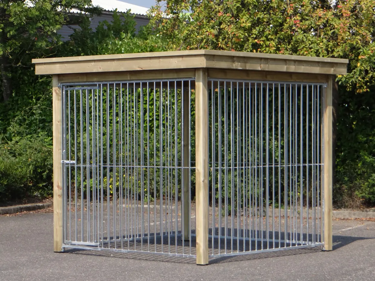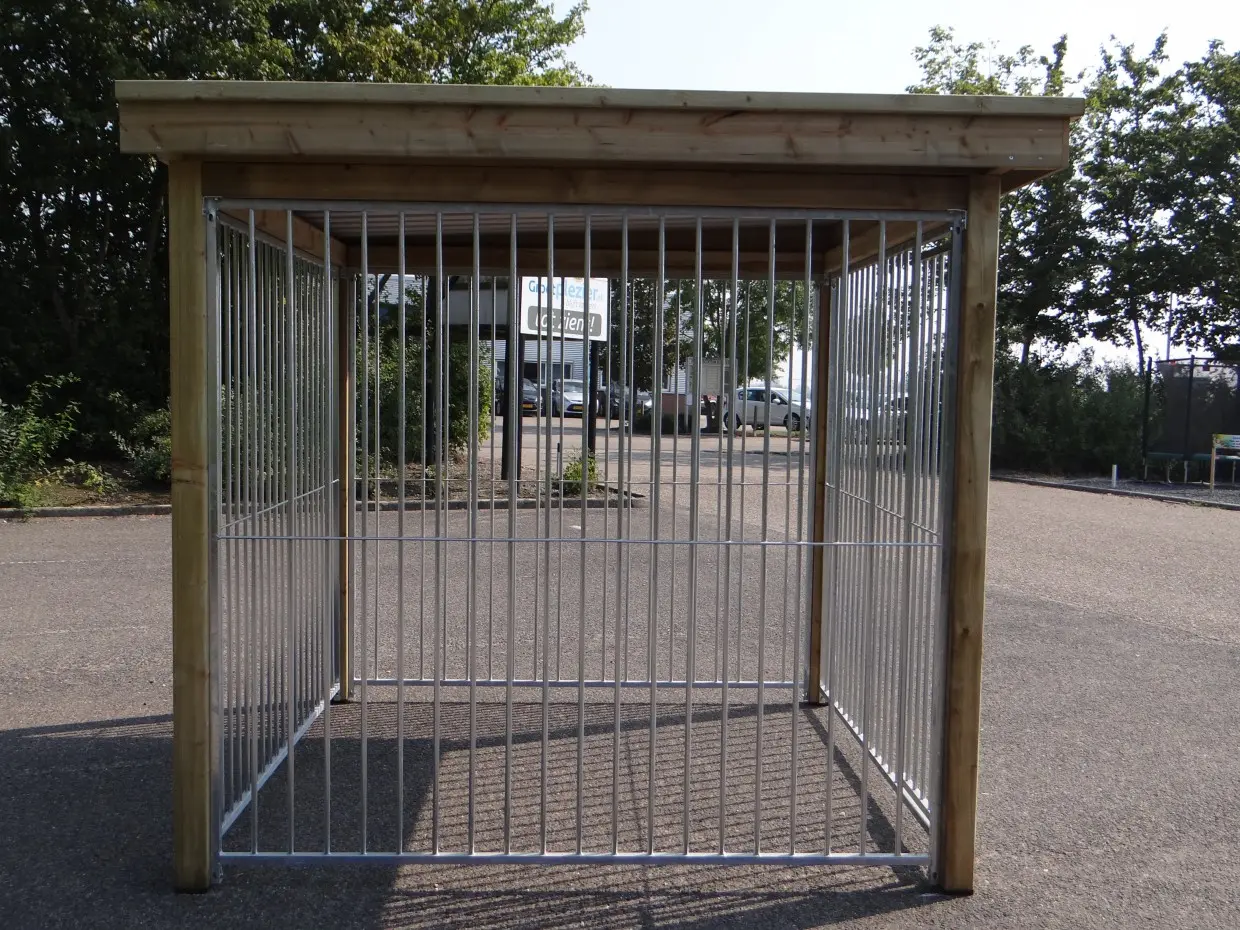 Dog kennel FLINQ exists of four 2 meter panels. Through the combination of galvanized panels and a wooden frame is the kennel a solid choice. The corrugated sheets are equipped with anti-condensation felt that dampens the sound of rain.