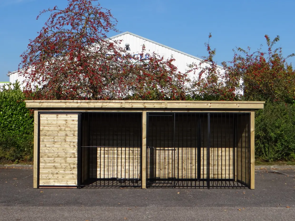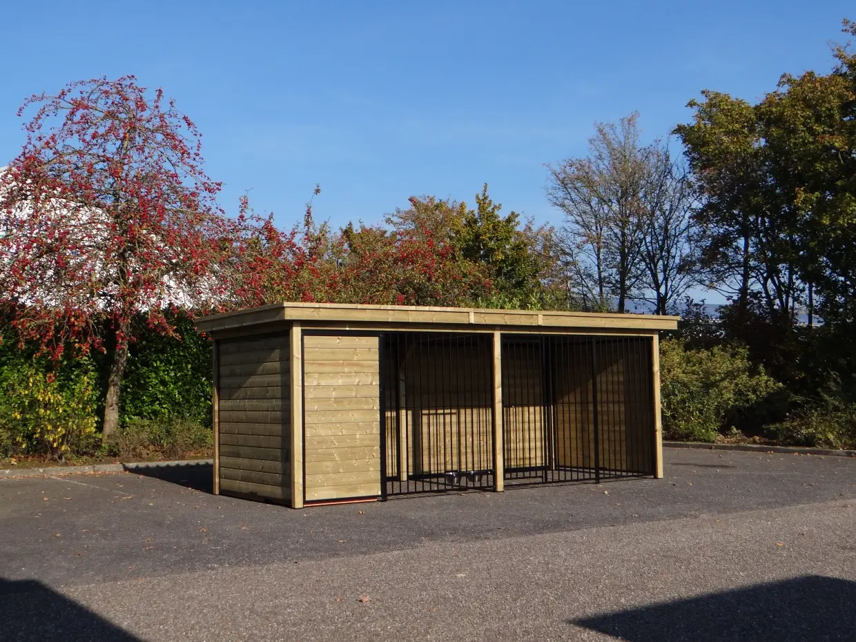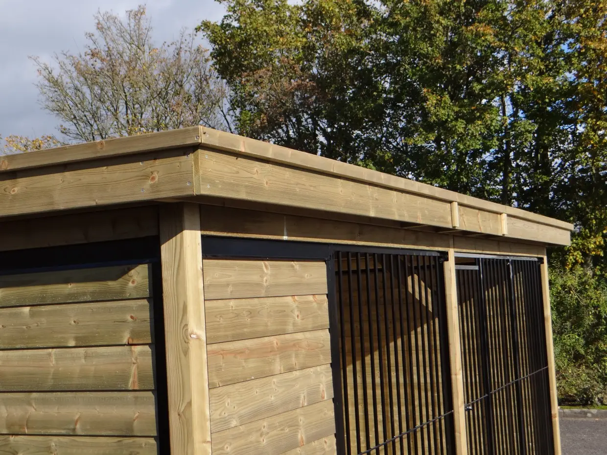 The black Forz dog kennel with wooden frame and luxury roofing system made of impregnated spruce wood is a beautiful kennel that offers optimal shelter for your dog all around. Behind the draft screen, an insulated night shelter is installed with a wooden deck in front of it. This makes the kennel a complete and attractive set for all seasons. The thick spruce wood frame and the beautifully finished roof together create a stunning appearance and perfectly complete the kennel.