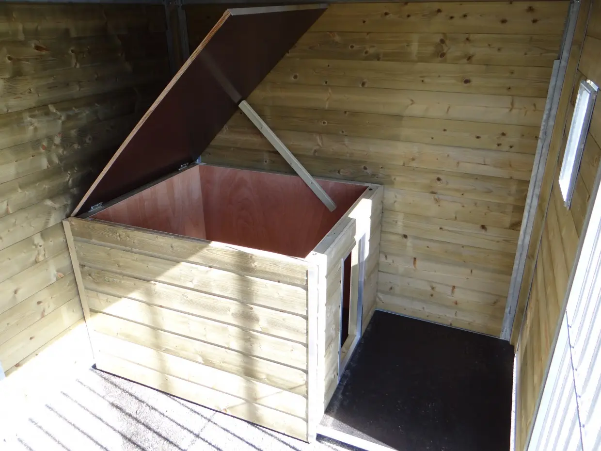 - The kennel door is standard on the left side, opens inwards and has the option of a padlock