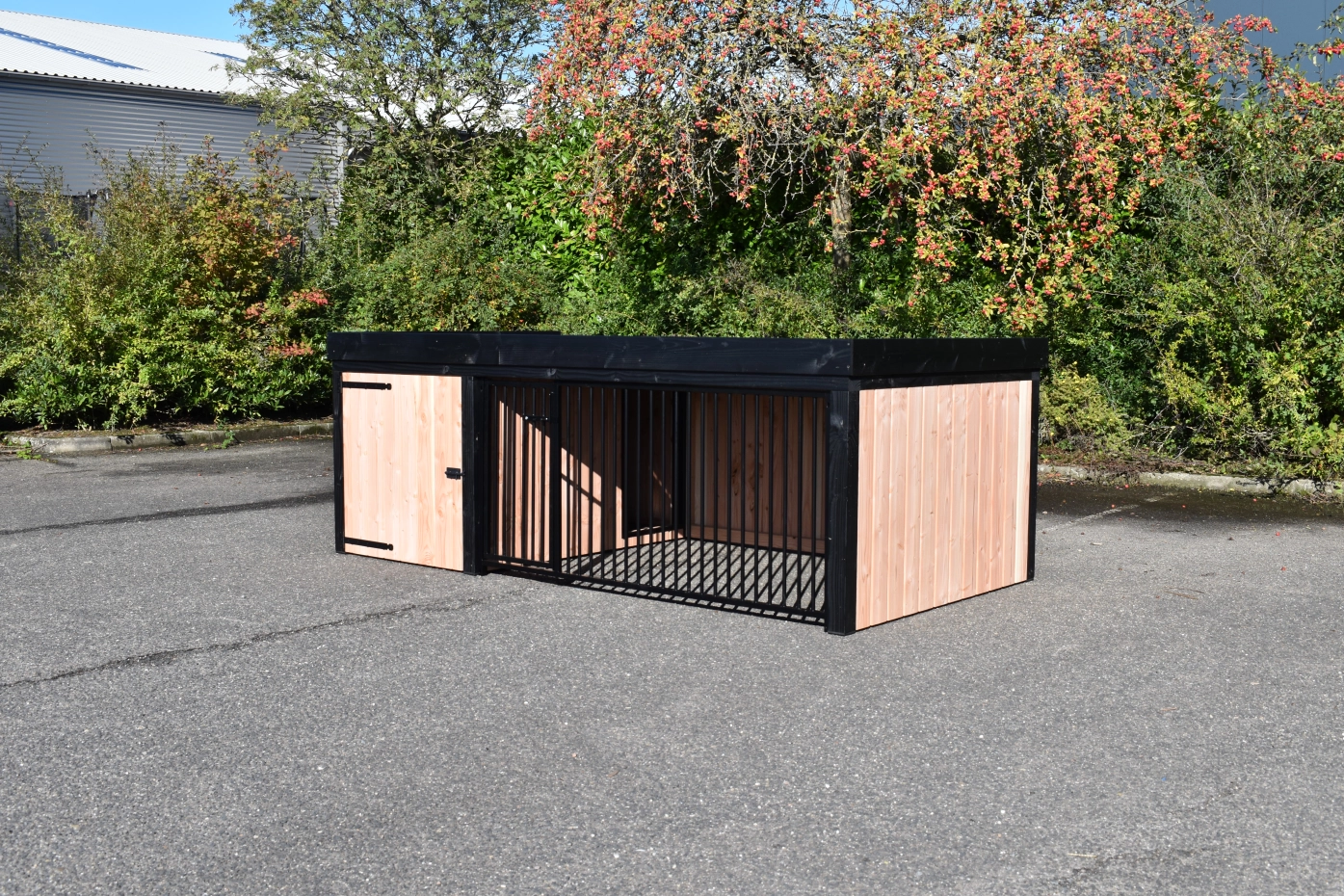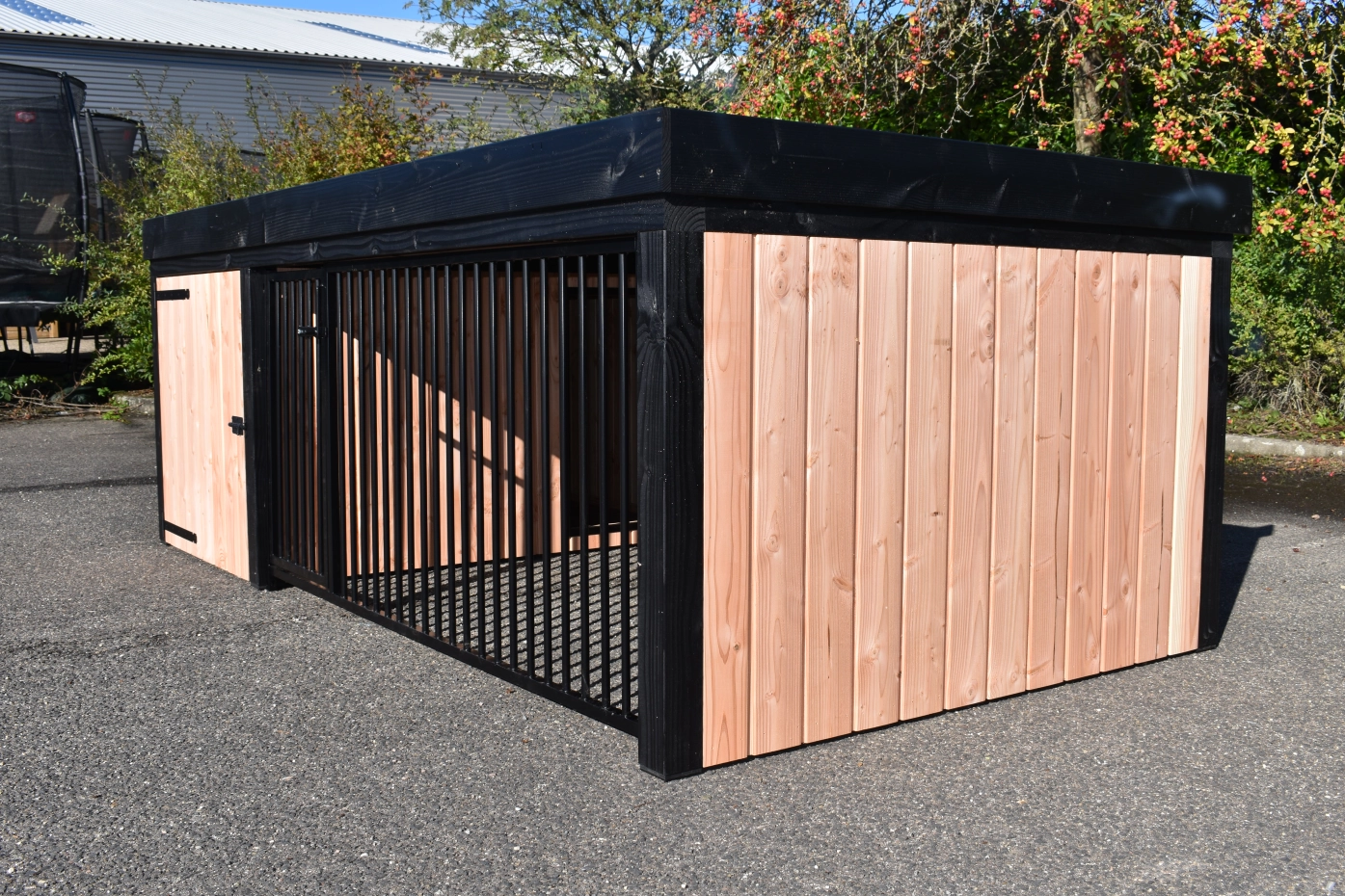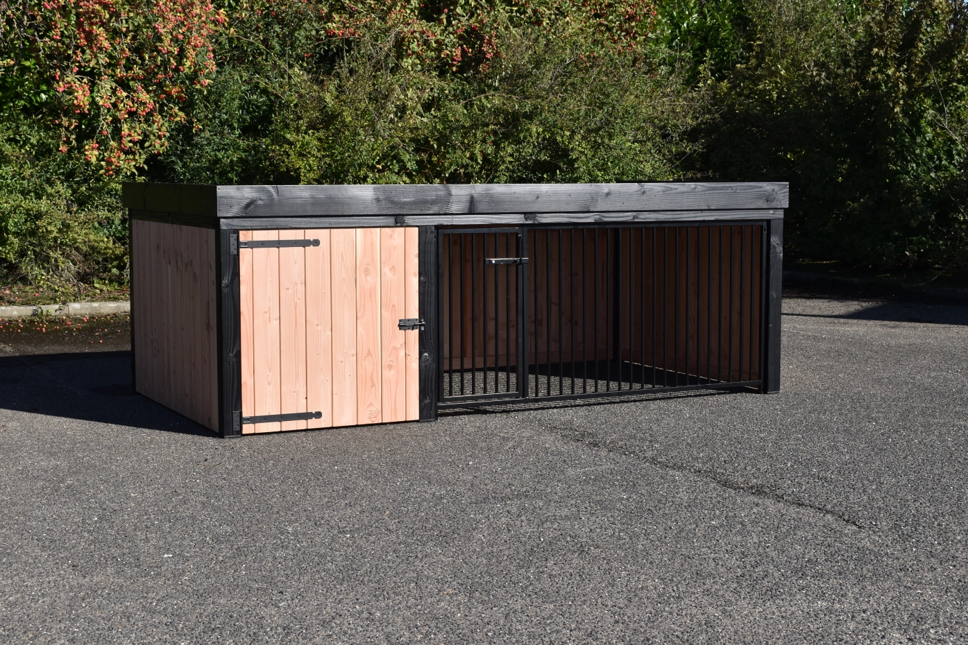 Dog kennel Frenkie, made from Douglas wood, is a beautiful design kennel. Equipped with vertical rabbeted boards and black-painted posts, this kennel has a sleek, modern look. The kennel includes a spacious sleeping area (90x150cm) with a concrete plywood floor. With its flat roof and narrow edge, it has a low profile of just 115 cm high.