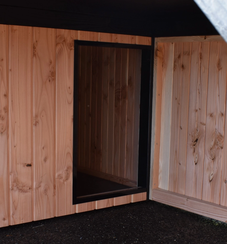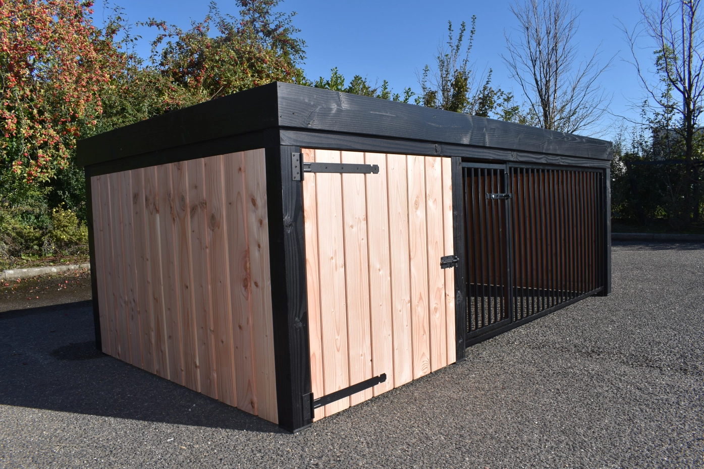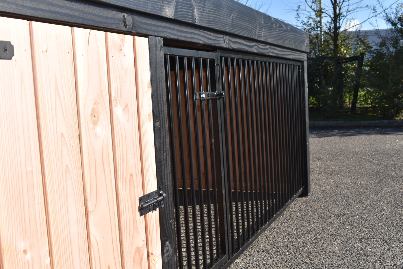 Dog kennel Frenkie, made from Douglas wood, is a beautiful design kennel. Equipped with vertical rabbeted boards and black-painted posts, this kennel has a sleek, modern look. The kennel includes a spacious sleeping area (90x150cm) with a concrete plywood floor. With its flat roof and narrow edge, it has a low profile of just 115 cm high.