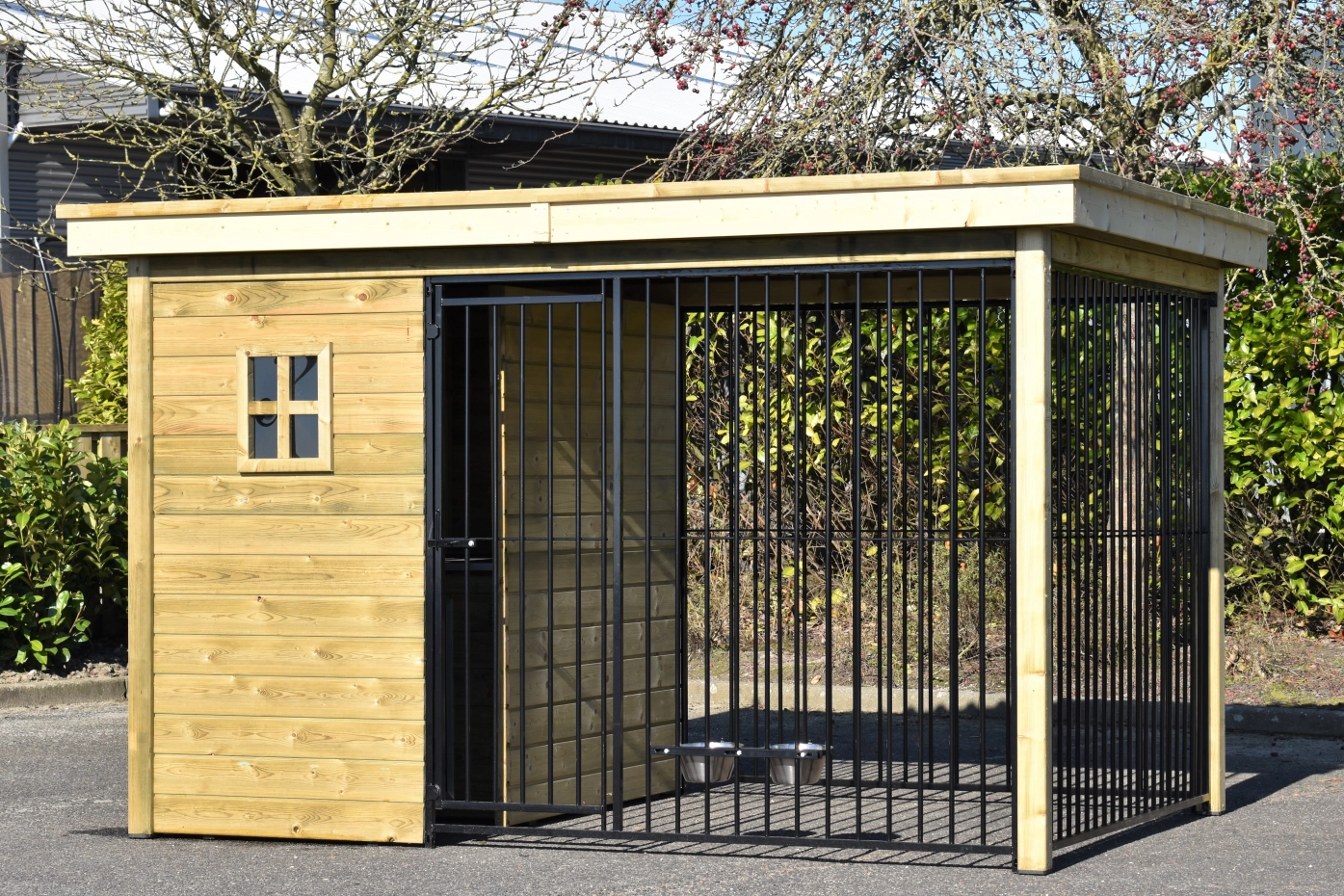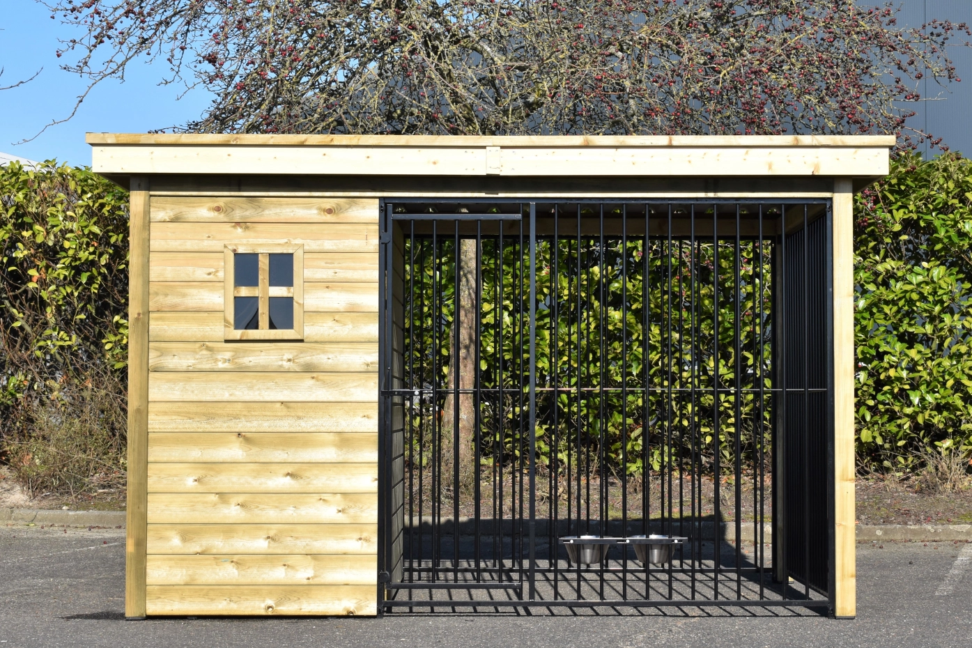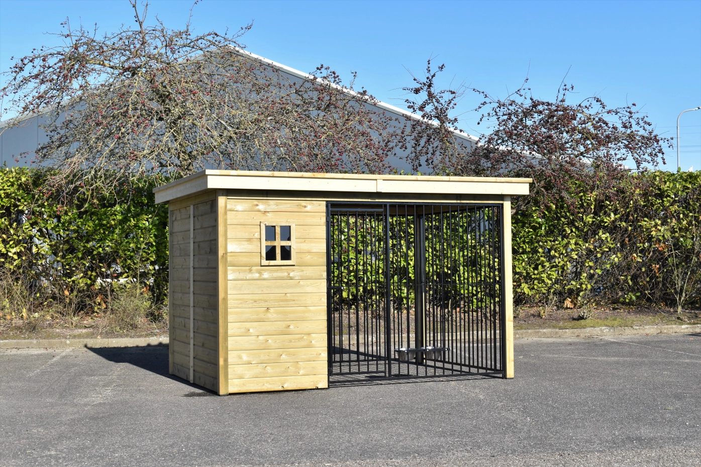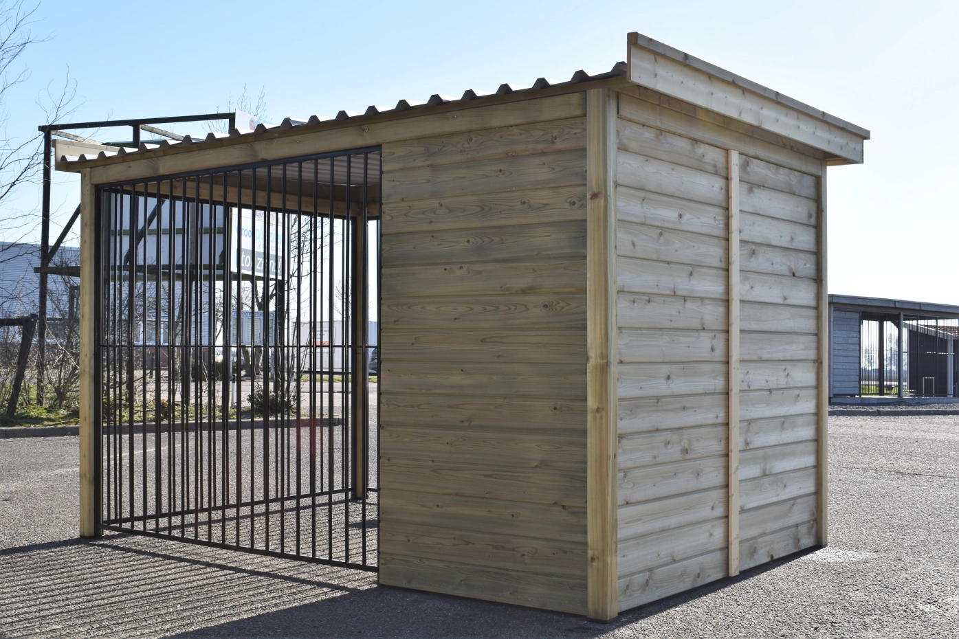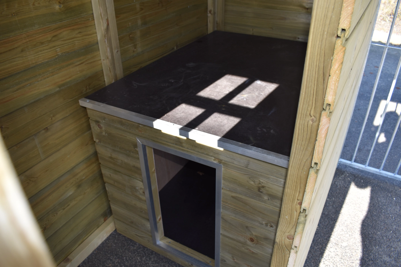 The dog kennel Modul FIX is provided with an insulated sleeping compartment. The walls, floor and roof of the sleeping compartment are insulated. The kennel is made of impregnated wood and has black bar panels. The corrugated sheets are provided with anti-condensation felt and is provided with a luxury wooden edge.