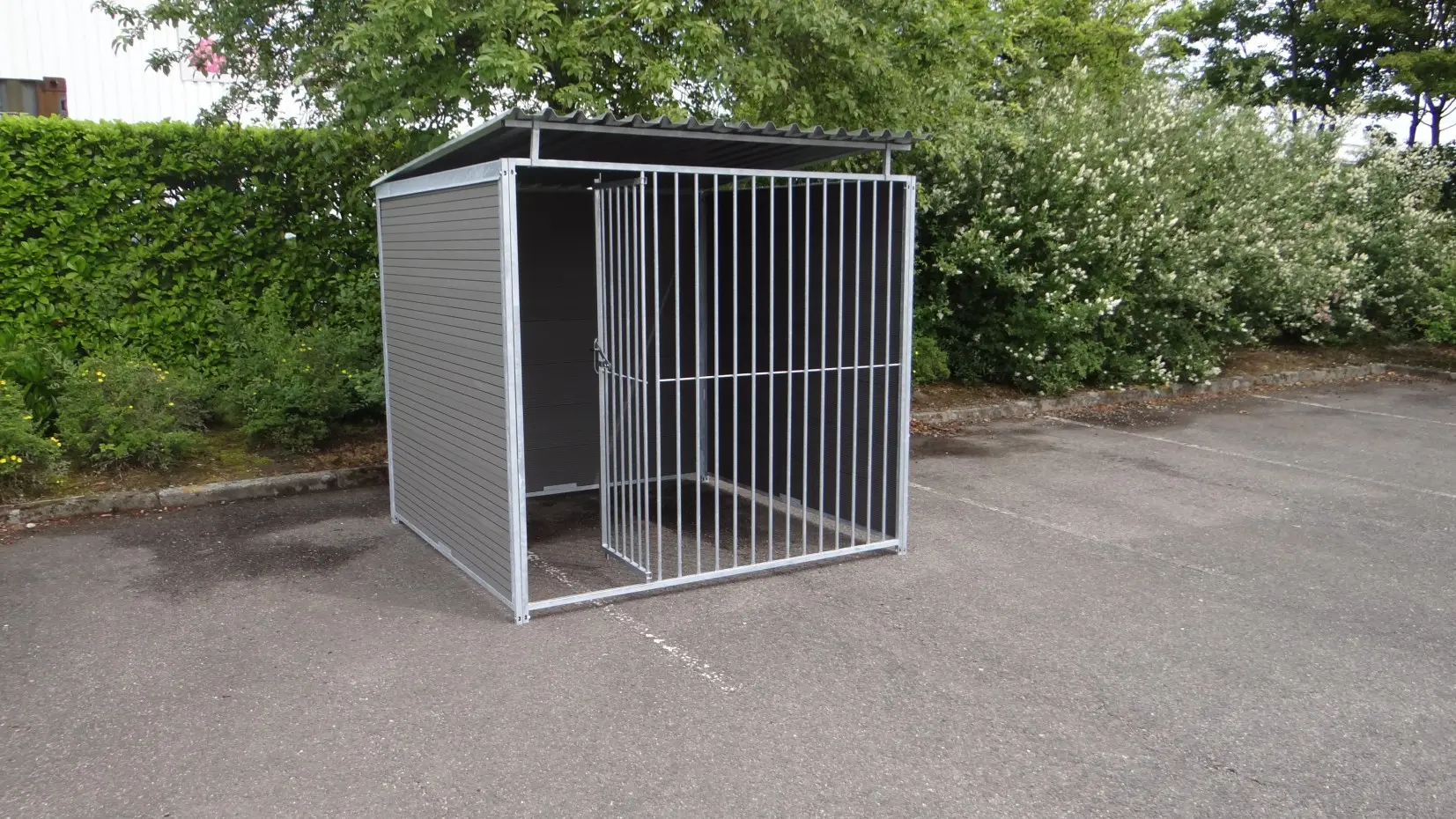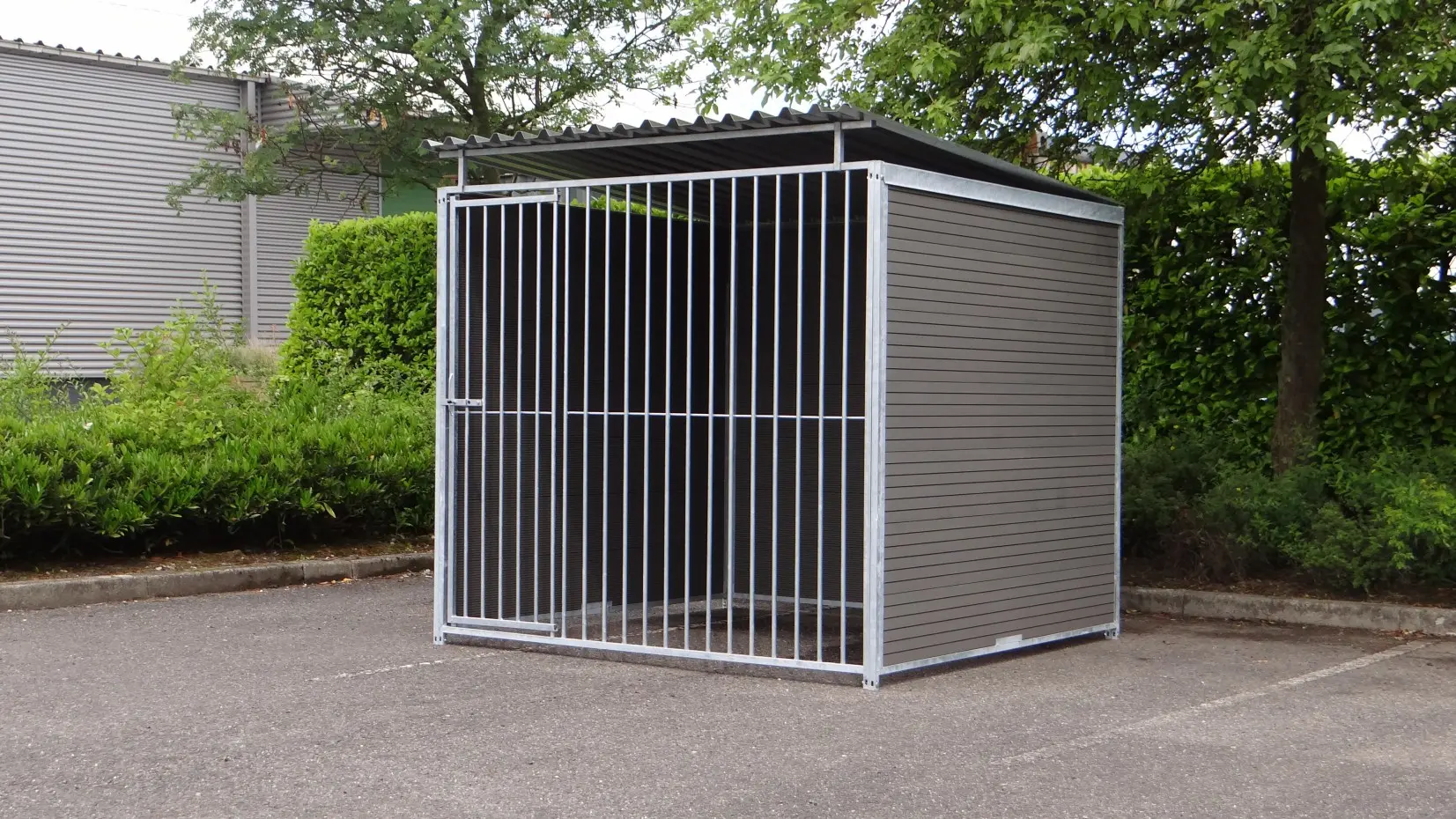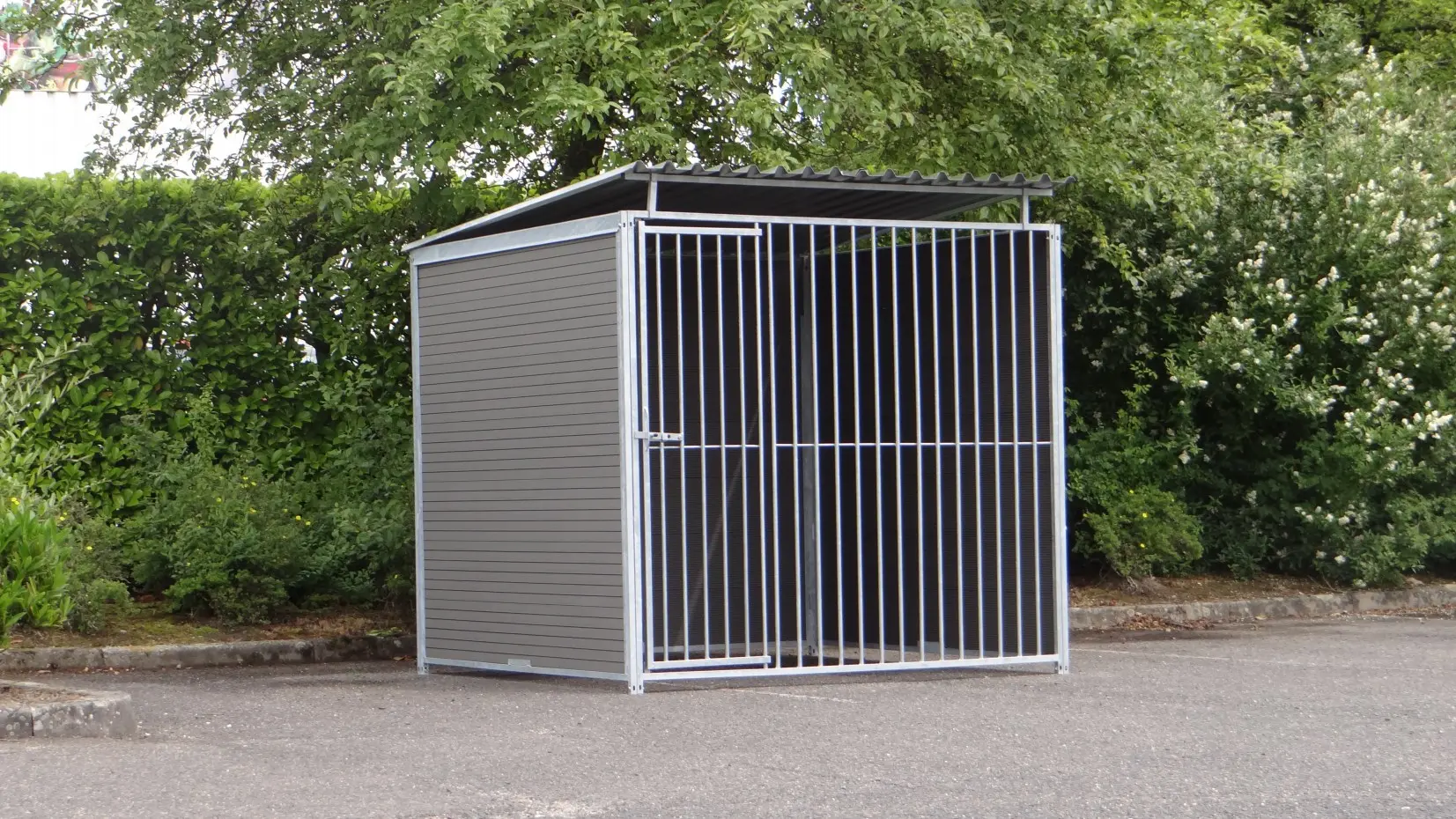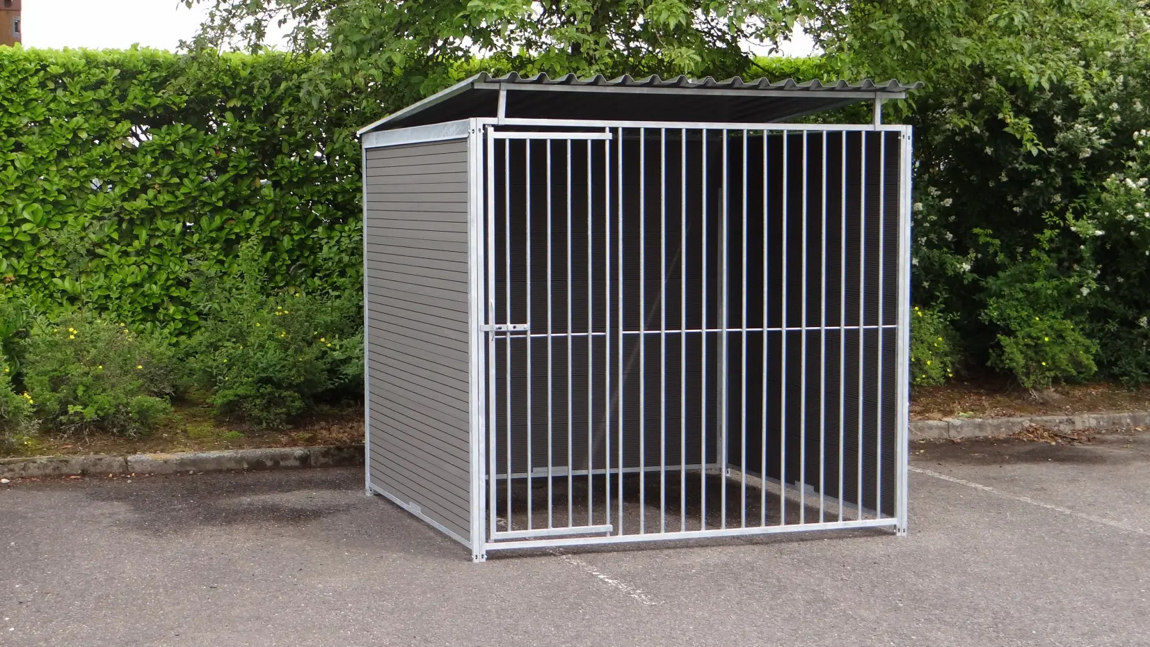 The stabil dog kennel of 2x2 m. is equipped with a roof, 3 closed WPC walls and a door for an optimum accessibility. The kennel is usually available by our own stock.