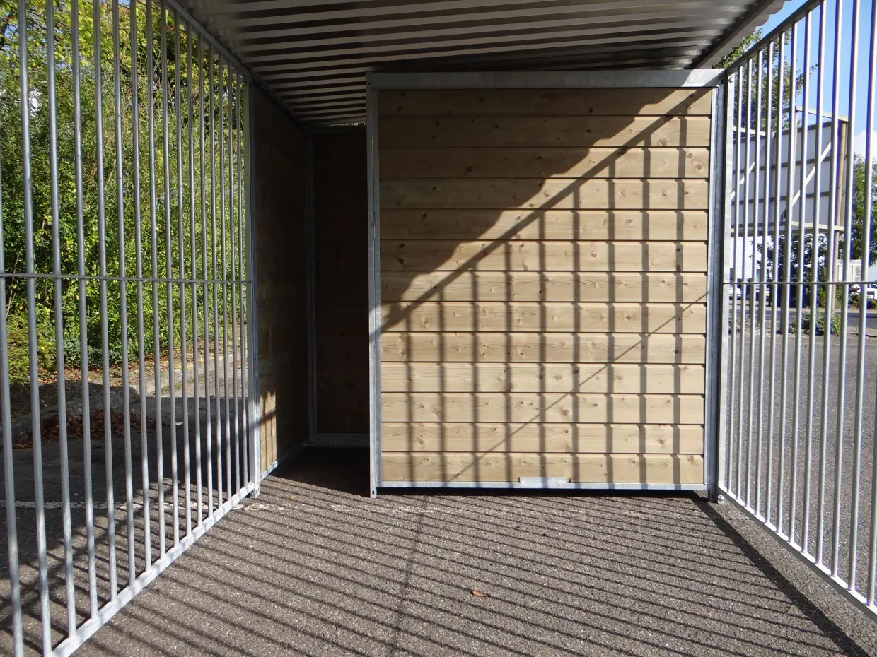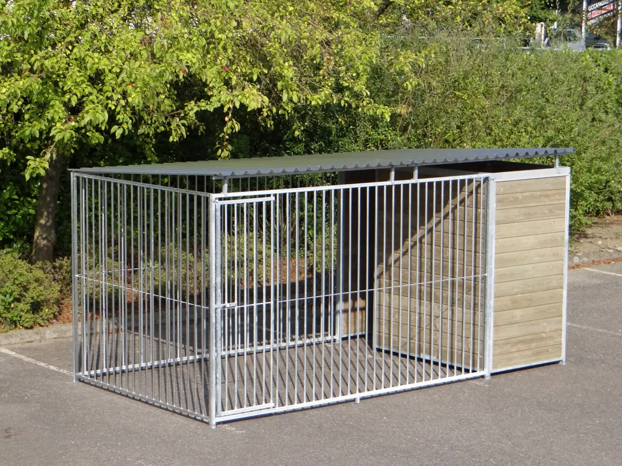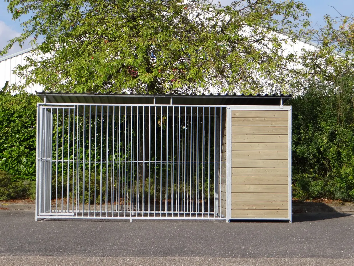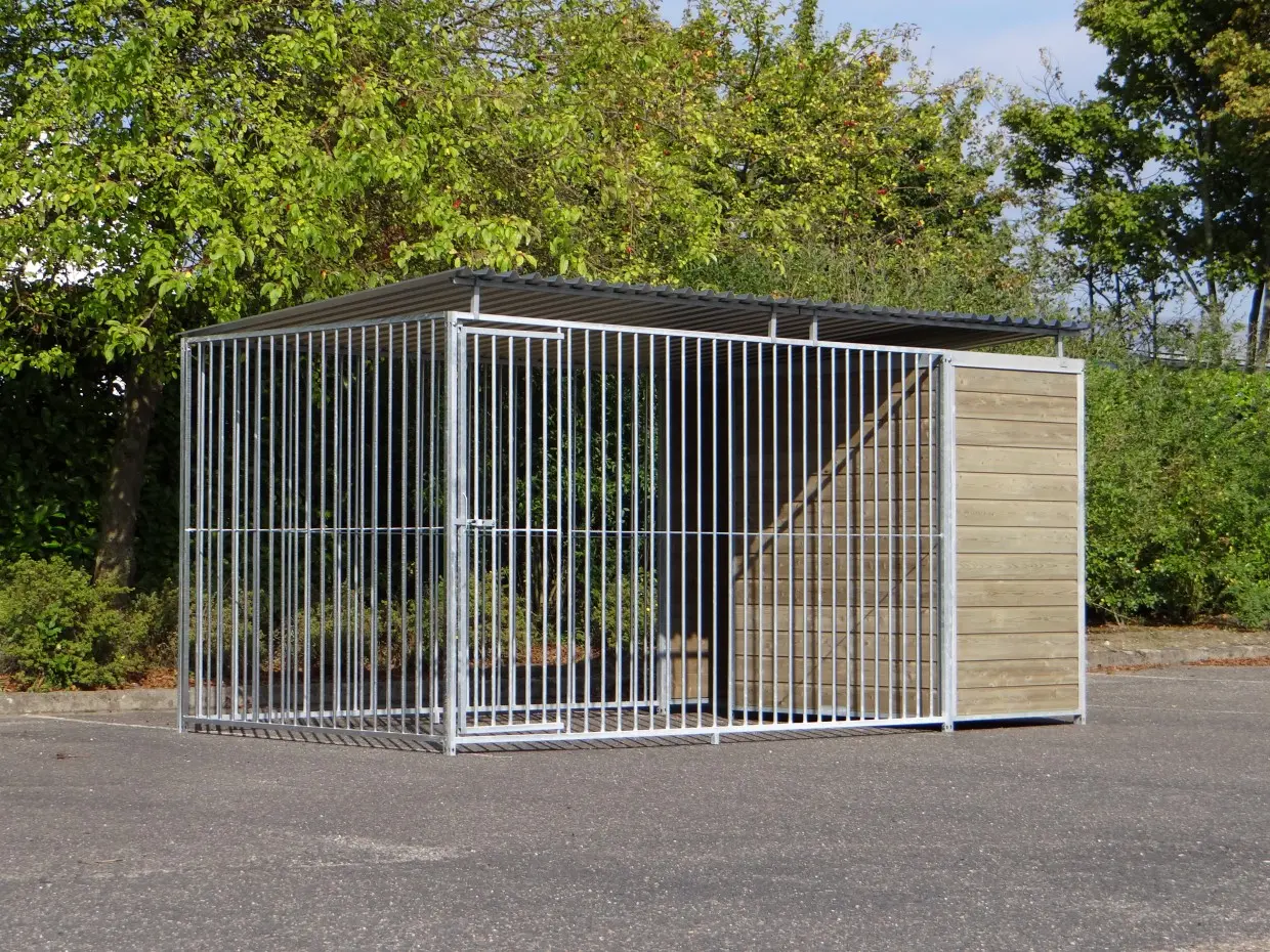 This sturdy galvanized dog kennel is an optimal outdoor shelter for your dog. Equipped with a roof, and 3 closed wooden walls. The dog kennel is 4 x 2 meters and inside features a fine draft fence for a sheltered place for your dog.
