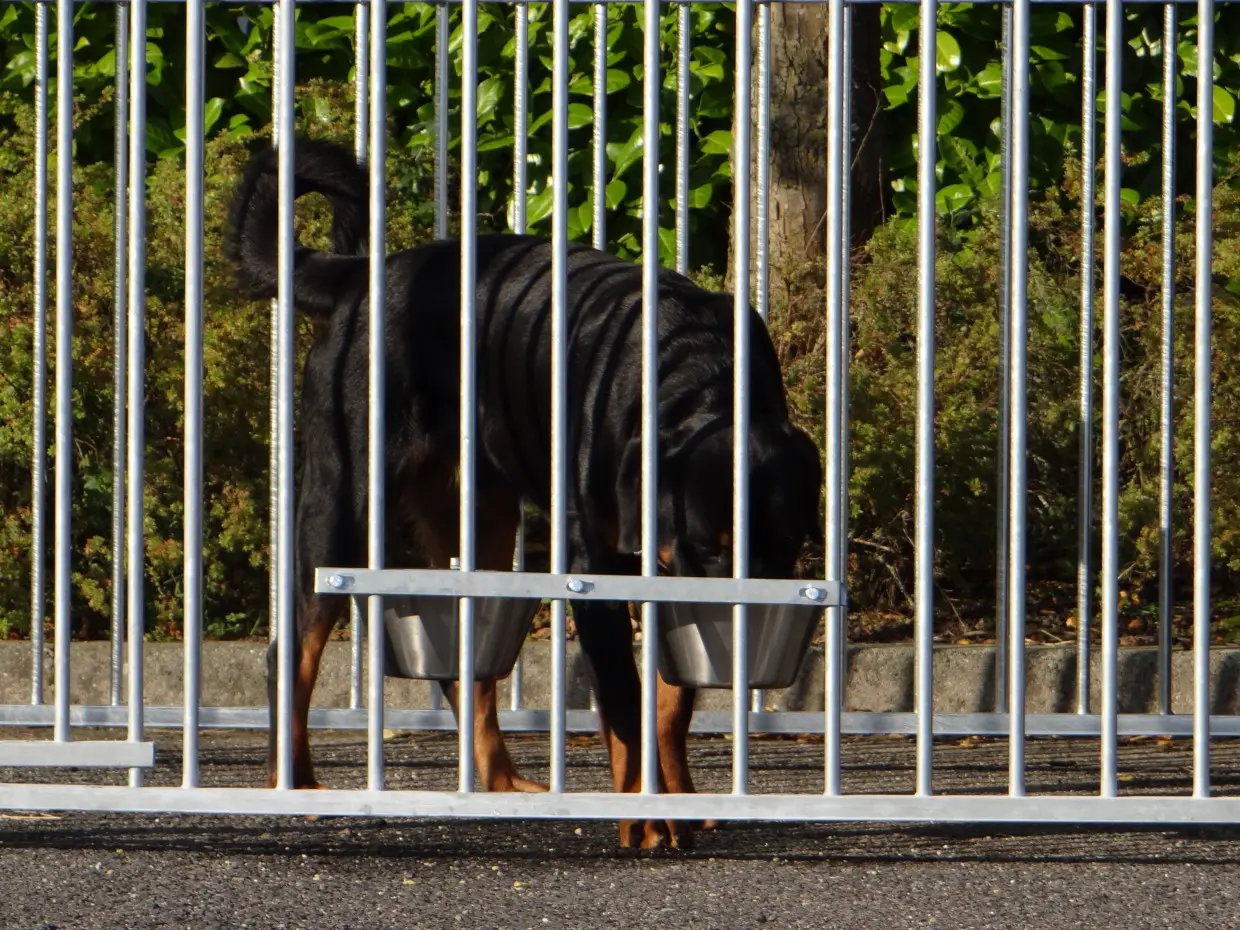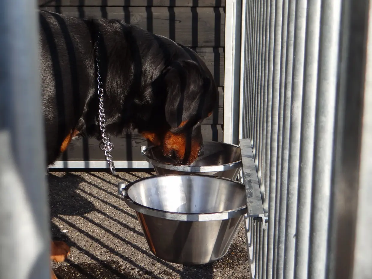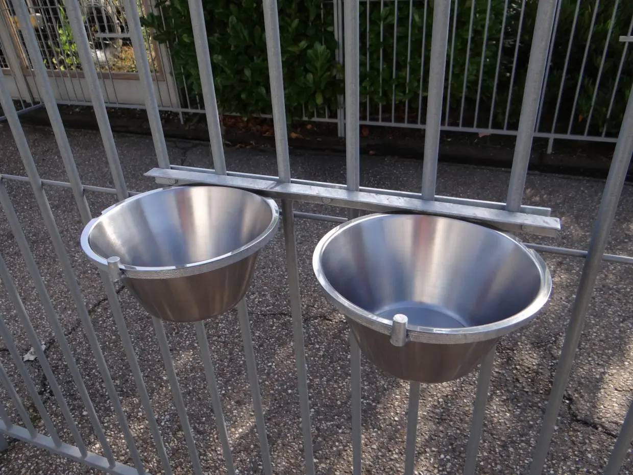 Feeding / drinking bowl to hang on the kennel. This stainless steel feeding bowl has 2 bowls with a capacity of 3 litres and an easy attachment so that your dog cannot push the bowl out. Bucket diameter is approx. 24 cm. Outside dimensions 57x25x12 cm.
