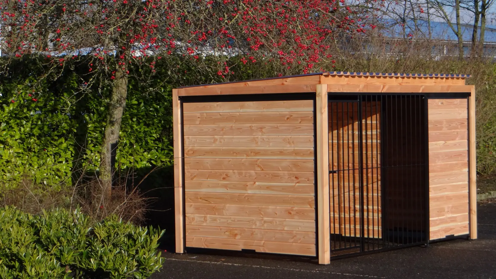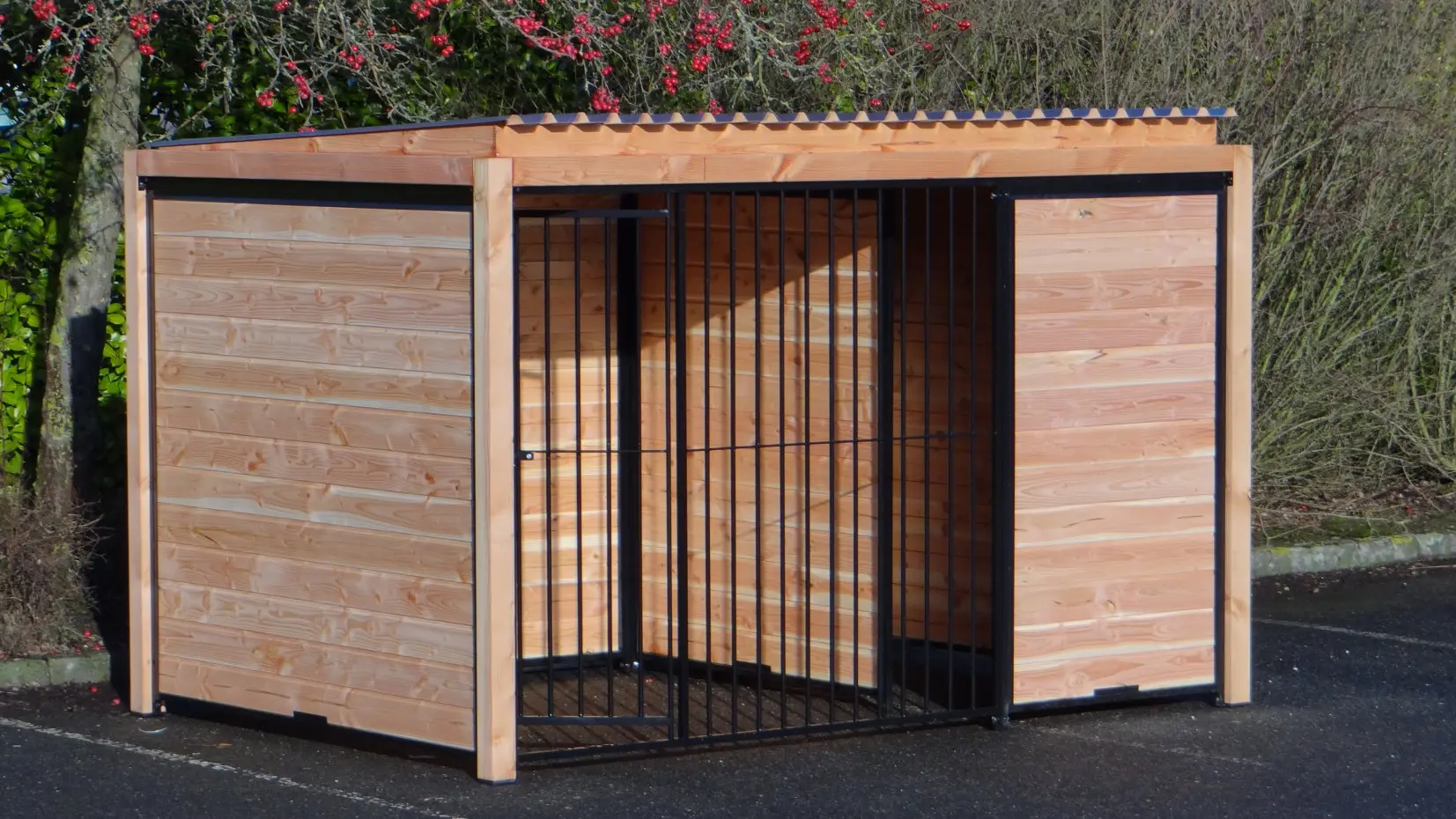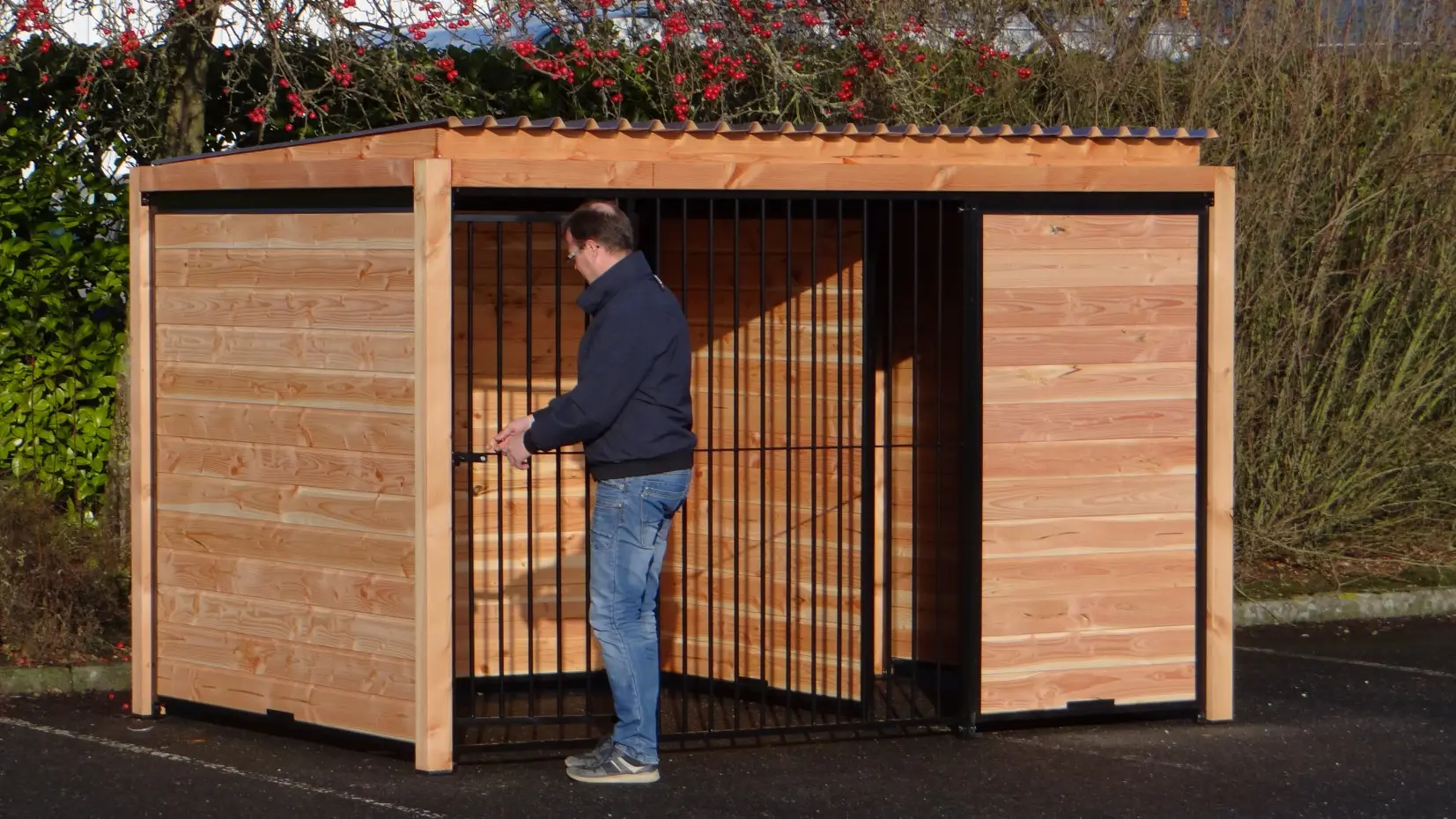 The black Forz dog kennel with roof and Douglas wood frame is a beautiful kennel that offers optimal protection for your dog all around. All walls are made of steel frames filled with Douglas wood. Behind the partition panel, you can perfectly place a dog house such as the Easy dog house, or install a wooden deck to create a sheltered spot for your dog.