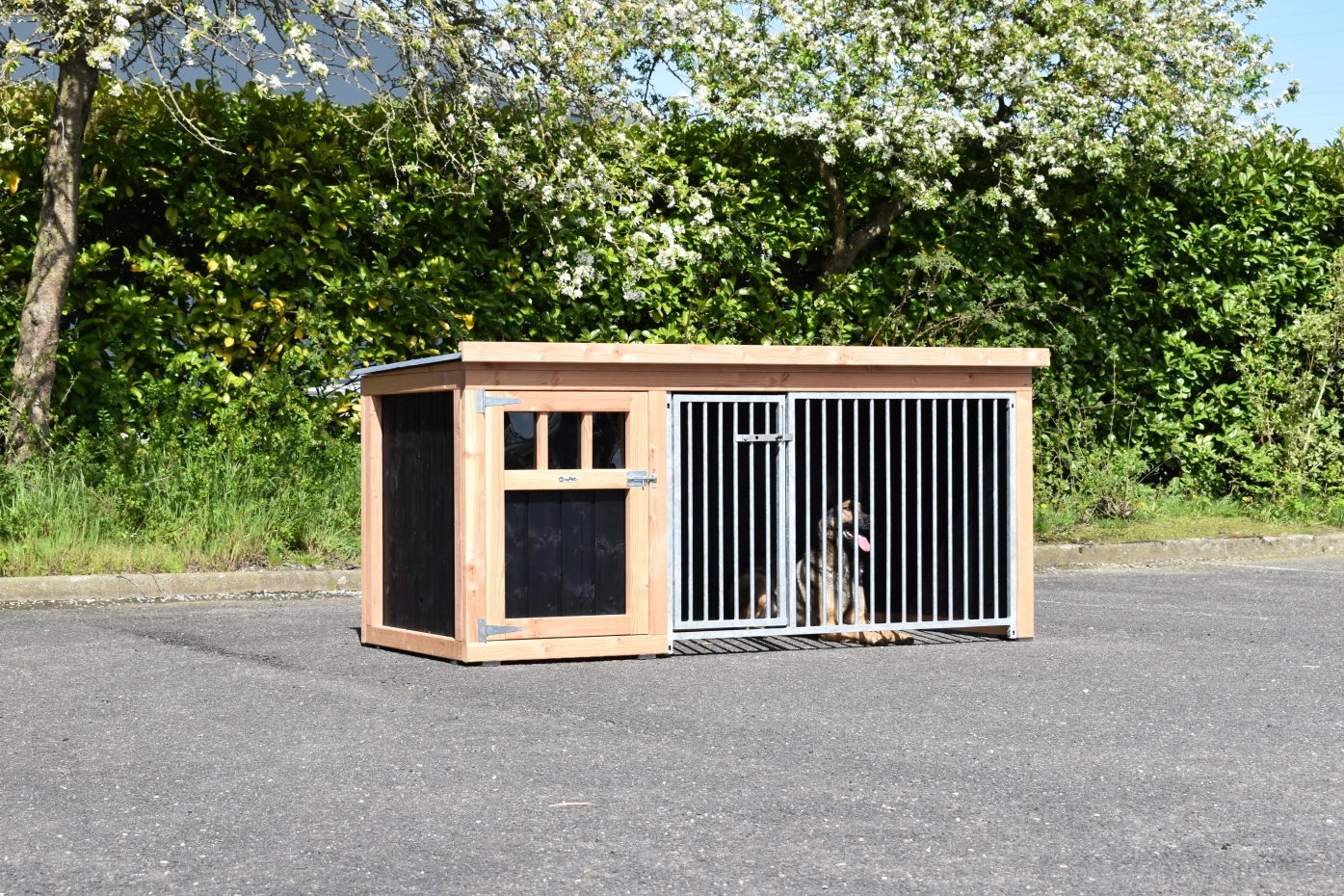 Dog kennel Isabelle 1 is suitable for medium till large dogs. The sleeping compartment has a closed wooden floor and has a large door. The Isabelle 1 is provided with a few closed wooden panels and 1 bar panel. It offers a nice place for your dog.