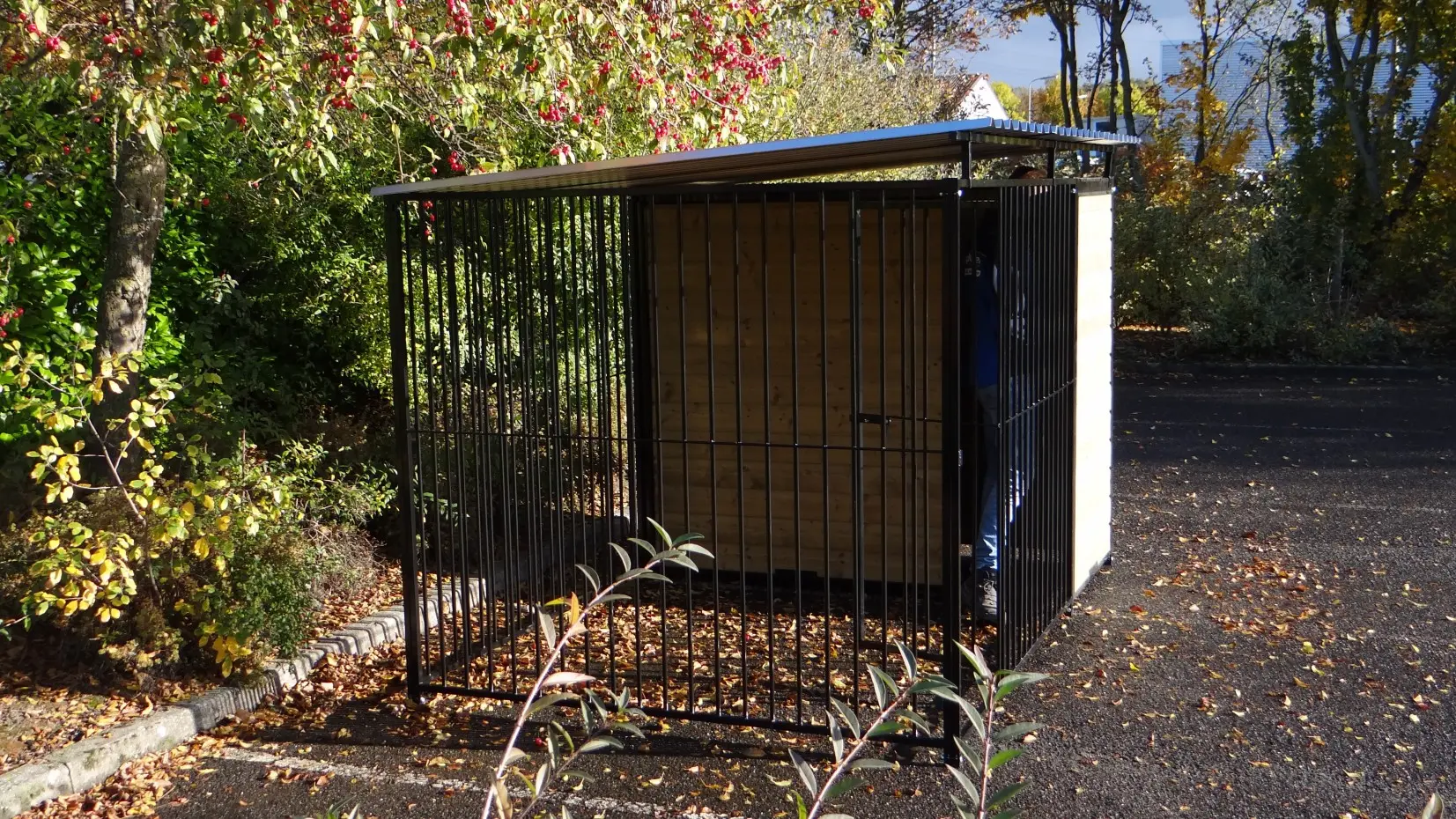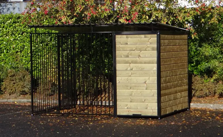 This strong, black powdercoated dog kennel is a wonderful dog kennel for your dog. Equipped with a roof and wooden walls. The kennel is 3 x 2 meter and the kennel has a windwall for an optimal protection for your dog.