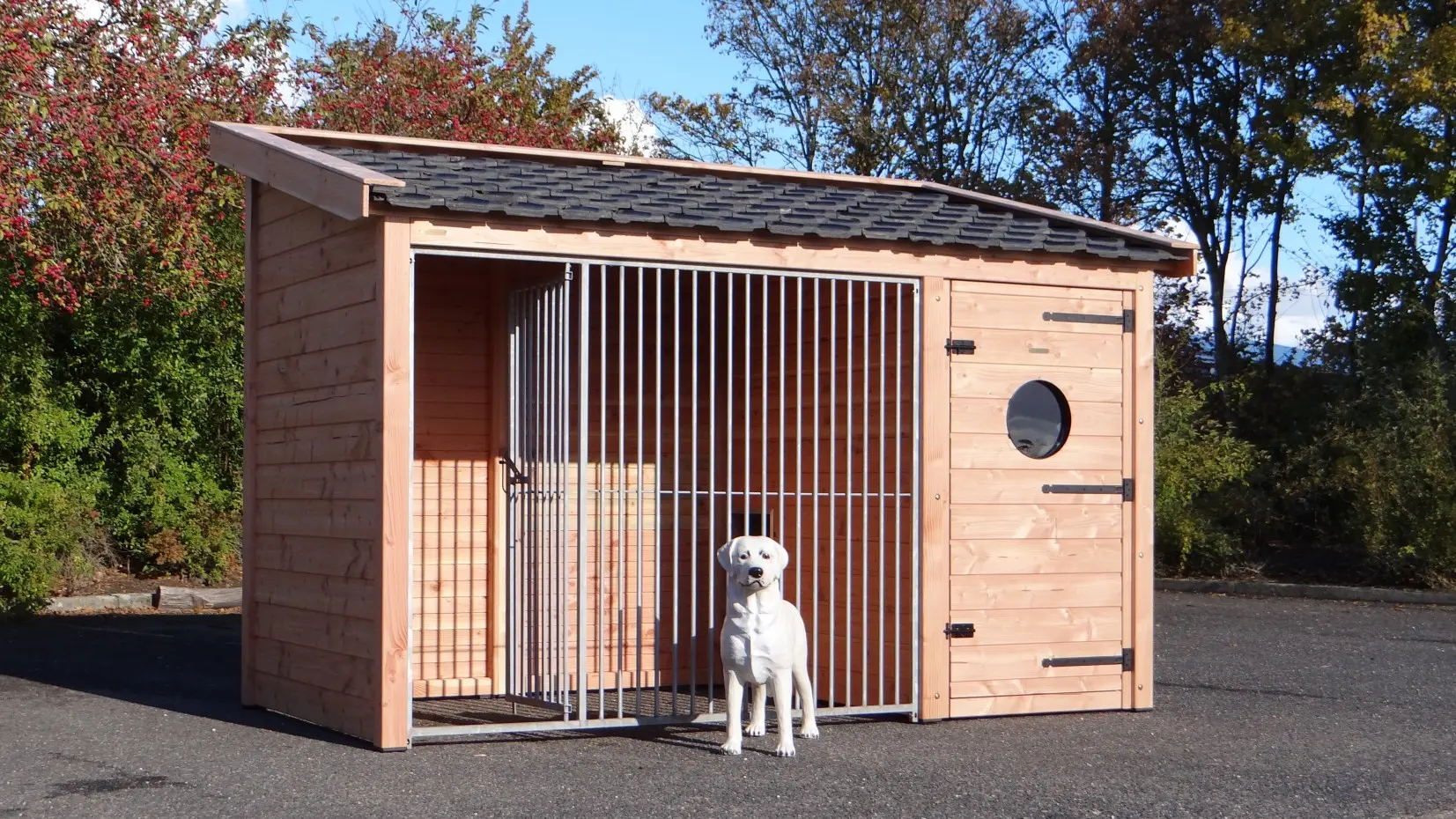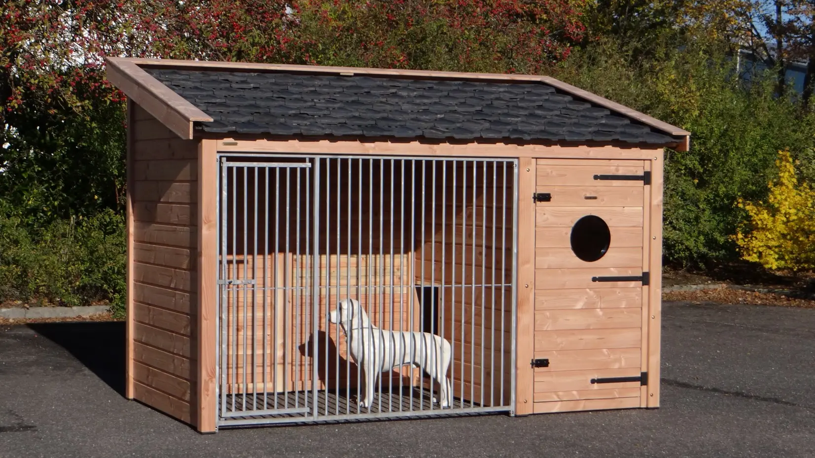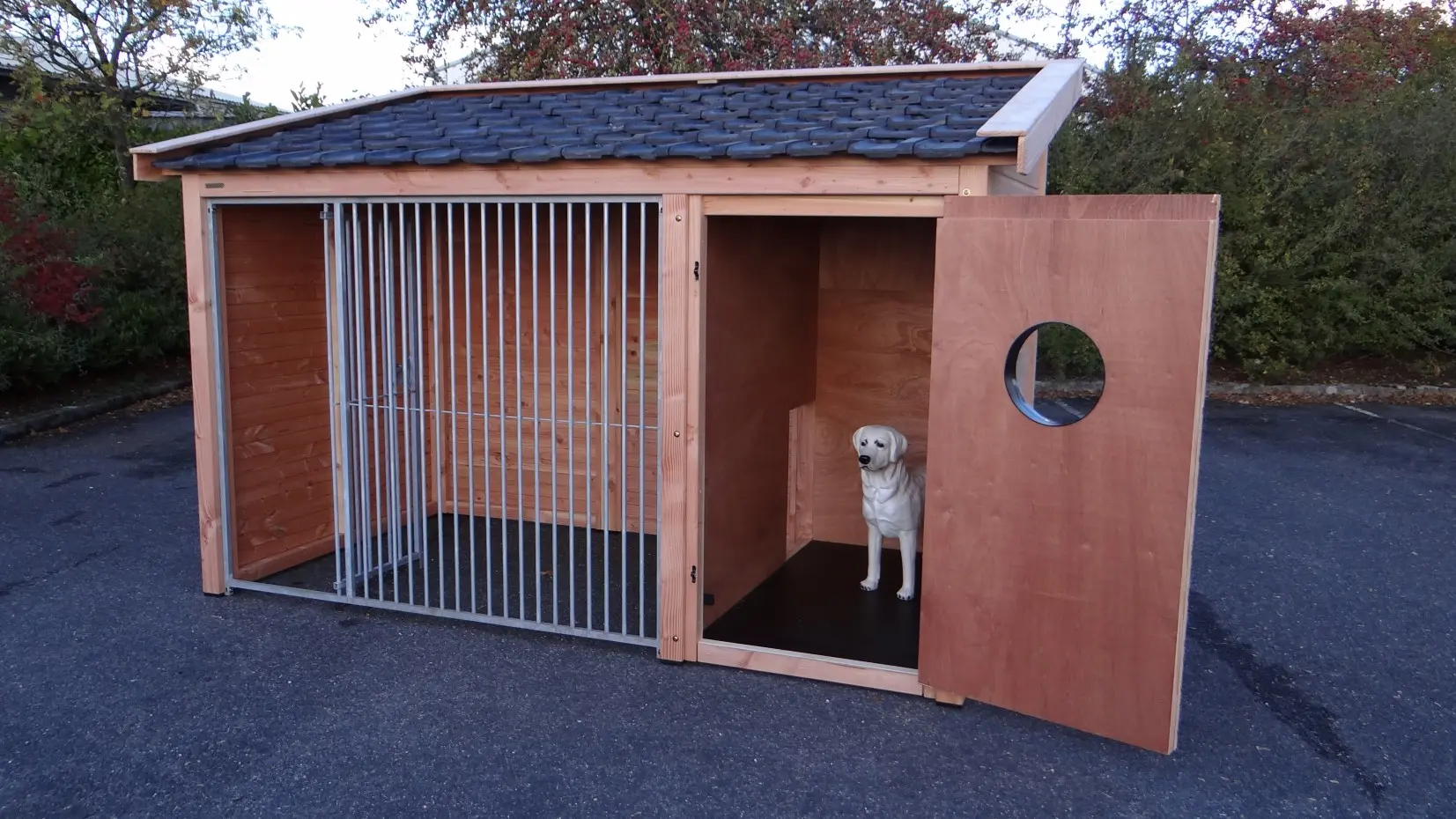 Dog kennel Max 1 is made of Douglaswood and has a large insulated sleeping compartment. The run and the sleeping compartment have both large doors. The roof is provided with used roof tiles. This kennel offers a great solution to keep your dog outside during the whole year. The maximal dimensions are 341x182x240cm.