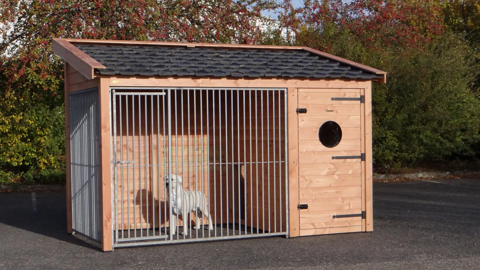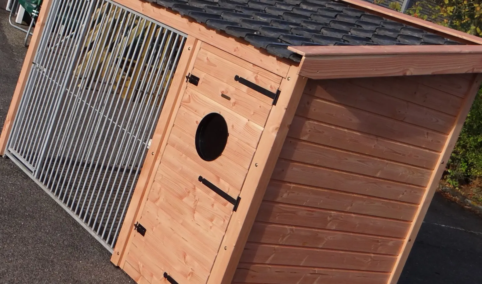 - This doghouse is equipped with used ceramic roof tiles.