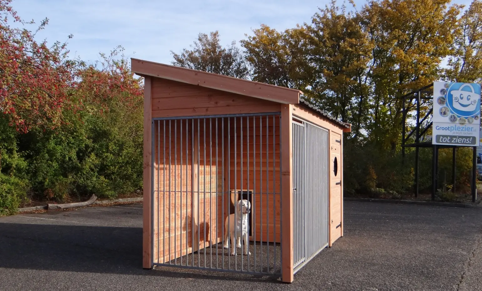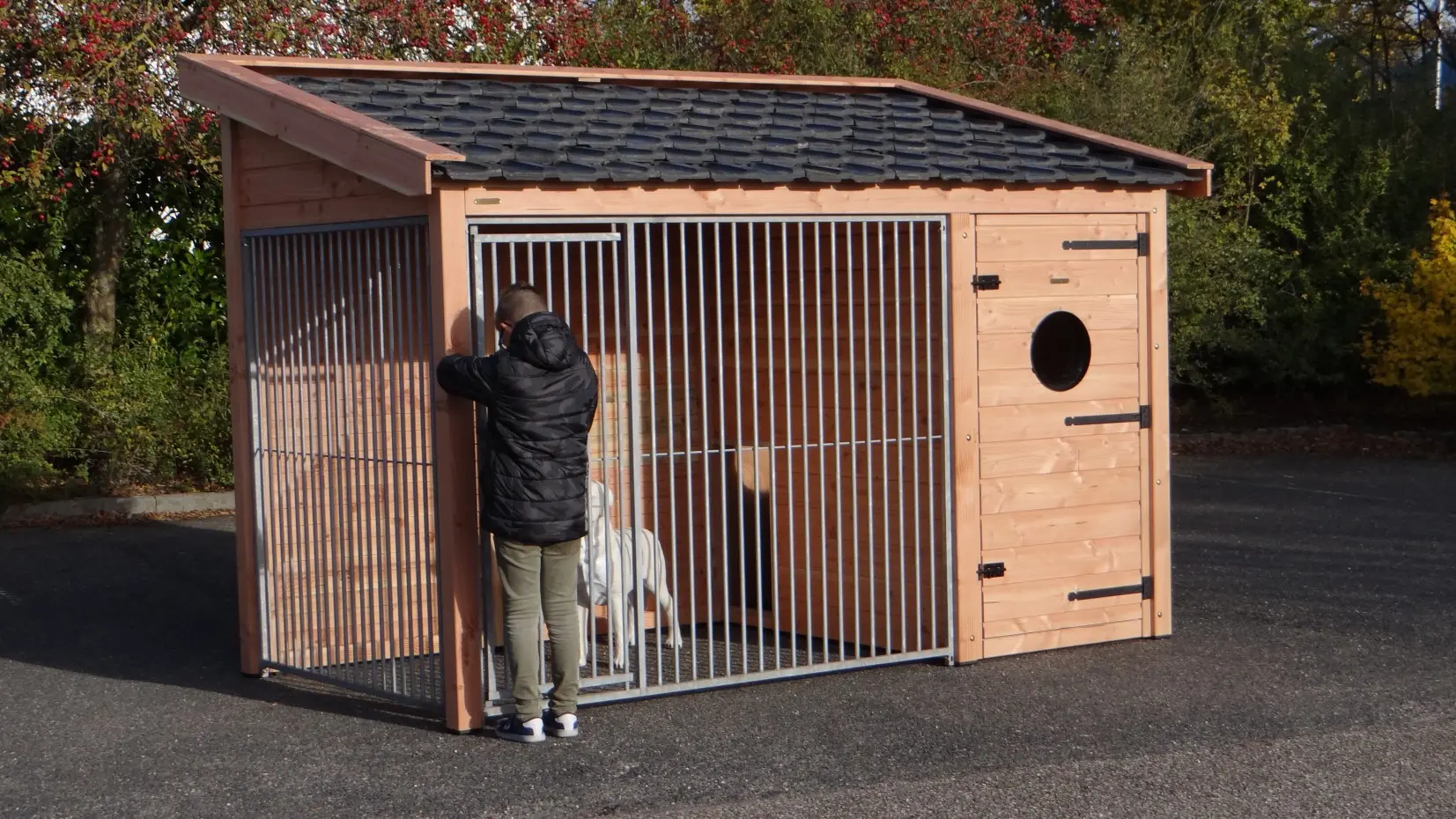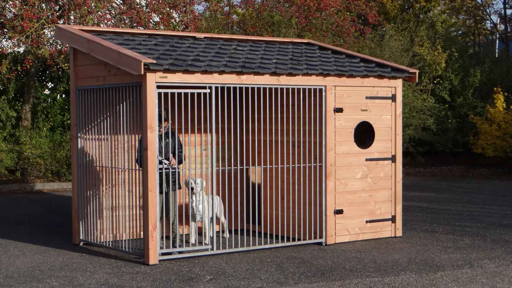 Dog kennel Max 2 is made of Douglaswood and has a large insulated sleeping compartment. The run and the sleeping compartment have both large doors. The roof is provided with used roof tiles. This kennel offers a great solution to keep your dog outside during the whole year. The maximal dimensions are 341x182x240cm.