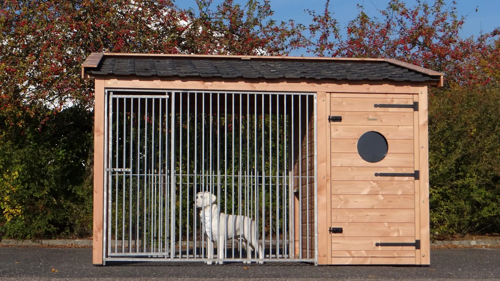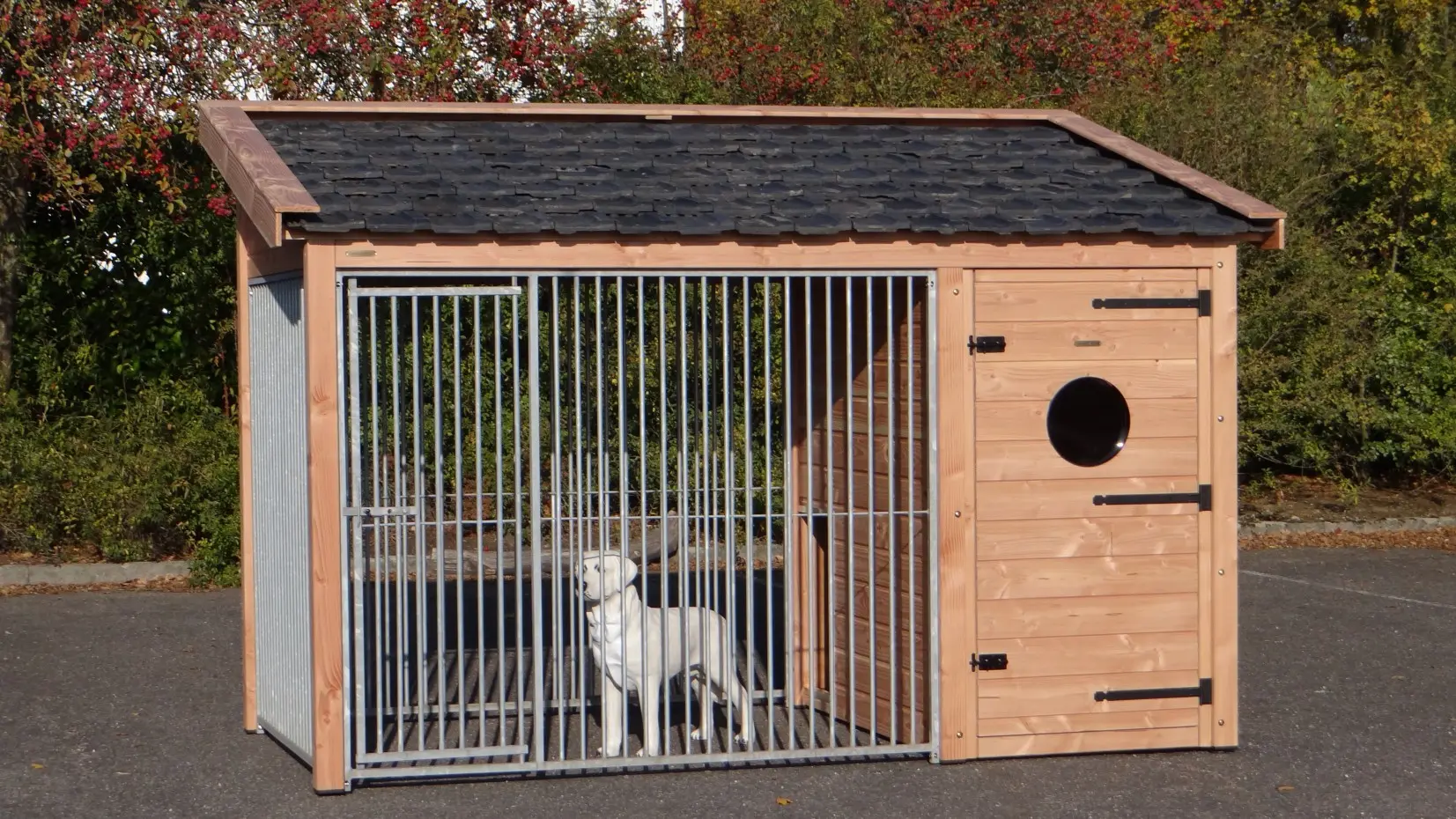 Dog kennel Max 3 is made of Douglaswood and has a large insulated sleeping compartment. The run and the sleeping compartment have both large doors. The roof is provided with used roof tiles. This kennel offers a great solution to keep your dog outside during the whole year. The maximal dimensions are 341x182x240cm.