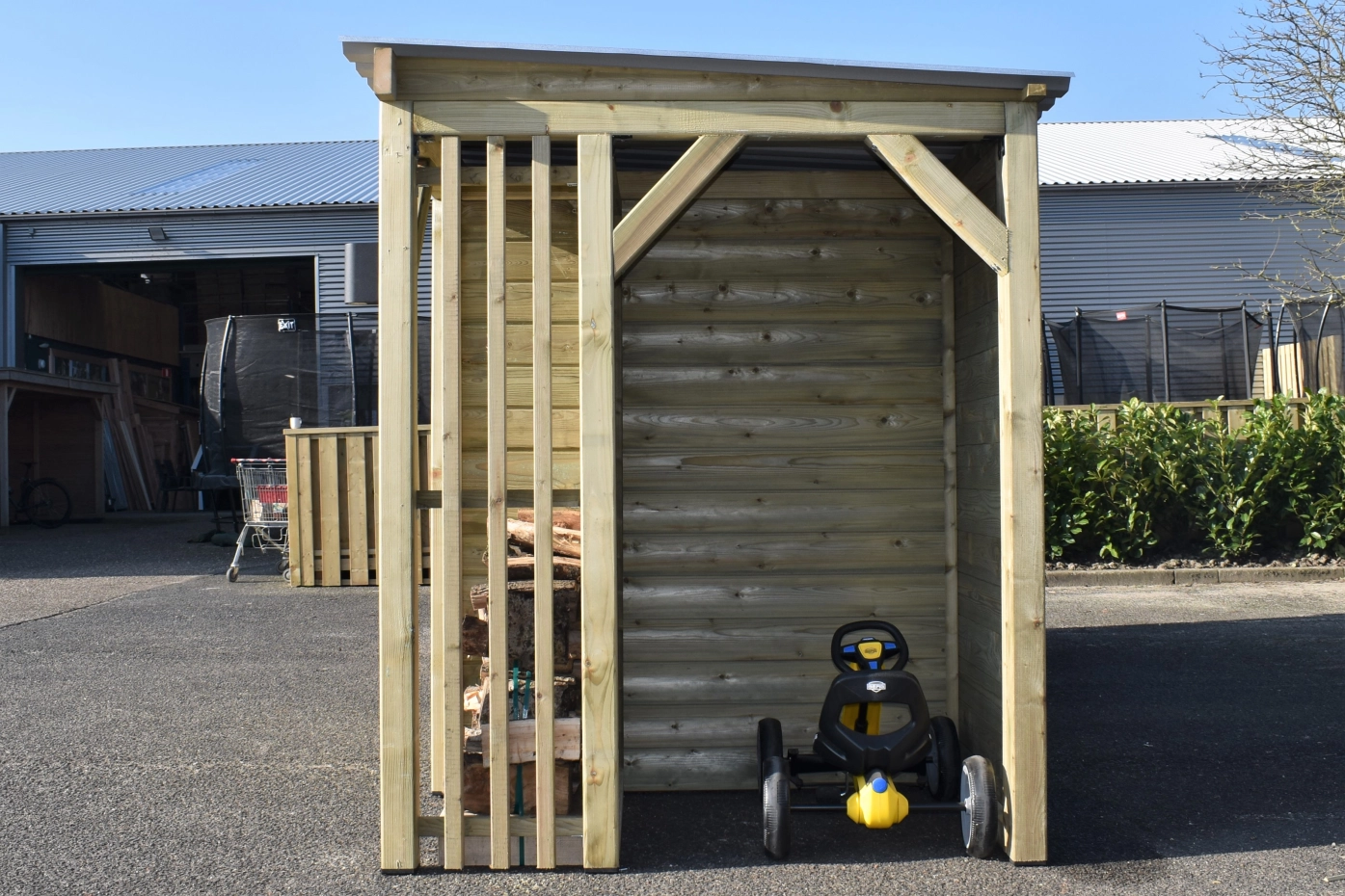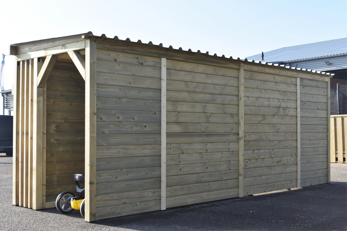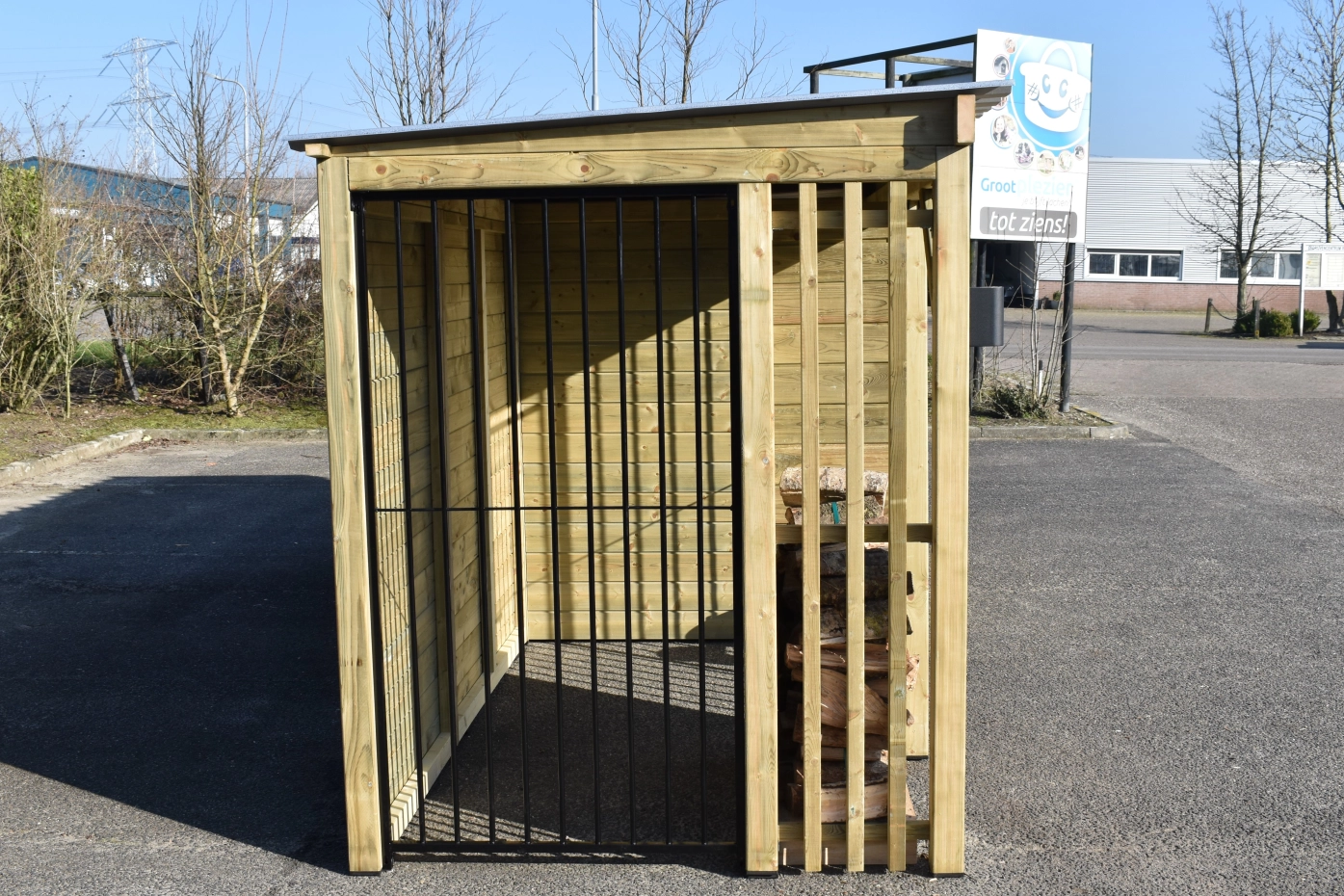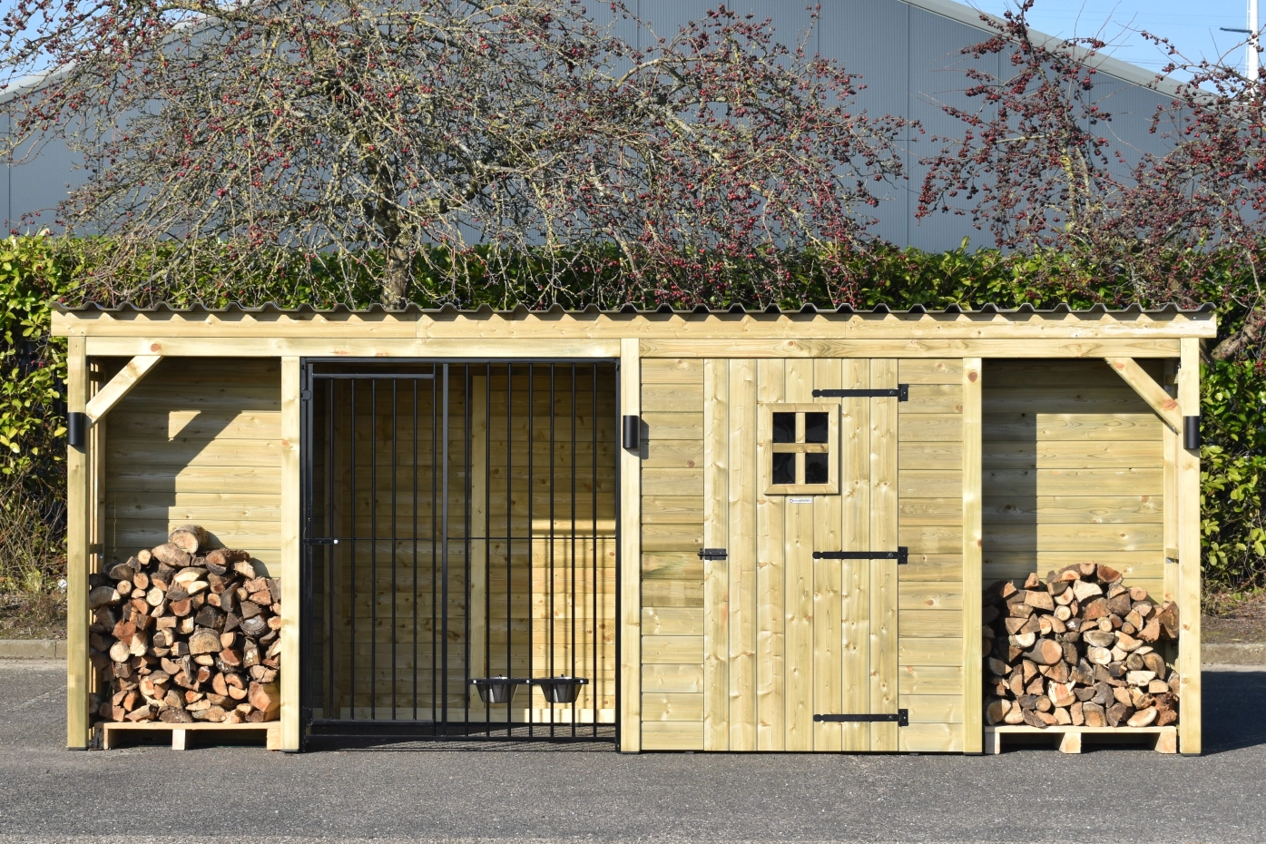 Dog kennel Modul COMBI has a canopy, 2 fire wood compartments and a storage room. This hutch has 5 different compartments, all under 1 roof! This hutch is made of impregnated wood, so that it has a long life endurance. After a while, the wood will turn grey. The corrugated sheets are provided with anti-condensation felt. You can easily adapt the chenil after your own wishes! Beautiful dog kennel for a nice price!