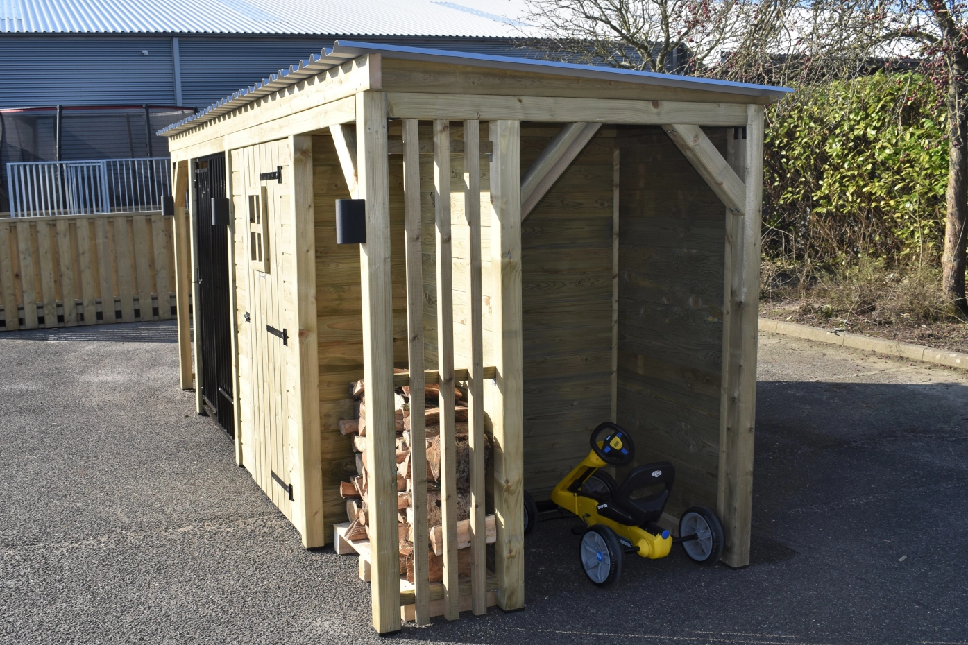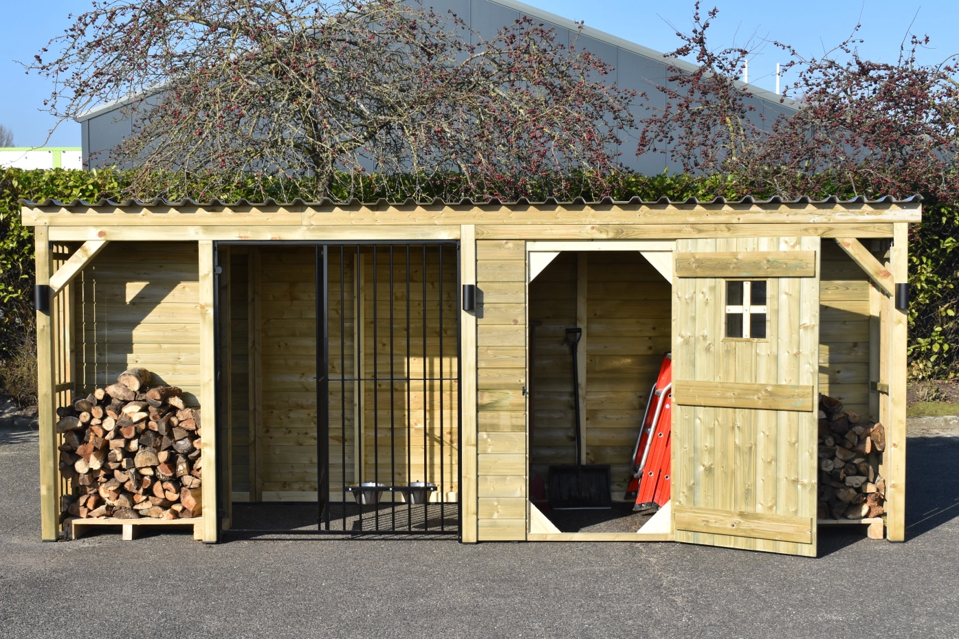 Dog kennel Modul COMBI with storage room, canopy and 2 fire wood compartments