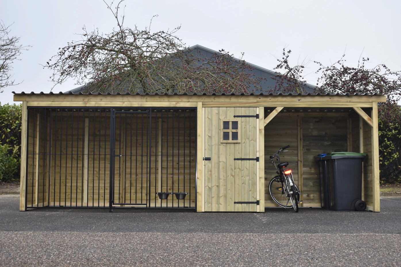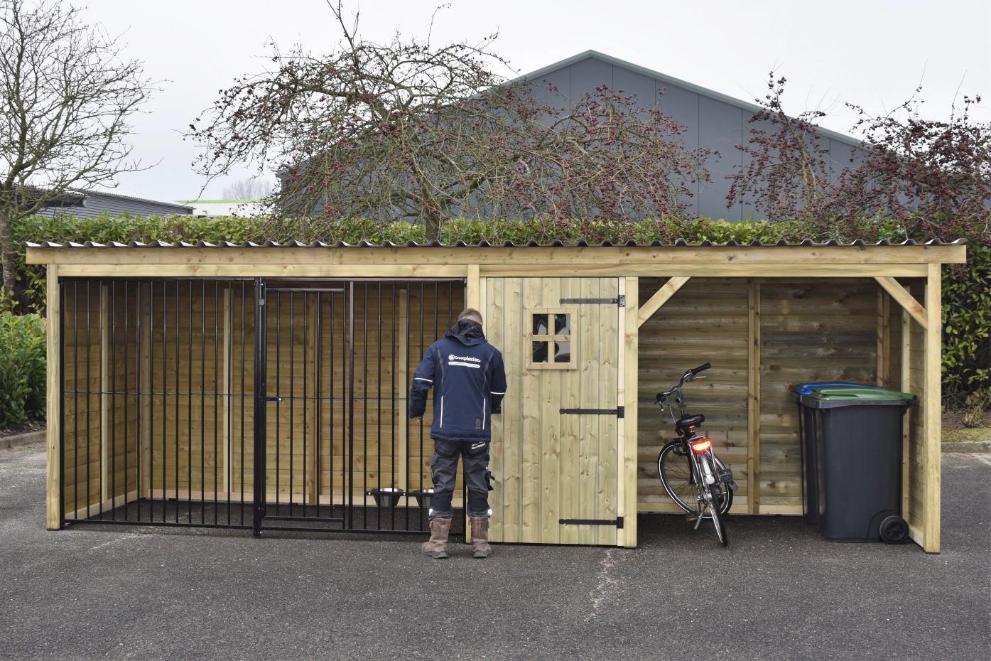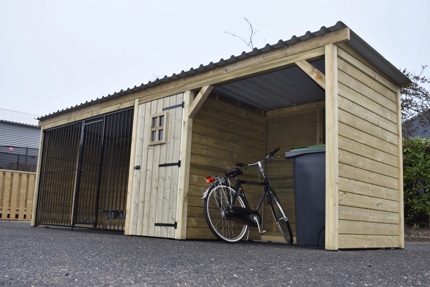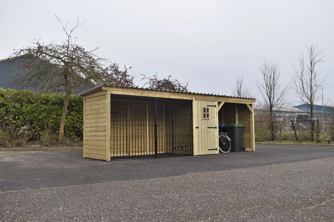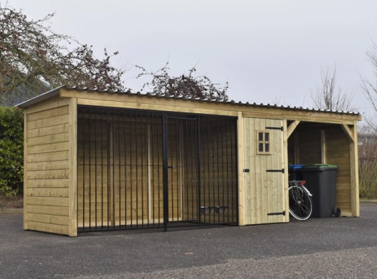 Kennel made of impregnated pinewood with a wooden frame. Luxury spacious run measuring 1.5x3 metres. In addition, a storage area with luxury door. Then a shelter, all under one roof! As the kennel is not very deep, it does not take up too much space and can easily stand in the length of the garden. the wood is durable and will last at least 10-15 years. The kennel panels are provided with a black powder coating, so all in all a solid kennel for a nice price! The roof panels are made of steel and have a felt layer on the underside, which prevents condensation and dampens rain.