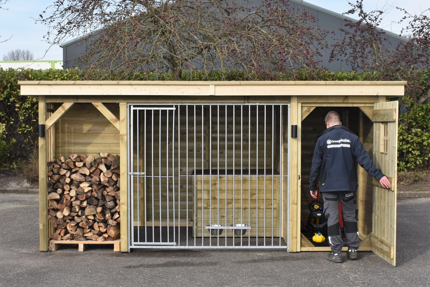 This beautiful kennel with a triple function is highly recommended! Beautifully and symmetrically built with luxurious details. The kennel features a dog run of 3 x 2 metres, of which 1 x 0.5 metres consists of a wooden panel section. Visually, this creates a playful look and also provides the dog with extra shelter.