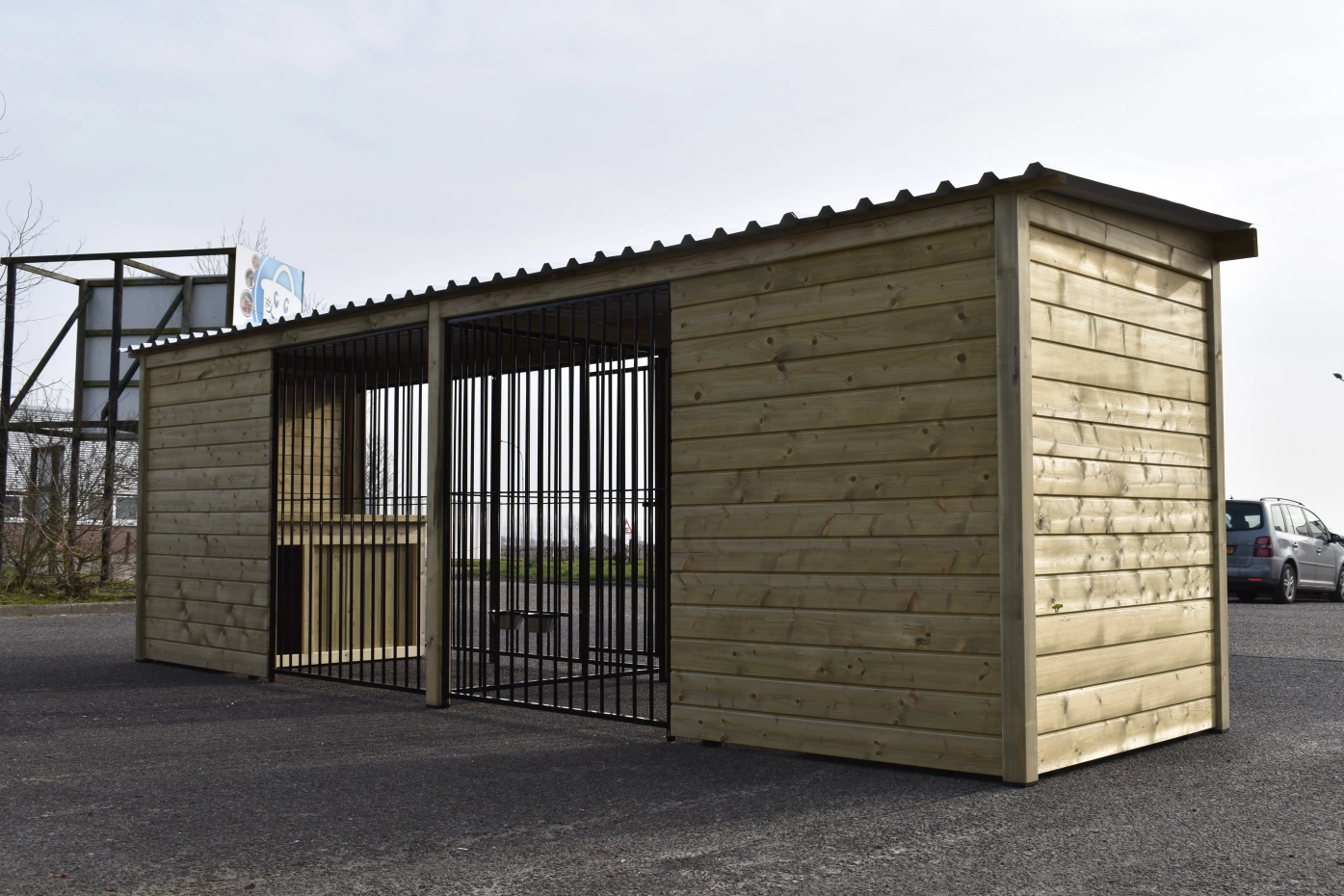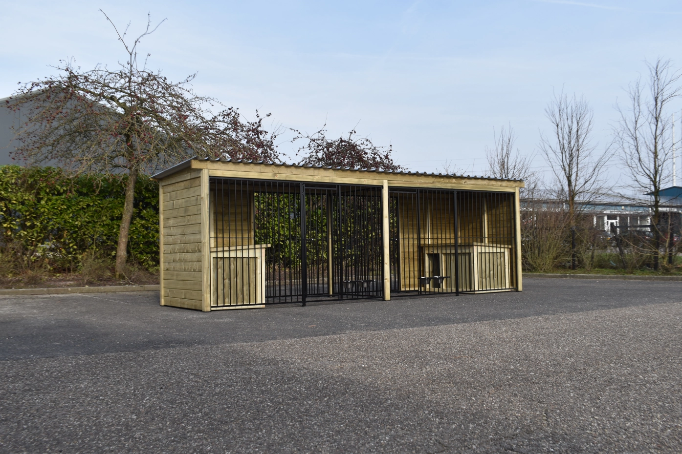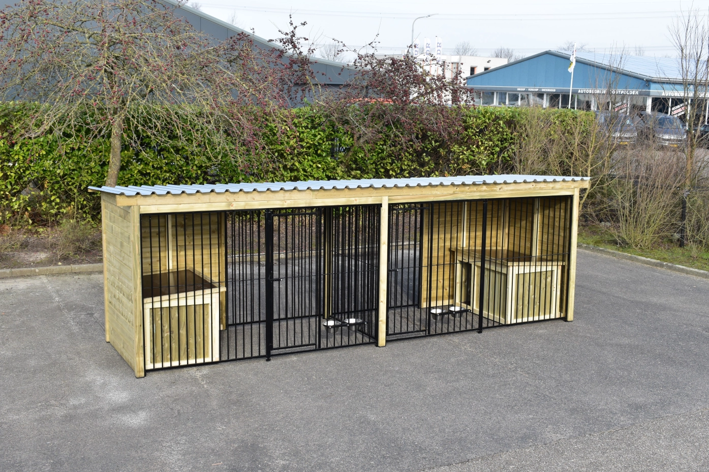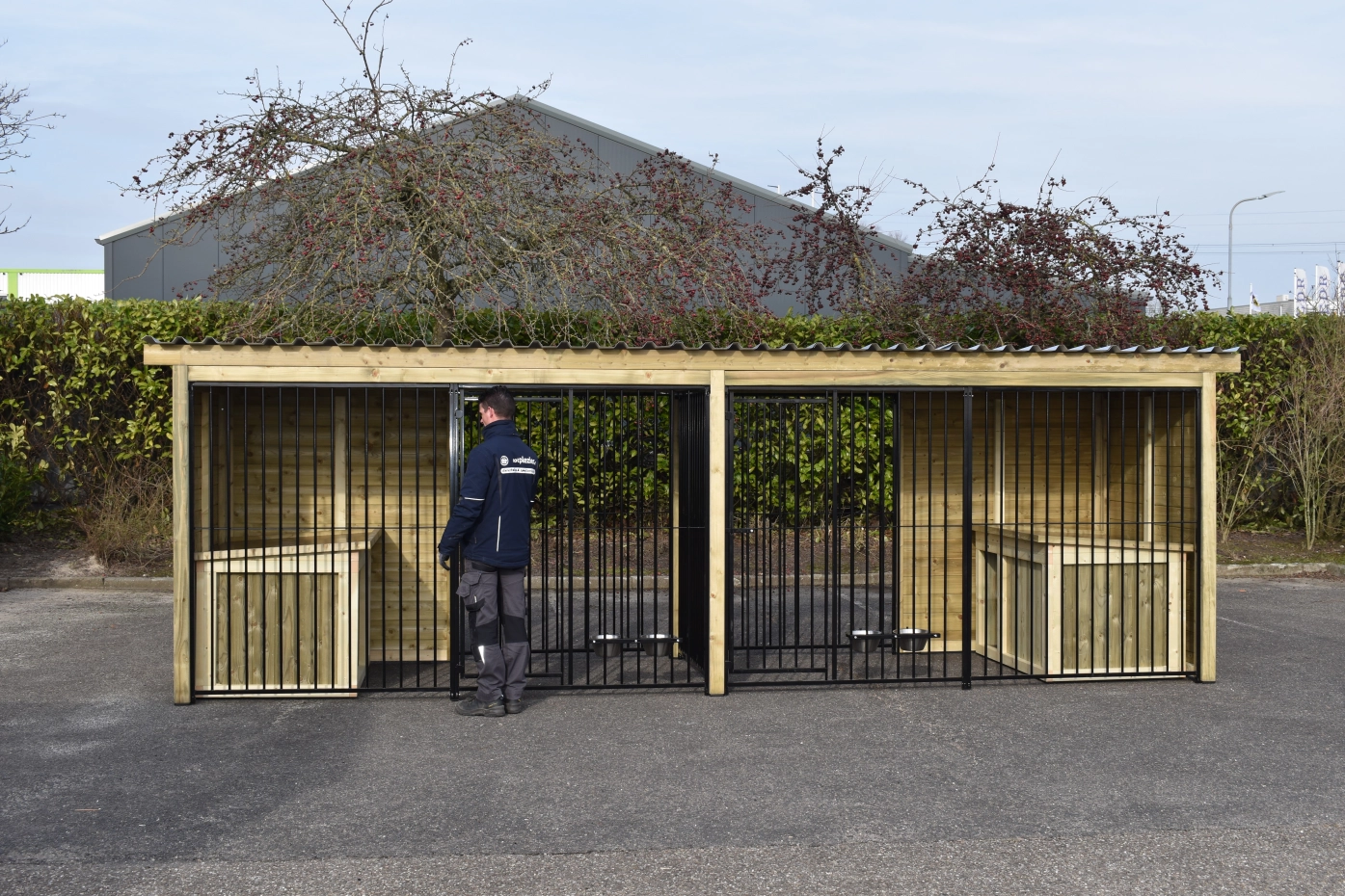 Superb double kennel with 2 night sheds. Made of impregnated pinewood, this is a durable type of wood with a long lifespan. Both sides have a wind-free corner. The Block 3 is a sturdy and practical stand-alone night shelter, which can also be placed outside the kennel. Practical kennel with large openings. The Modul walls are made of wooden frames with tongue-and-groove panels, giving the kennel a lot of strength and sealing. The roof plates are made of steel with a felt layer underneath, which prevents condensation and dampens rain noise. The price-quality ratio of this kennel is excellent!