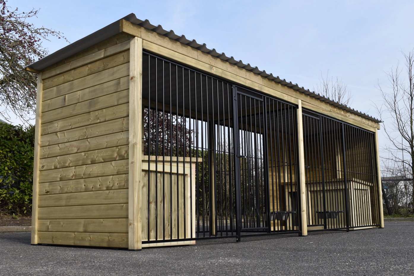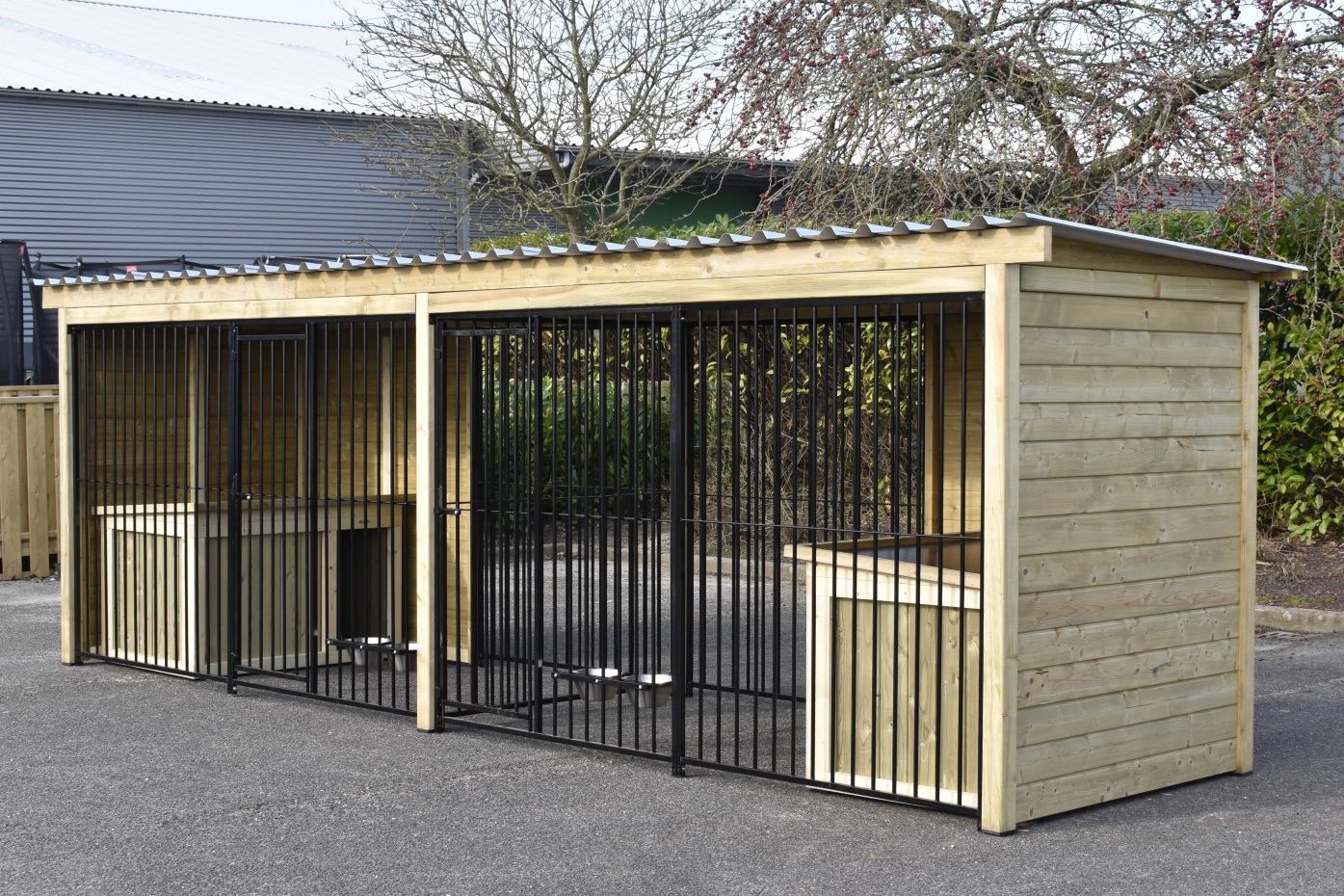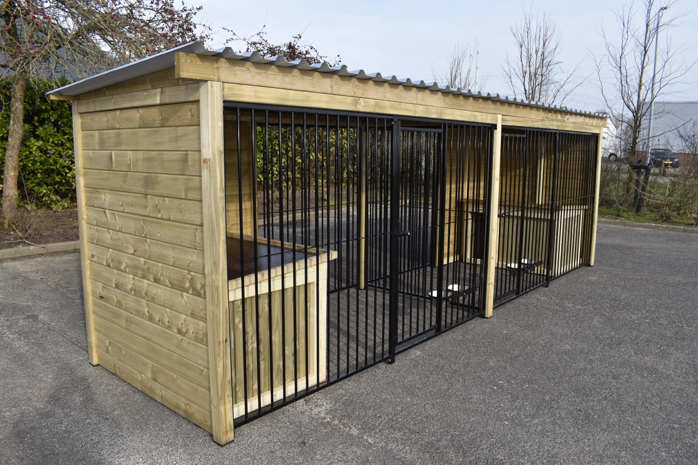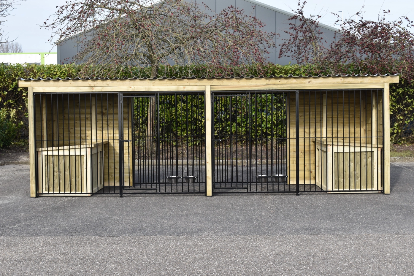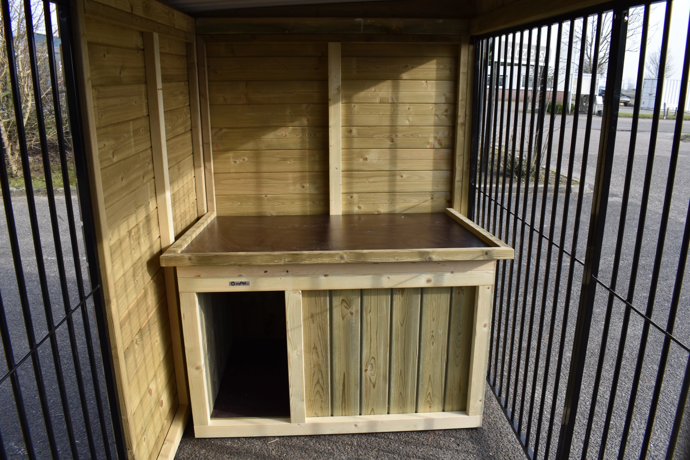 Superb double kennel with 2 night sheds. Made of impregnated pinewood, this is a durable type of wood with a long lifespan. Both sides have a wind-free corner. The Block 3 is a sturdy and practical stand-alone night shelter, which can also be placed outside the kennel. Practical kennel with large openings. The Modul walls are made of wooden frames with tongue-and-groove panels, giving the kennel a lot of strength and sealing. The roof plates are made of steel with a felt layer underneath, which prevents condensation and dampens rain noise. The price-quality ratio of this kennel is excellent!