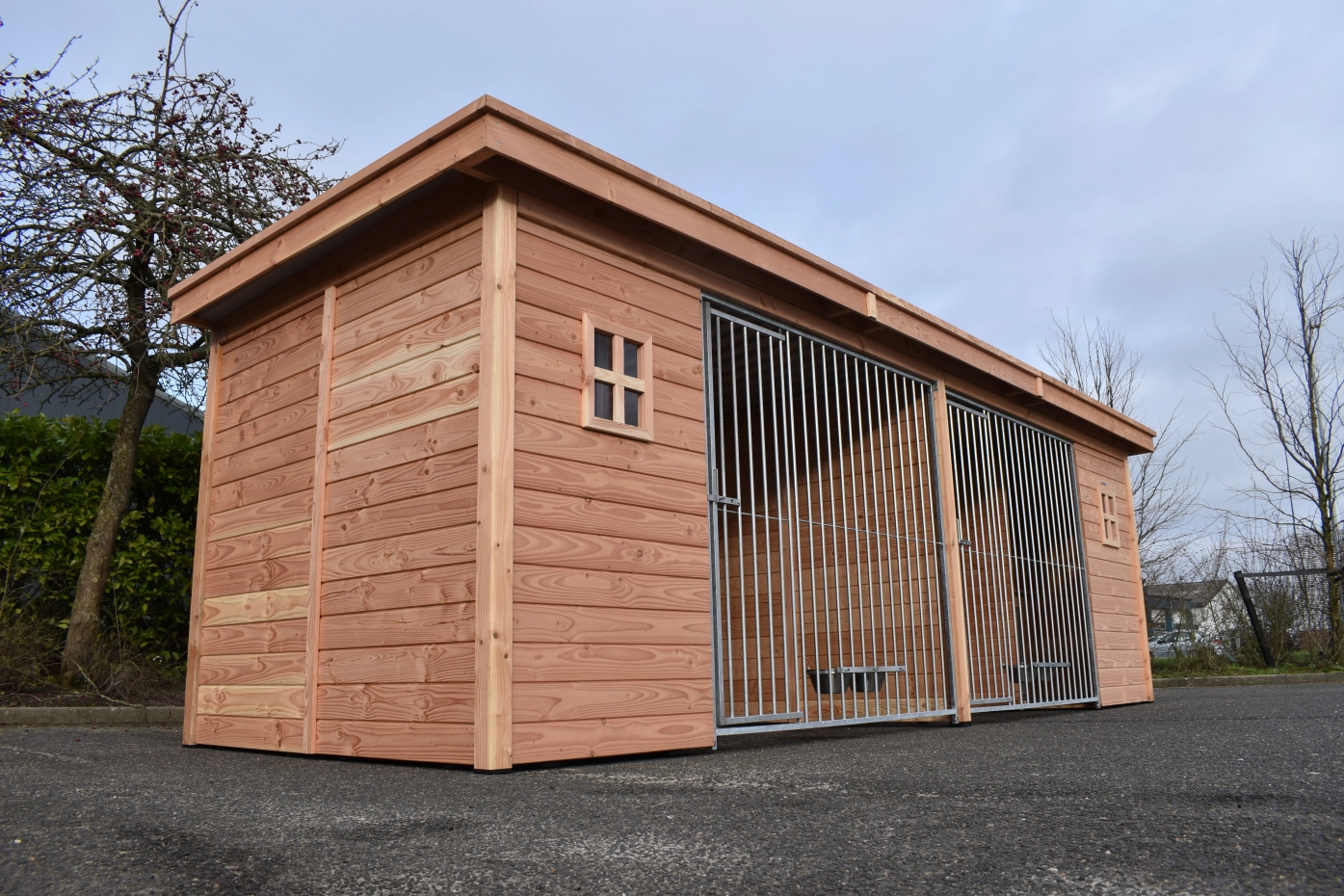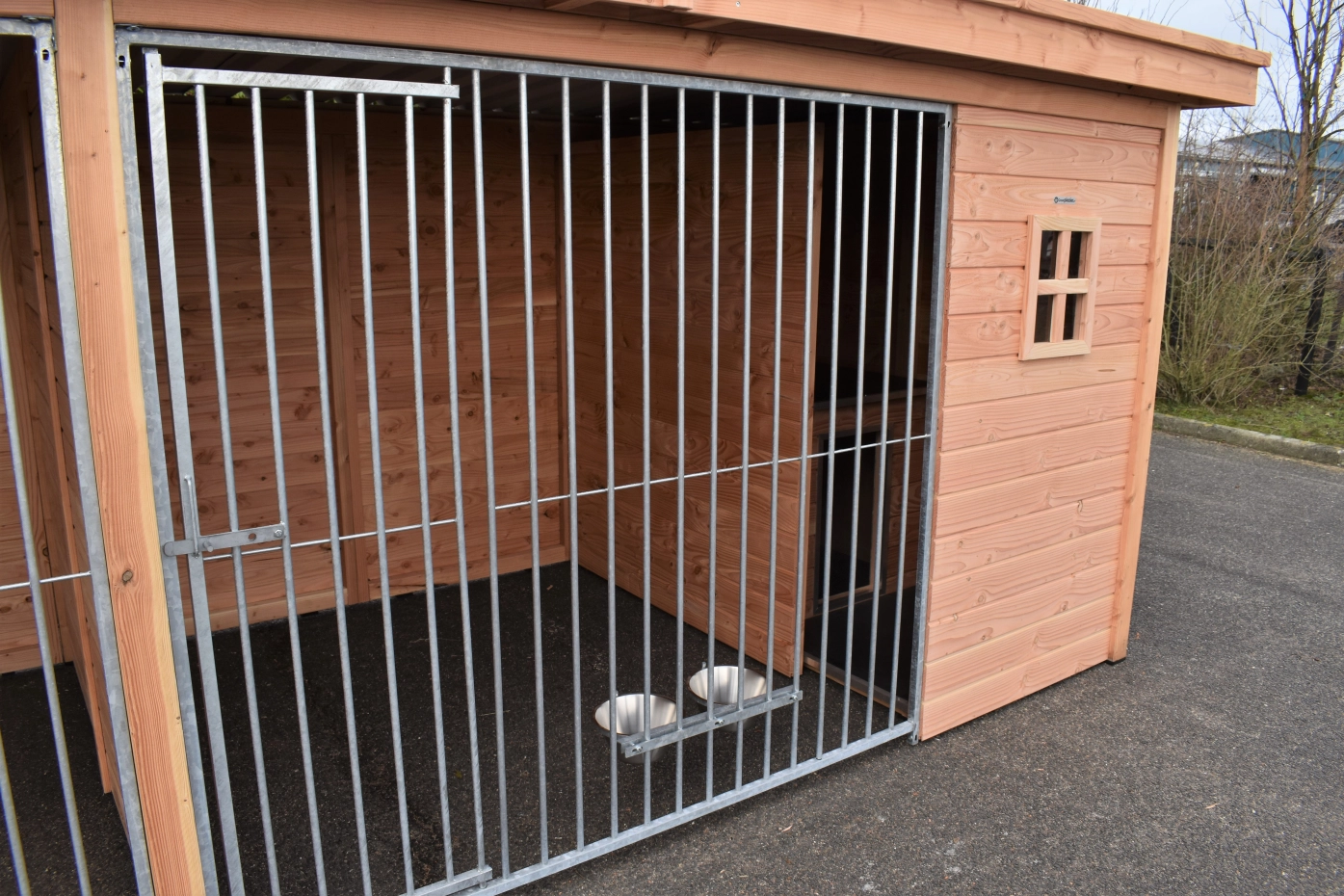 The large dog kennel Modul COMPART offers the possibility to keep 2 dogs separate from each other. The kennel has 2 insulated sleeping compartments. The kennel is provided with galvanized bar panels and is made of Douglaswood. The roof is provided with aluminium corrugated sheets. To preserve the color of the wood you can treat it with Douglas oil. Even without further treatment, Douglas fir is very durable.