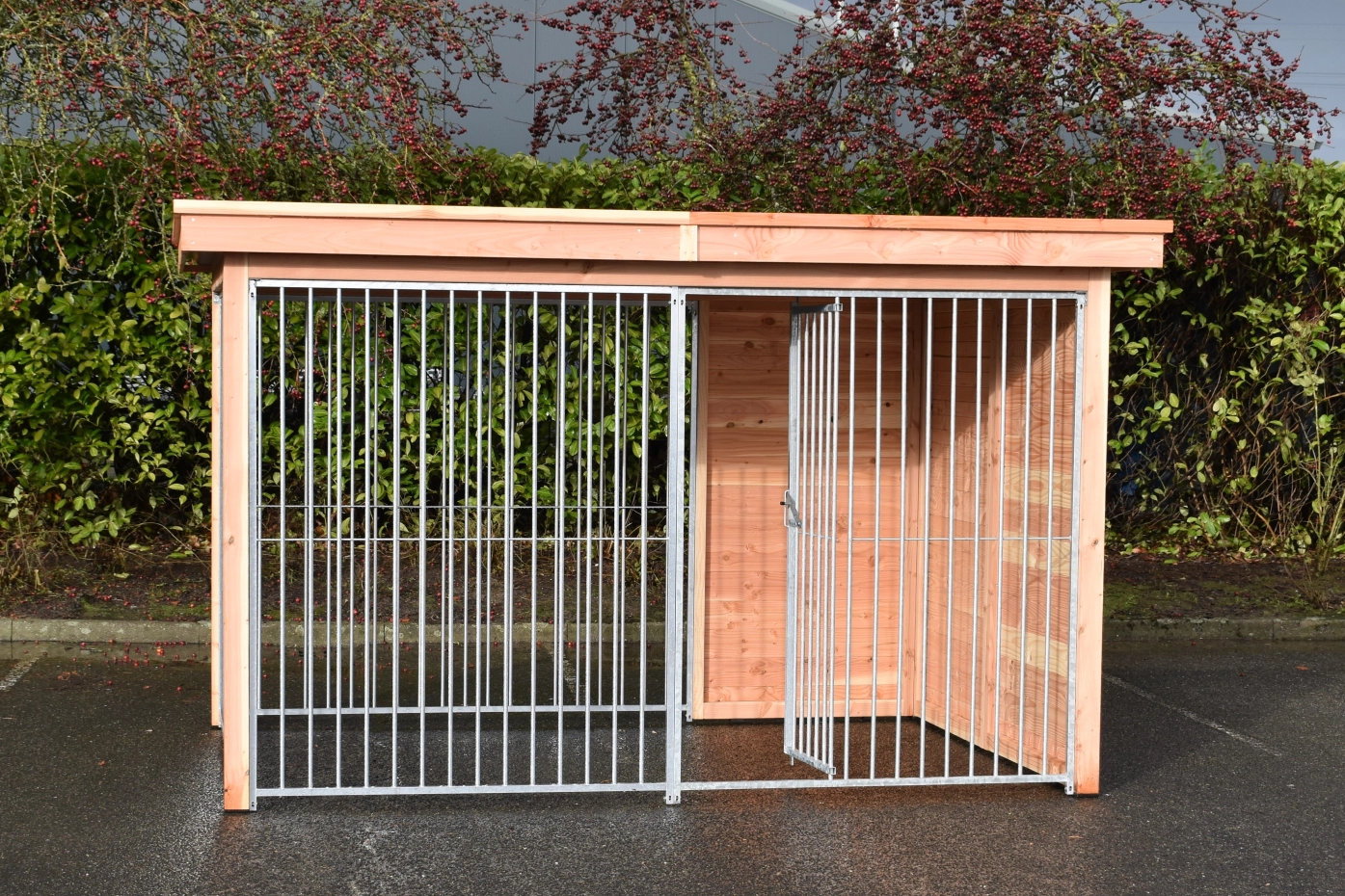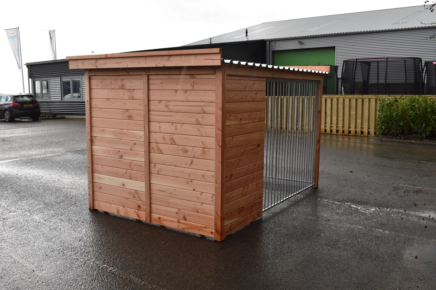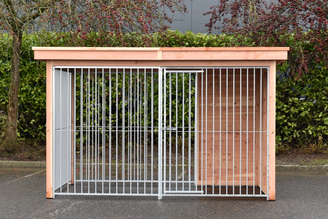 Beautiful dog kennel Modul FERM has a Douglaswooden frame and is provided with galvanized bar panels. Without further treatment, the wood will quickly turn grey. To preserve the color of the wood you can treat it with Douglas oil. Even without further treatment, Douglas fir is very durable. The kennel can be adapted after your own wishes.