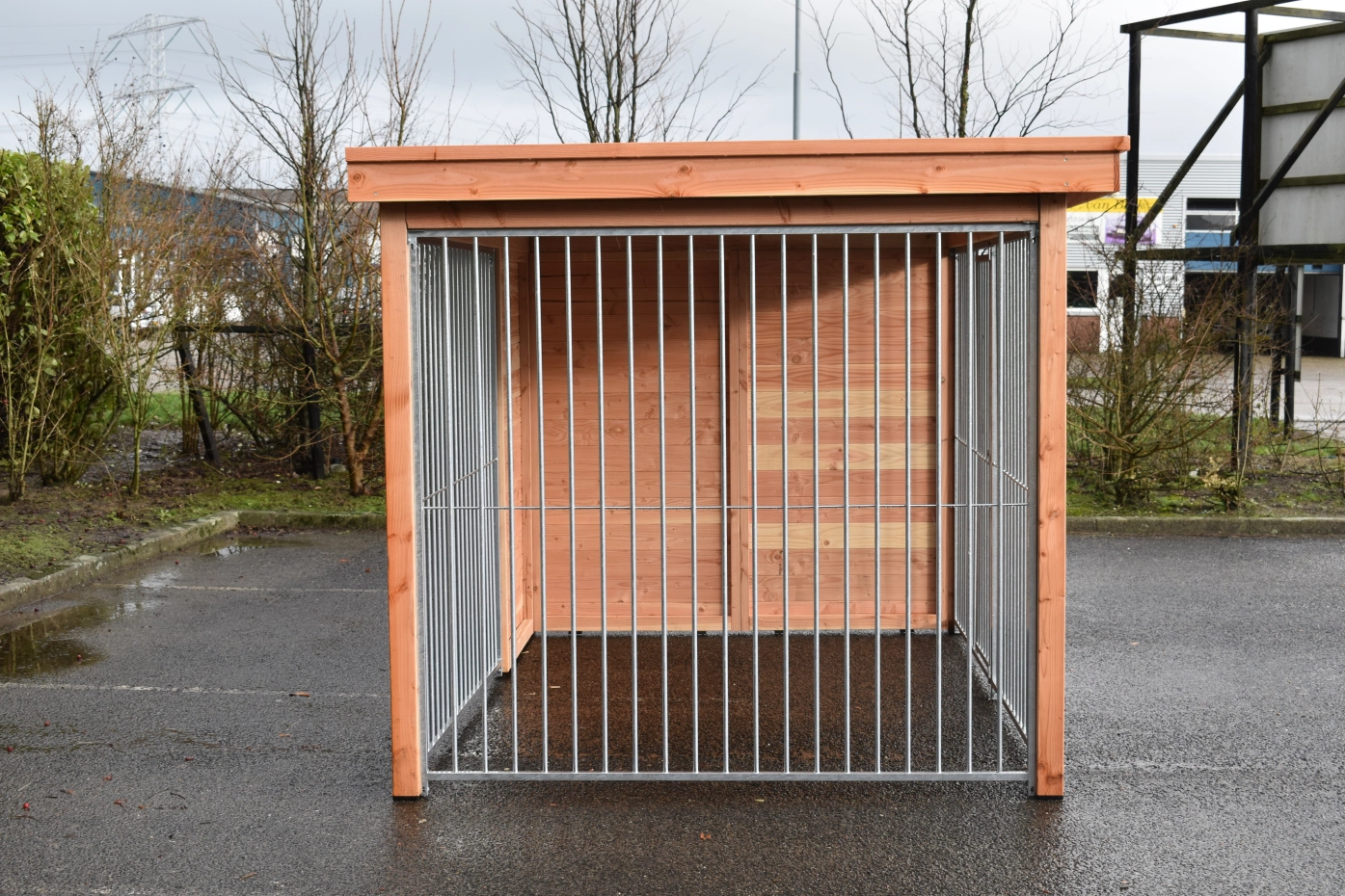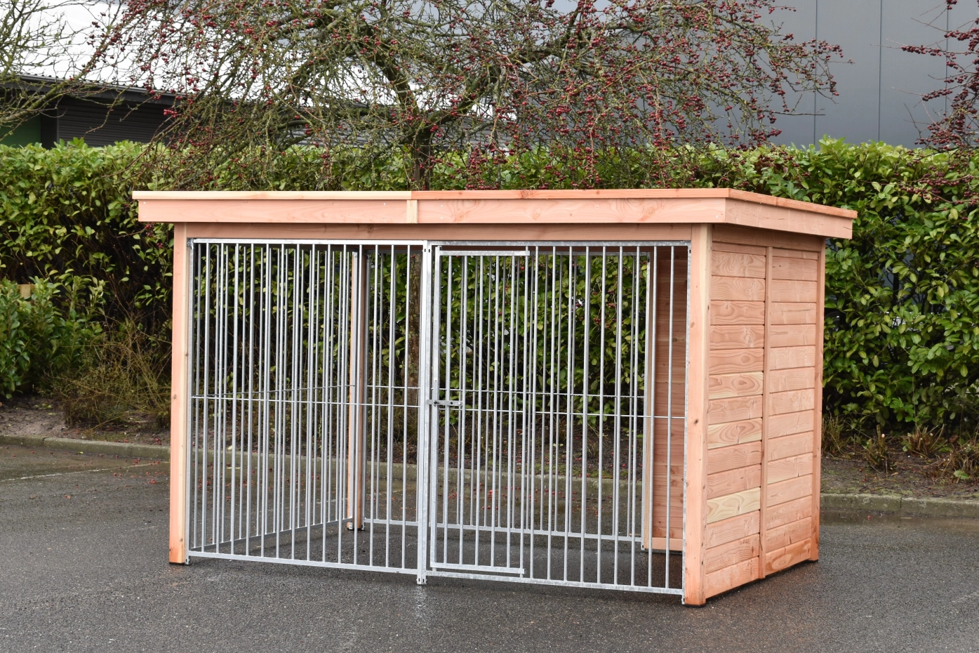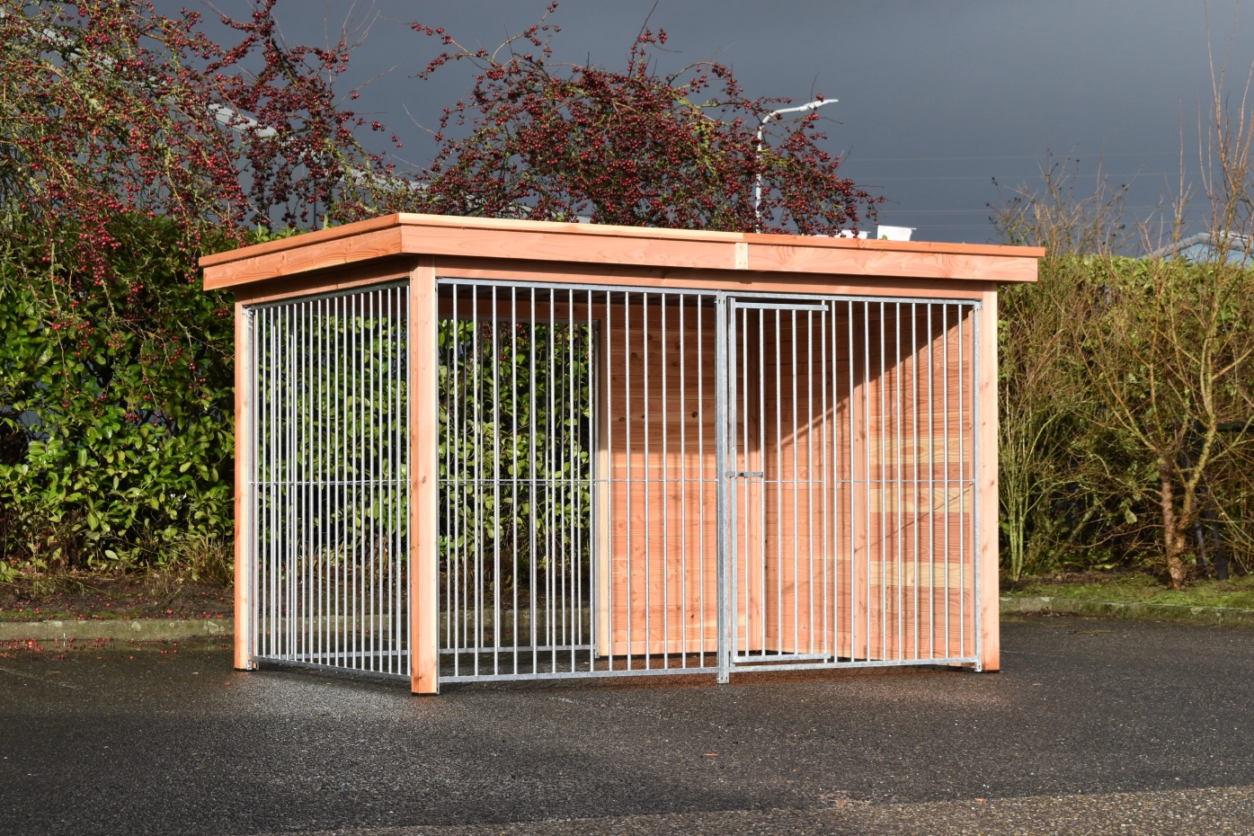 Beautiful dog kennel Modul FERM has a Douglaswooden frame and is provided with galvanized bar panels. Without further treatment, the wood will quickly turn grey. To preserve the color of the wood you can treat it with Douglas oil. Even without further treatment, Douglas fir is very durable. The kennel can be adapted after your own wishes.