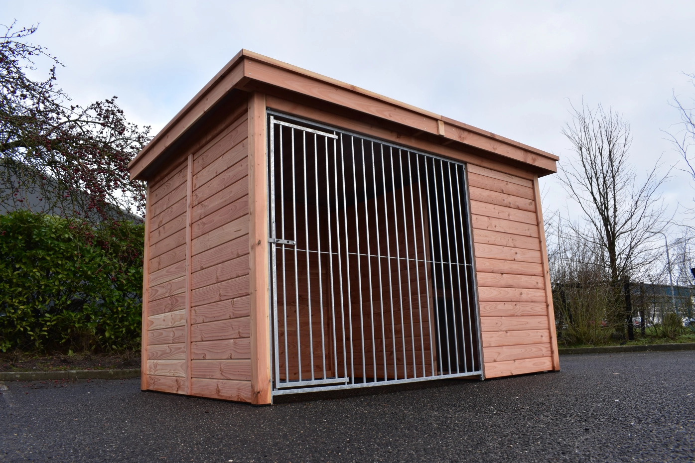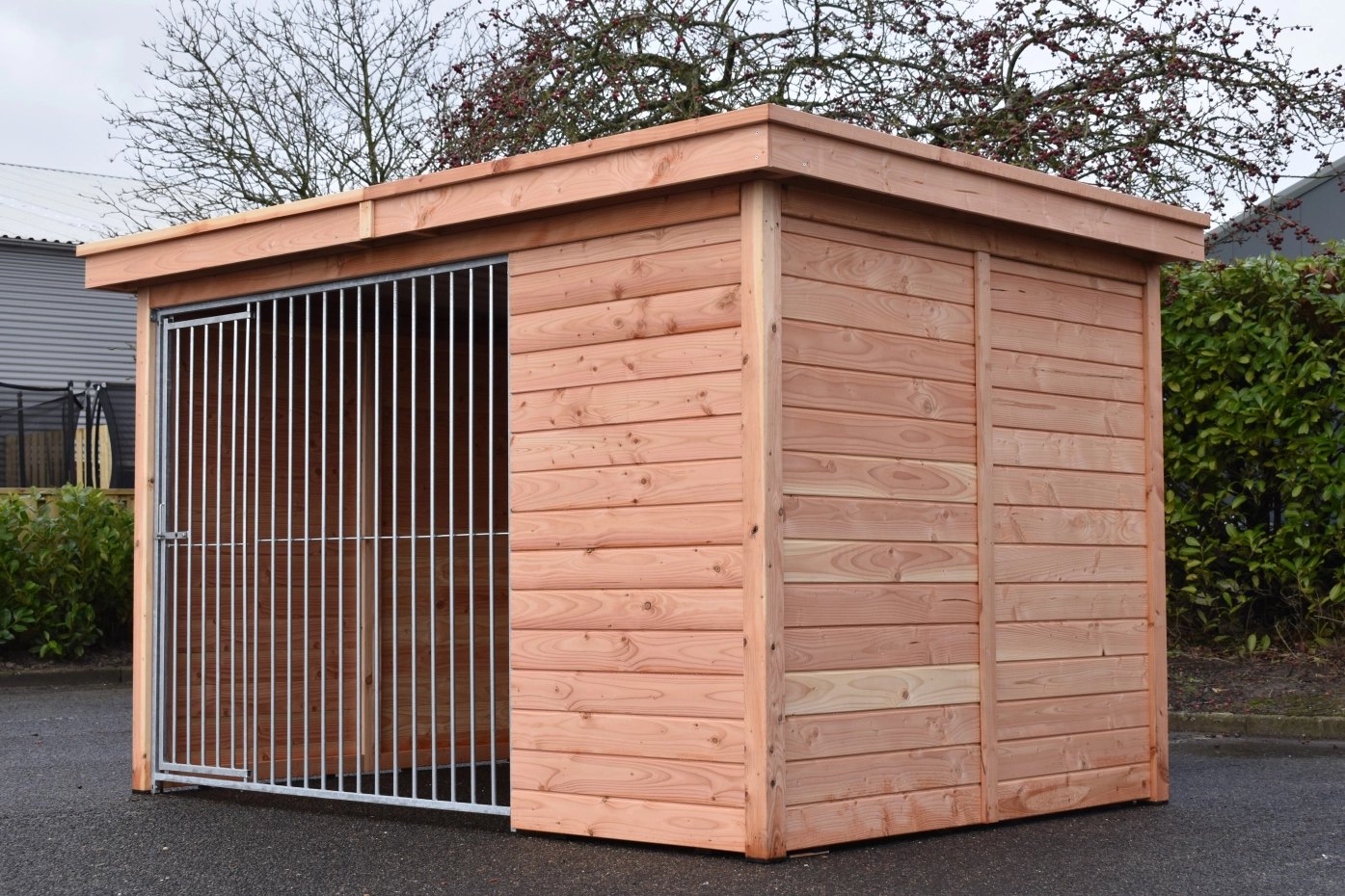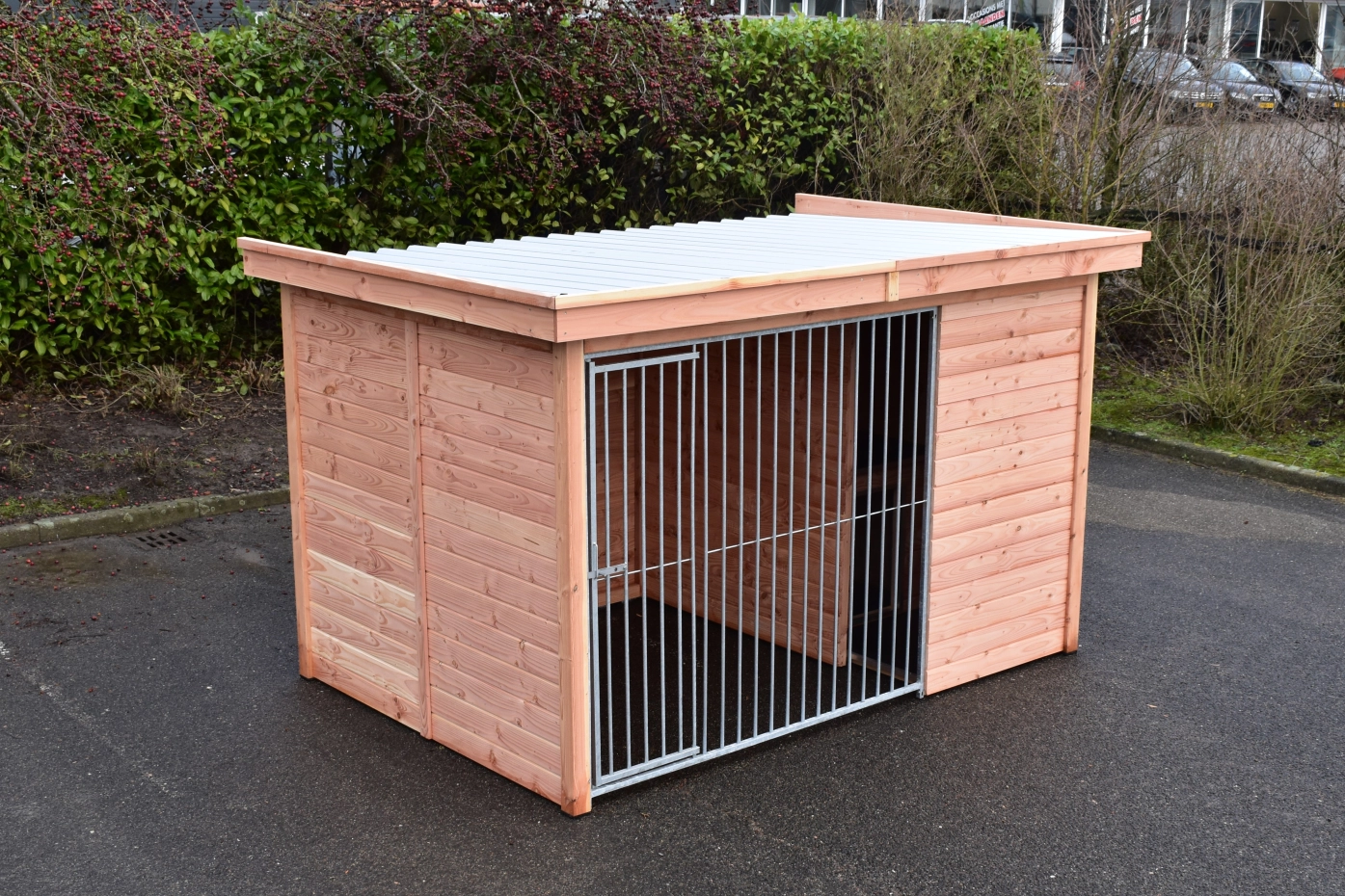 The dog kennel Modul FORZ has an insulated sleeping compartment. The kennel has a Douglaswooden frame and a galvanized bar panel. The kennel is provided with a roof Luxe. The sleeping compartment has a hinged roof. Without further treatment, the wood will quickly turn grey. To preserve the color of the wood you can treat it with Douglas oil. Even without further treatment, Douglas fir is very durable.