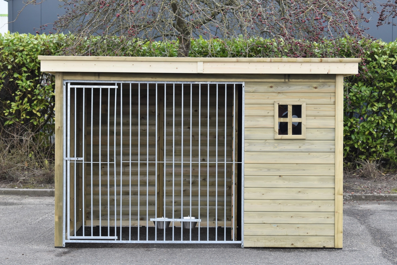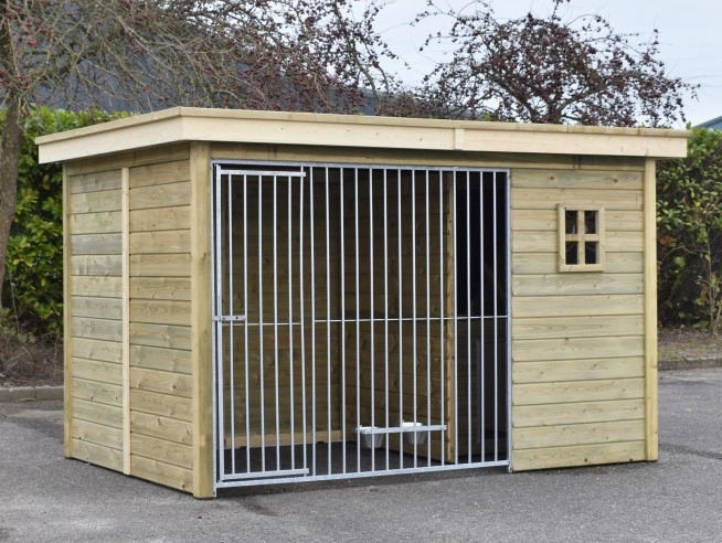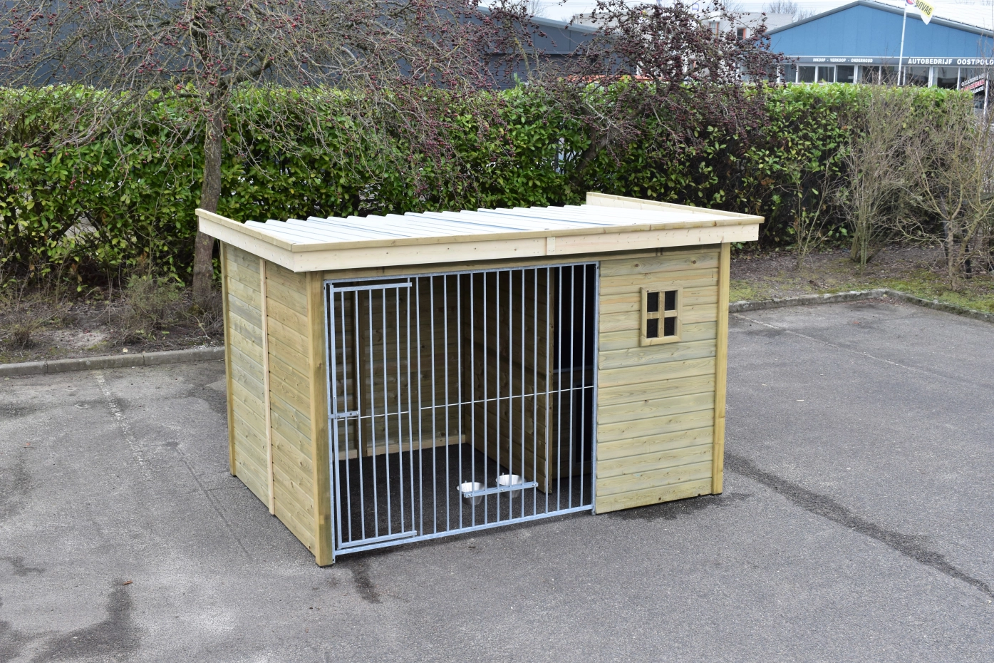 The dog kennel Modul FORZ is made of impregnated wood and provided with galvanized panels. The kennel is provided with a feeding system and an insulated sleeping compartment. The wooden kennel is provided with a window. An acquisition for your yard!