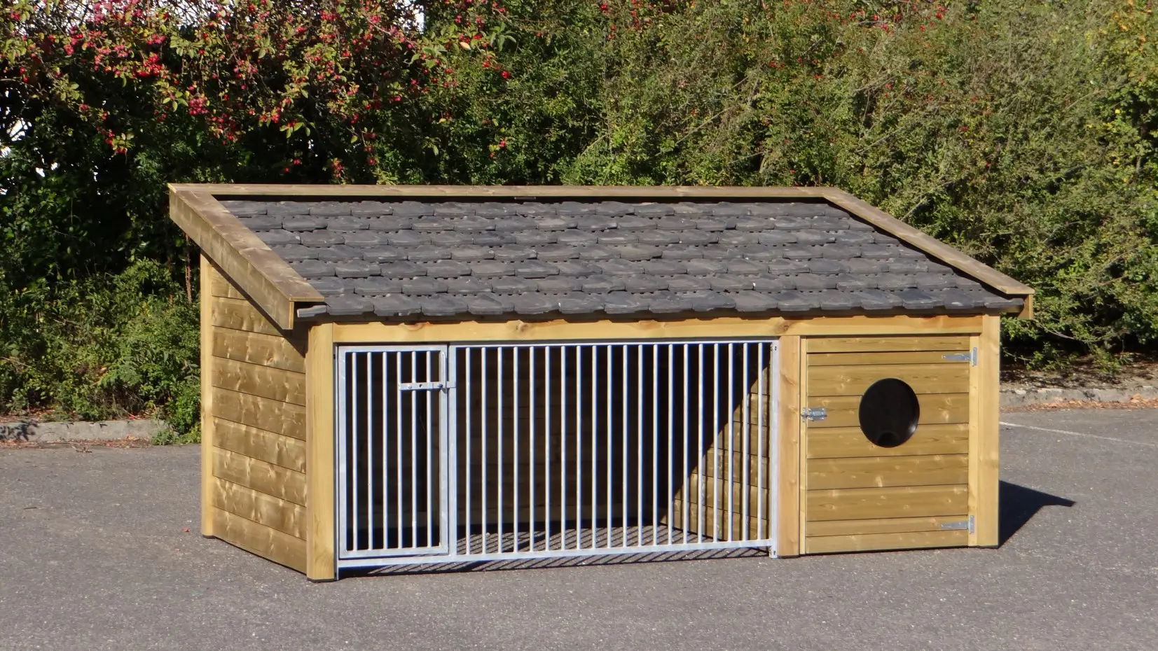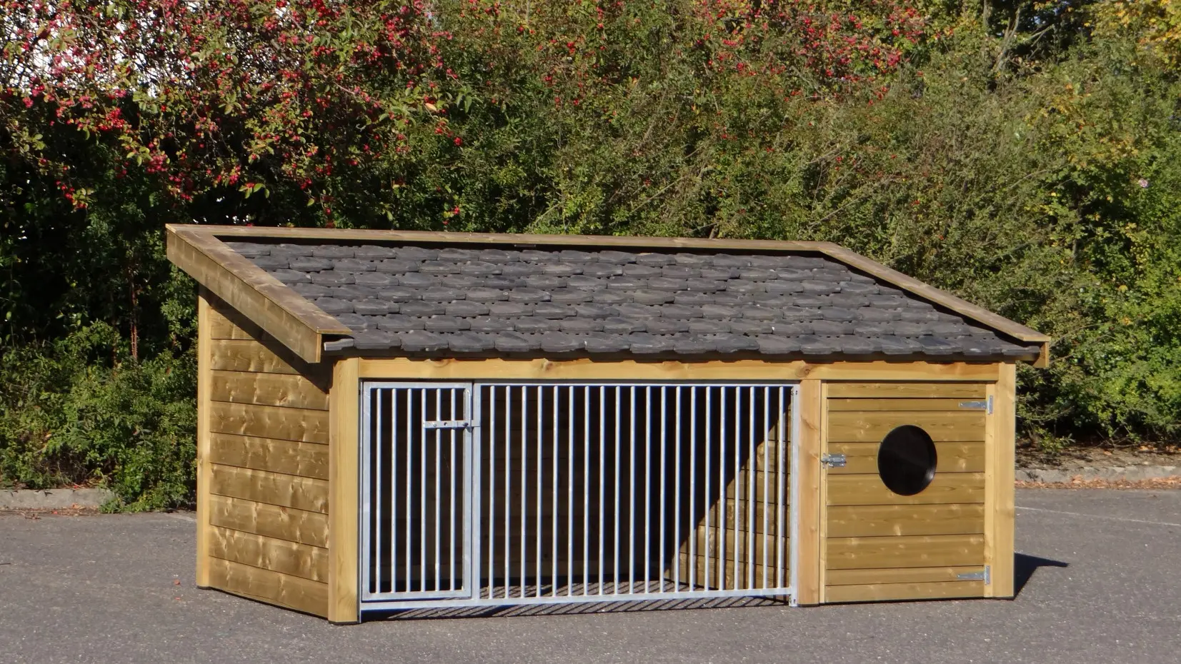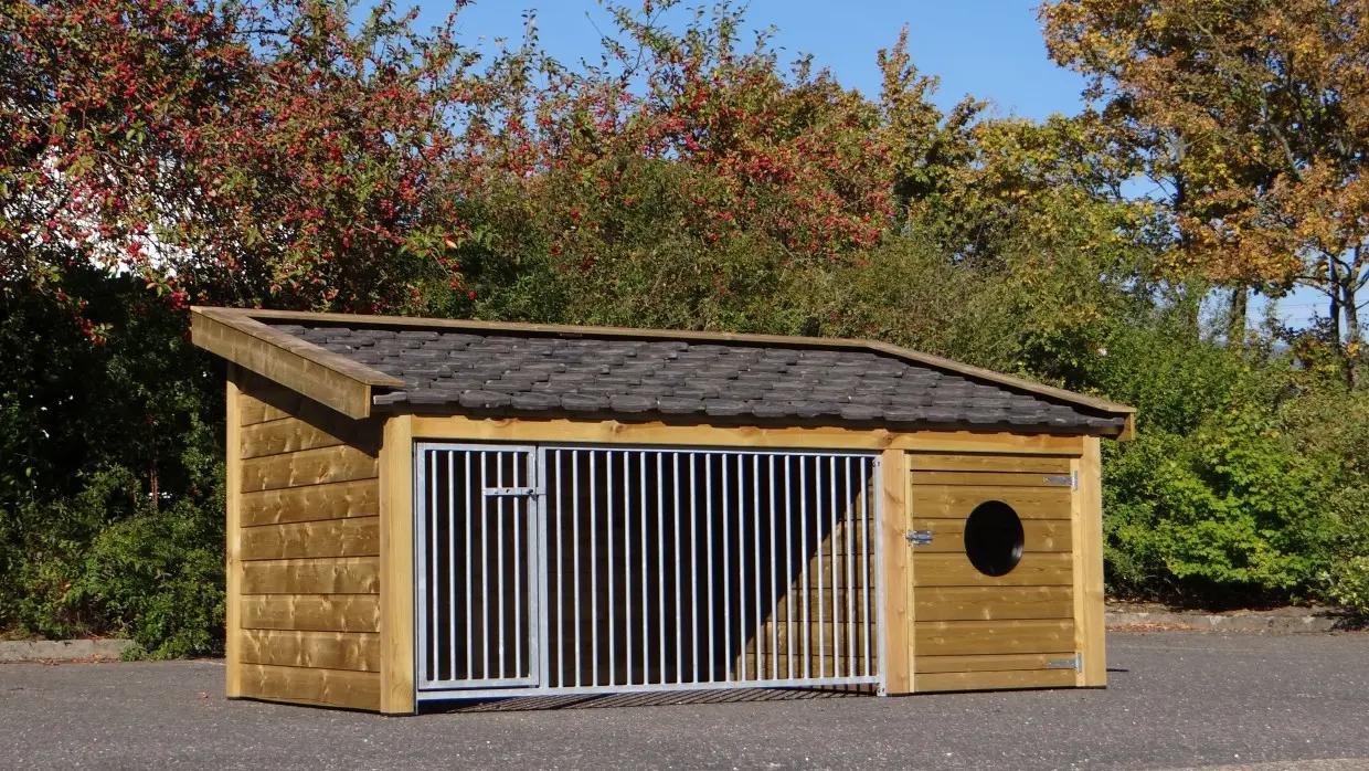 - This doghouse is equipped with used ceramic roof tiles.