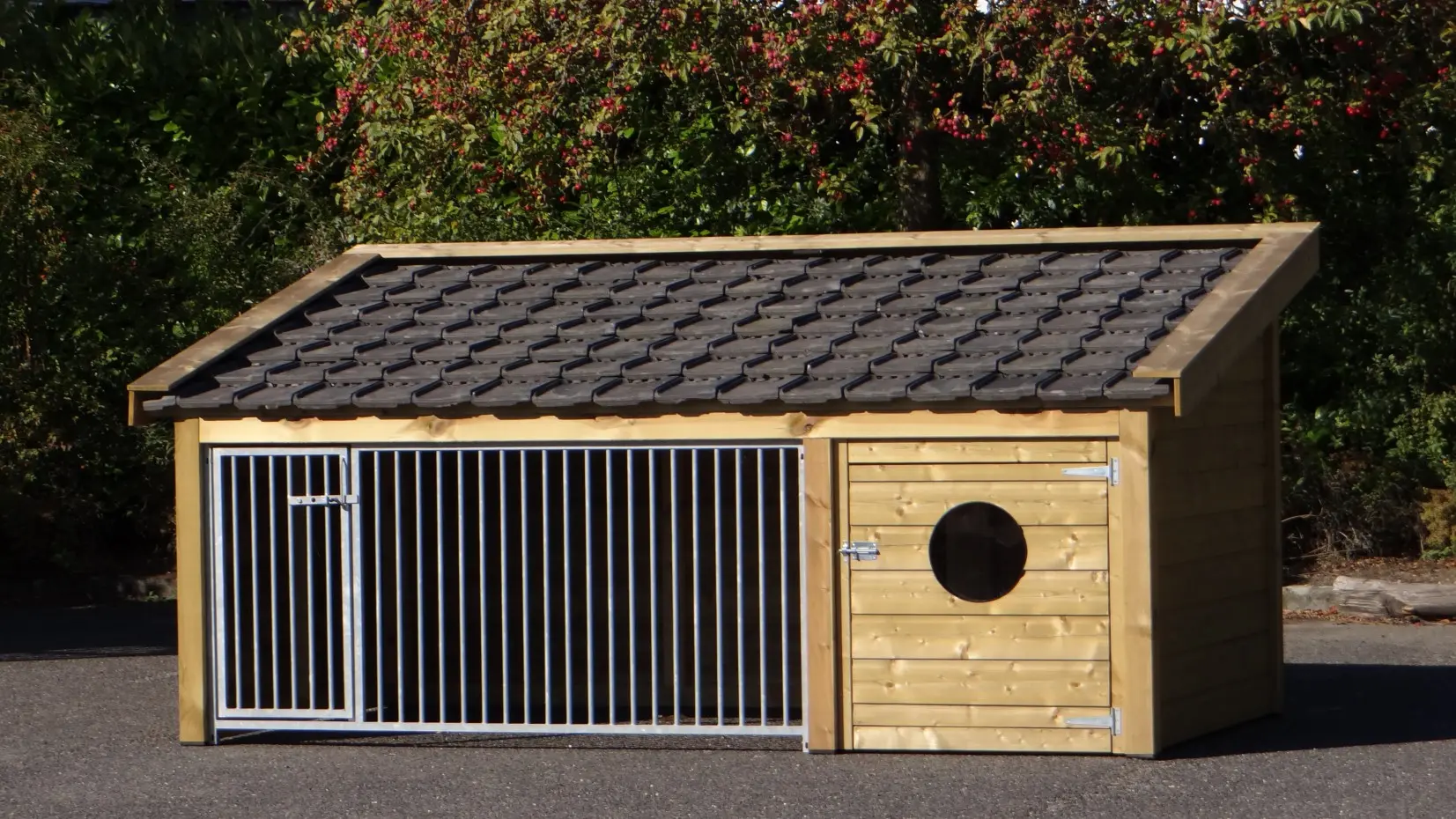 The dog kennel Rex 1 has an insulated sleeping compartment. The kennel is made of pressure treated spruce wood and is also provided with second-handed roof tiles. The sleeping compartment has a plywood floor and a window in the door. The bar panels are galvanized. This kennel has an insulated sleeping compartment, so that your dog can stay outside during the whole year.