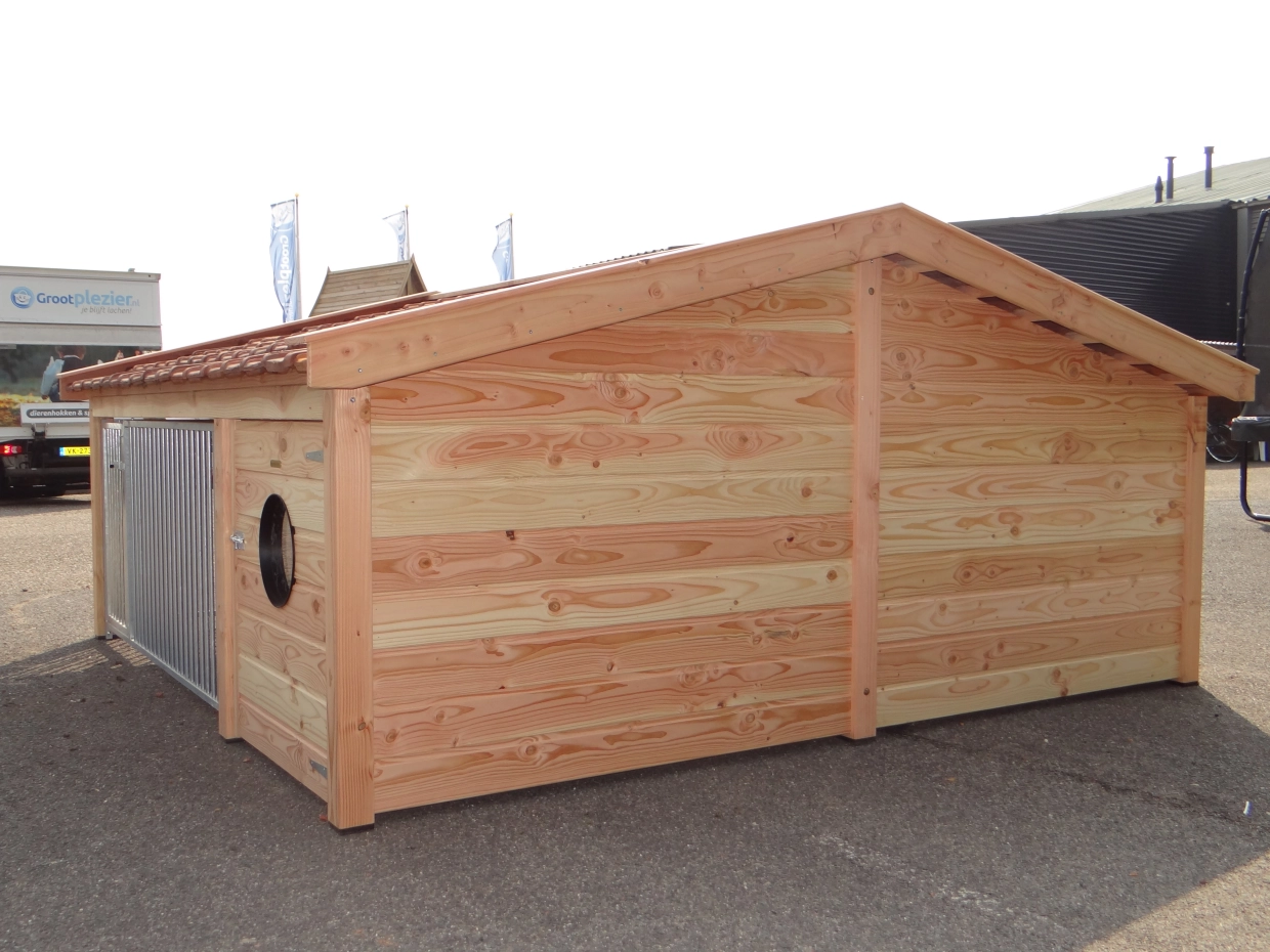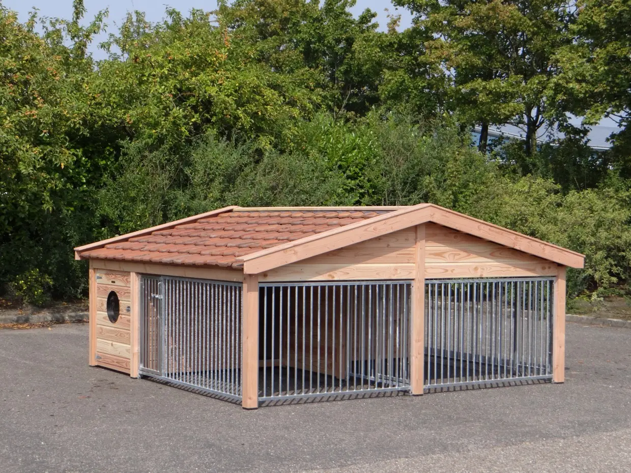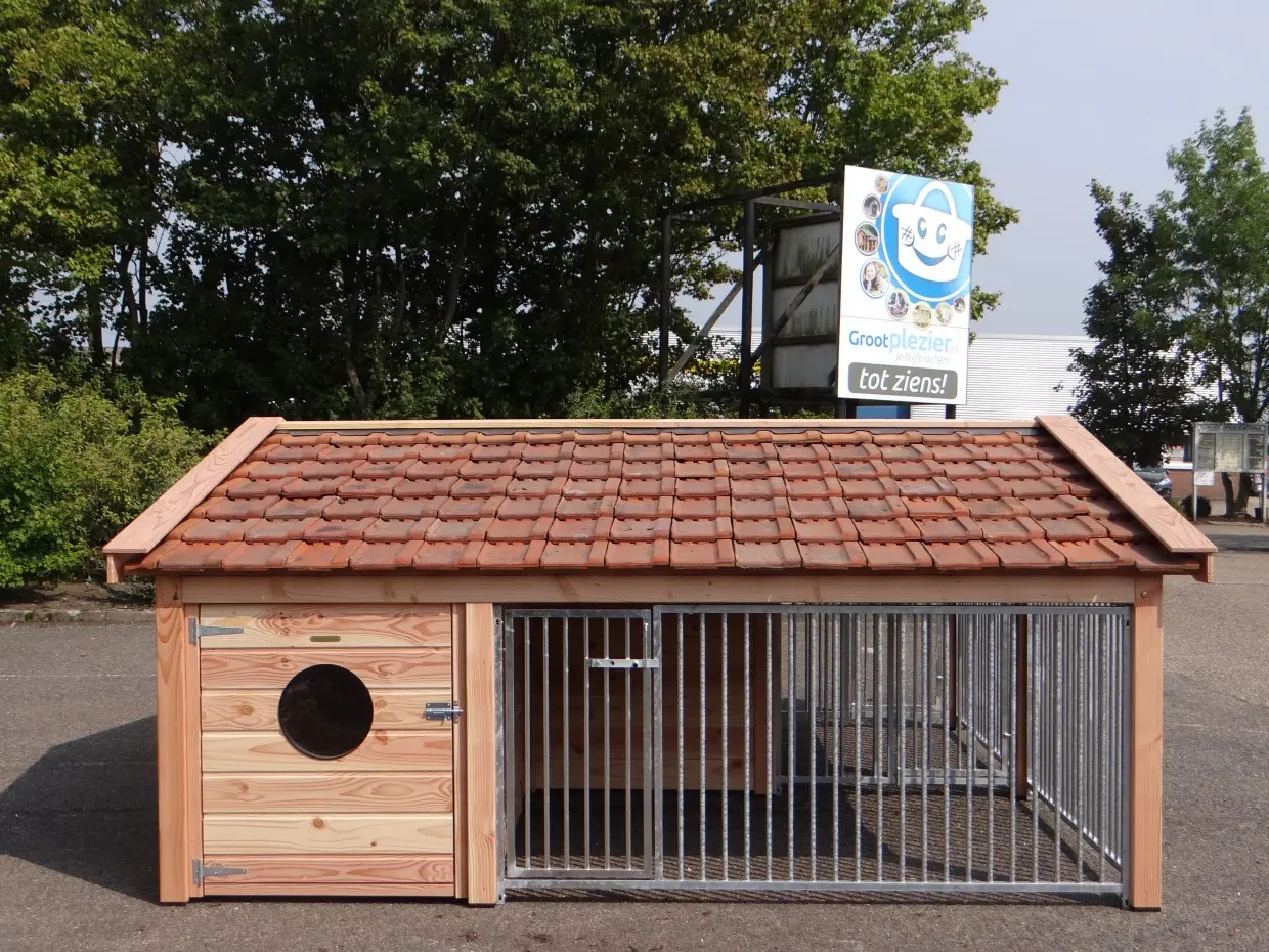 Dog kennel Rex 2 Compart is made of Douglaswood and fitted with ceramic roof tiles. Dog Run Rex 2 Compart is ideal for keeping 2 dogs in, yet separate from each other. By default, the run is not equipped with a swiveling feeder, but you can opt for this. The Rex Compart Douglas dog kennel has 2 spacious night shelters with a concrete plywood bottom. Standard these night sheds are insulated. The kennel is equipped with galvanized panels. It can even accommodate 4 dogs.