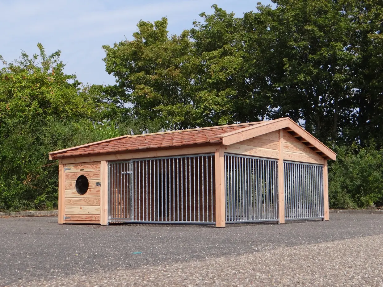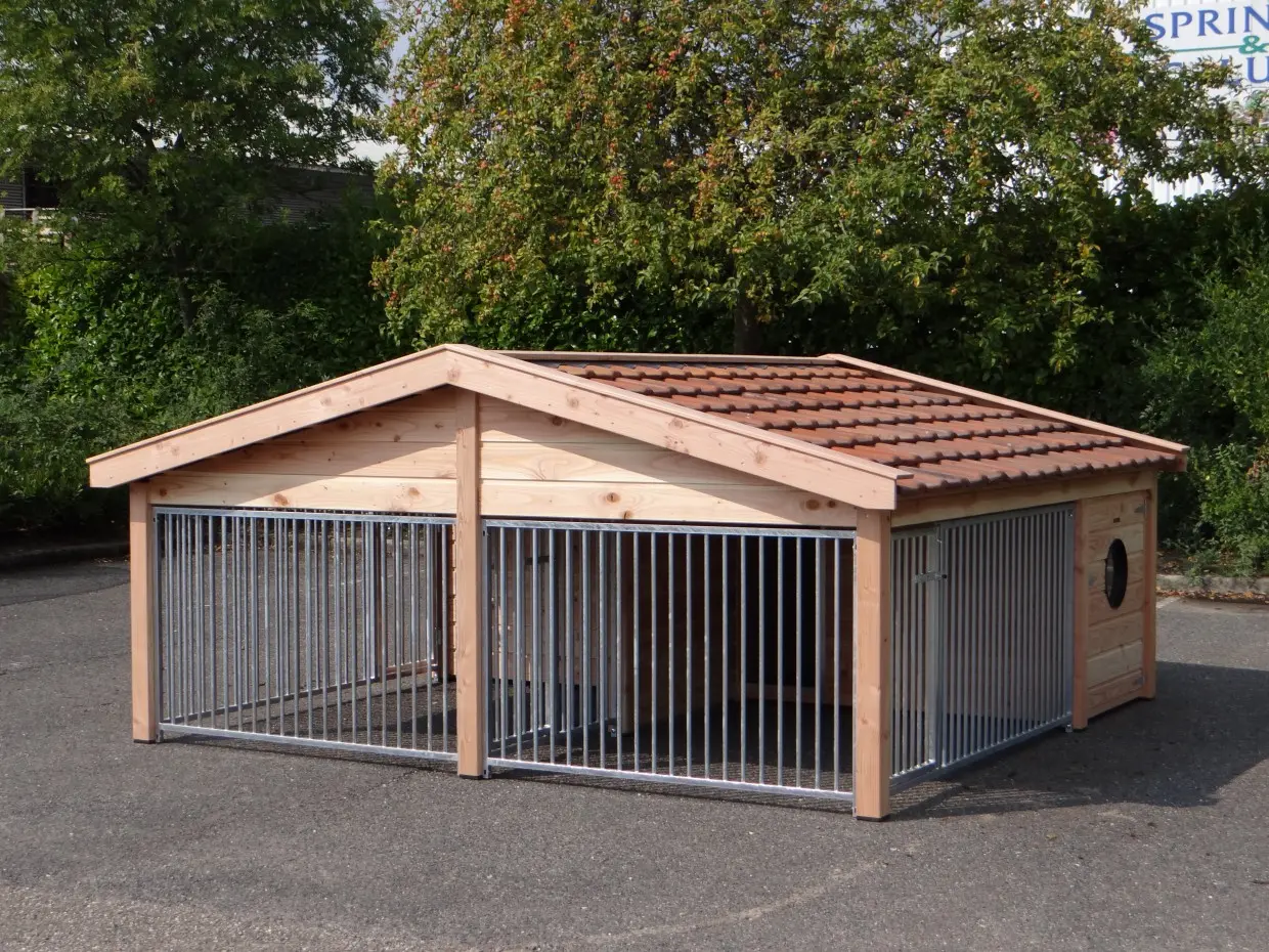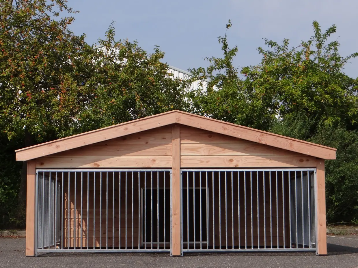 Dog kennel Rex 2 Compart is made of Douglaswood and fitted with ceramic roof tiles. Dog Run Rex 2 Compart is ideal for keeping 2 dogs in, yet separate from each other. By default, the run is not equipped with a swiveling feeder, but you can opt for this. The Rex Compart Douglas dog kennel has 2 spacious night shelters with a concrete plywood bottom. Standard these night sheds are insulated. The kennel is equipped with galvanized panels. It can even accommodate 4 dogs.