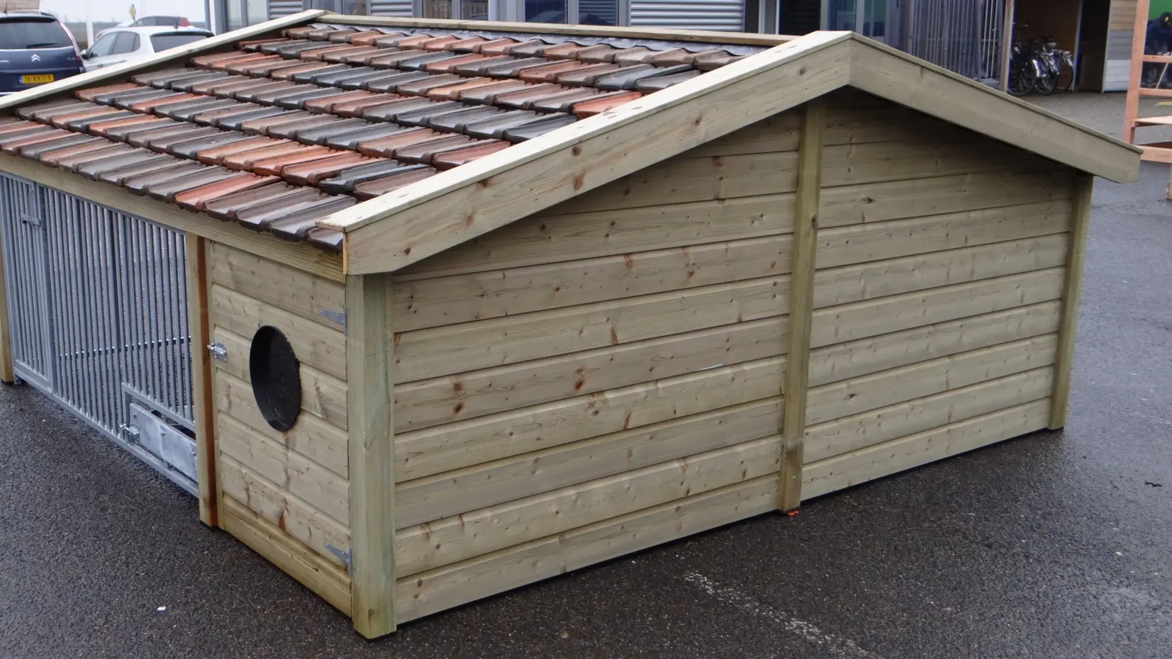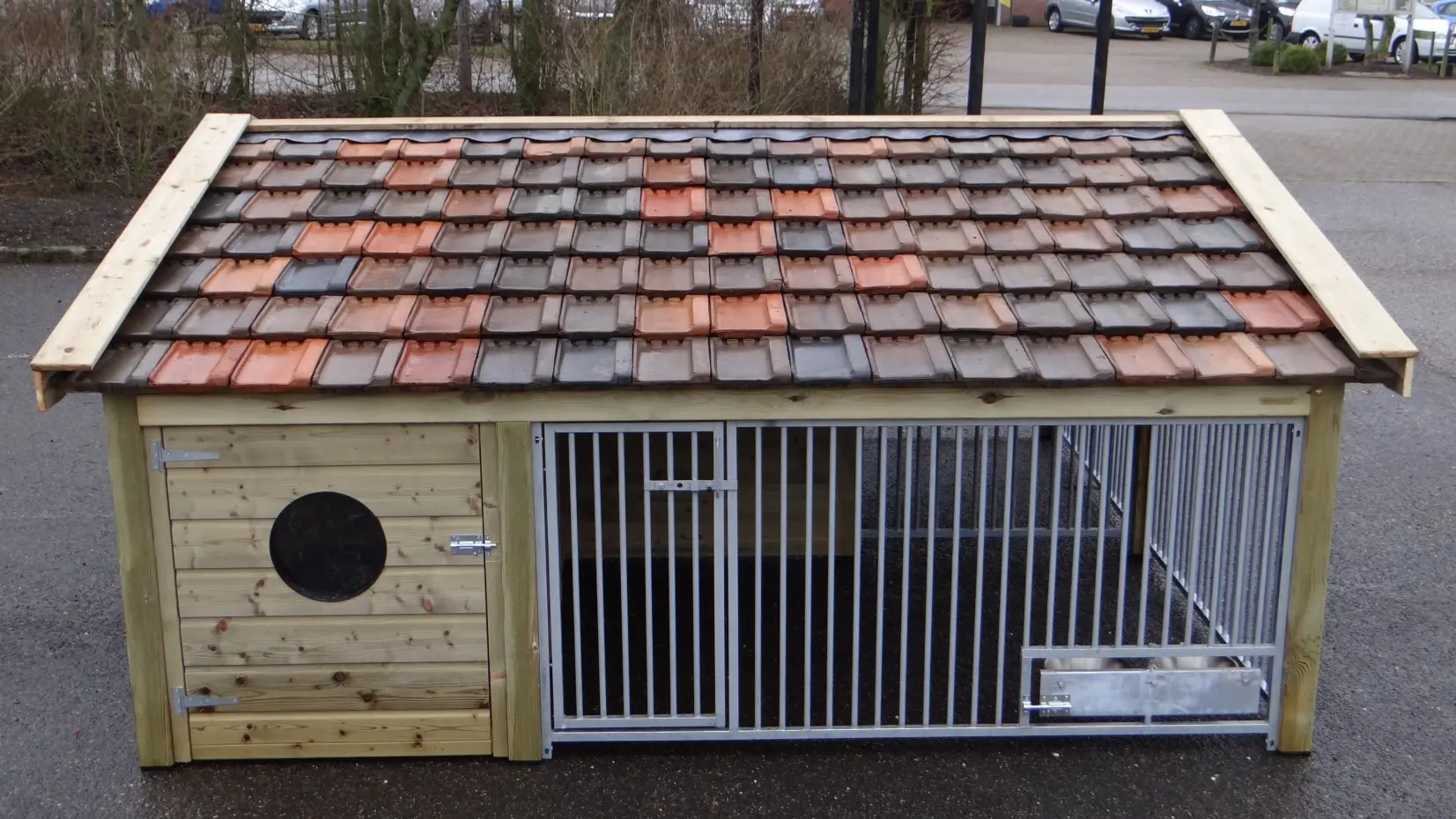 - This doghouse is equipped with used ceramic roof tiles.
