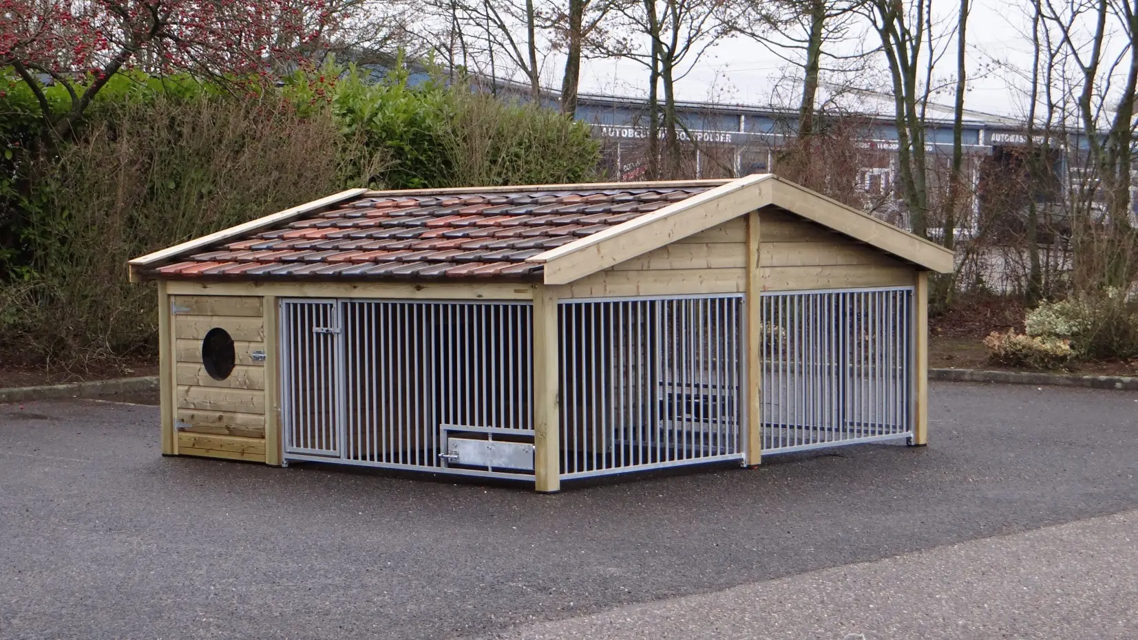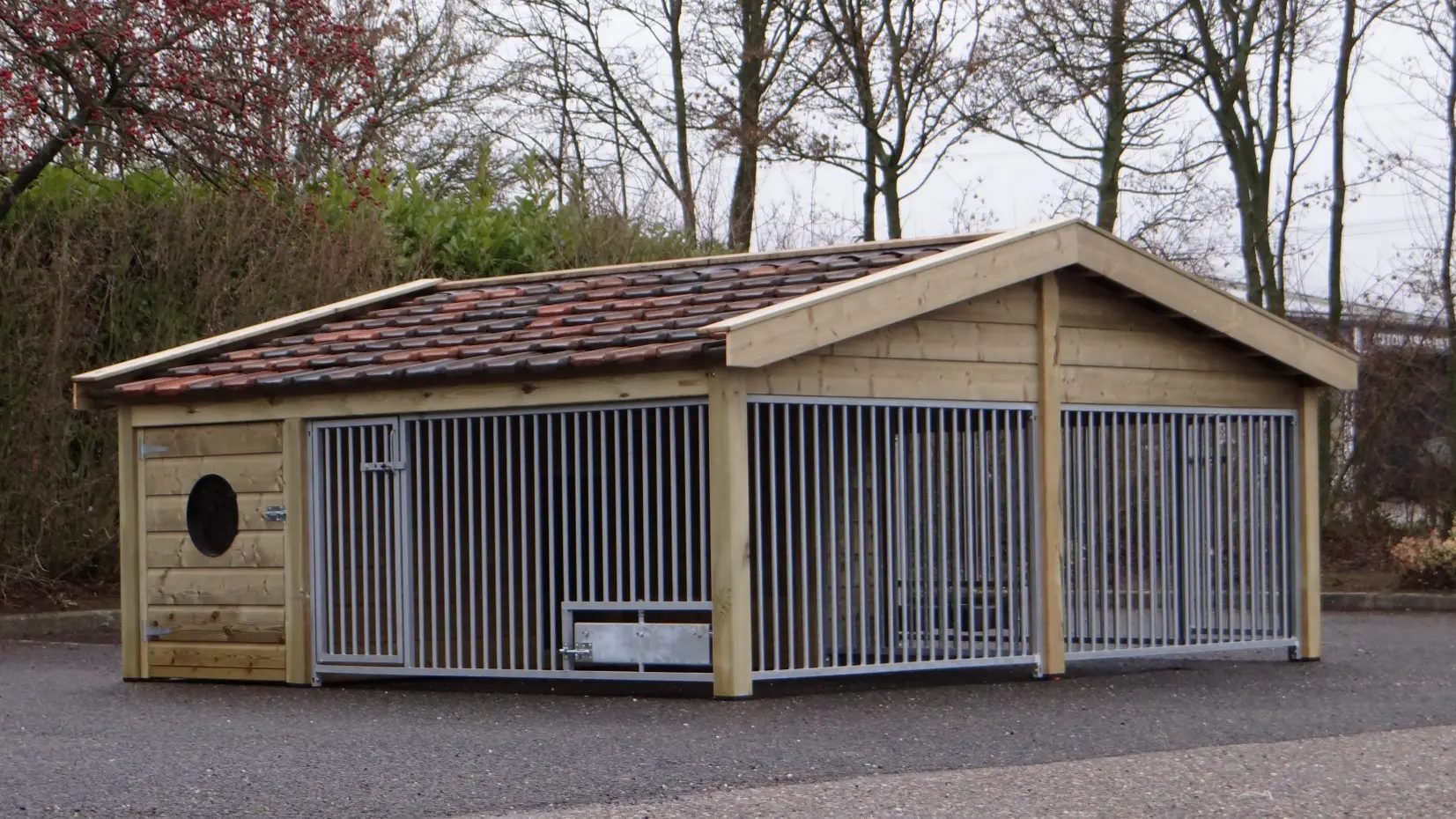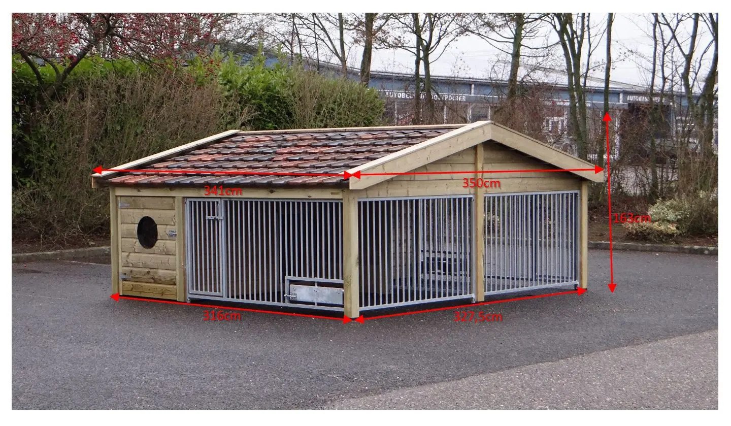The Rex 2 Compart dog kennel is made of pressure treated spruce wood and features restored ceramic roof tiles. This double dog kennel is robust and stylish, offering two spacious runs and two large dog houses. This makes the Rex Compart kennel perfect for housing two dogs while keeping them separated. Both runs can optionally be equipped with a rotating feeding stand. The kennel panels are hot-dip galvanized, and both sleeping areas have a betonplex floor.