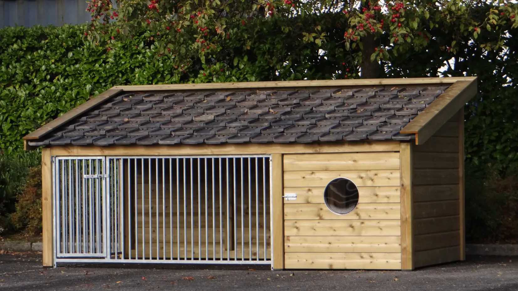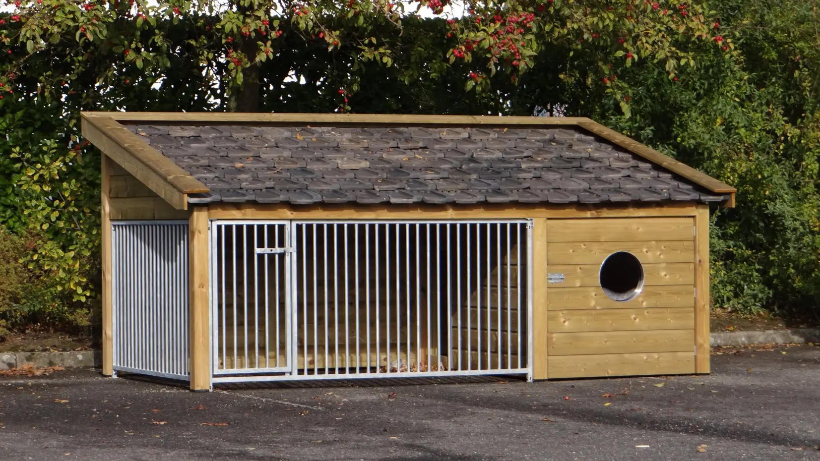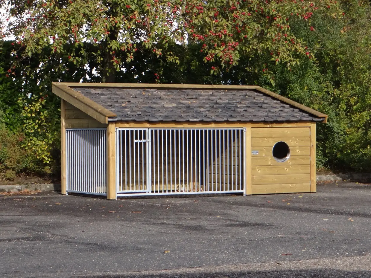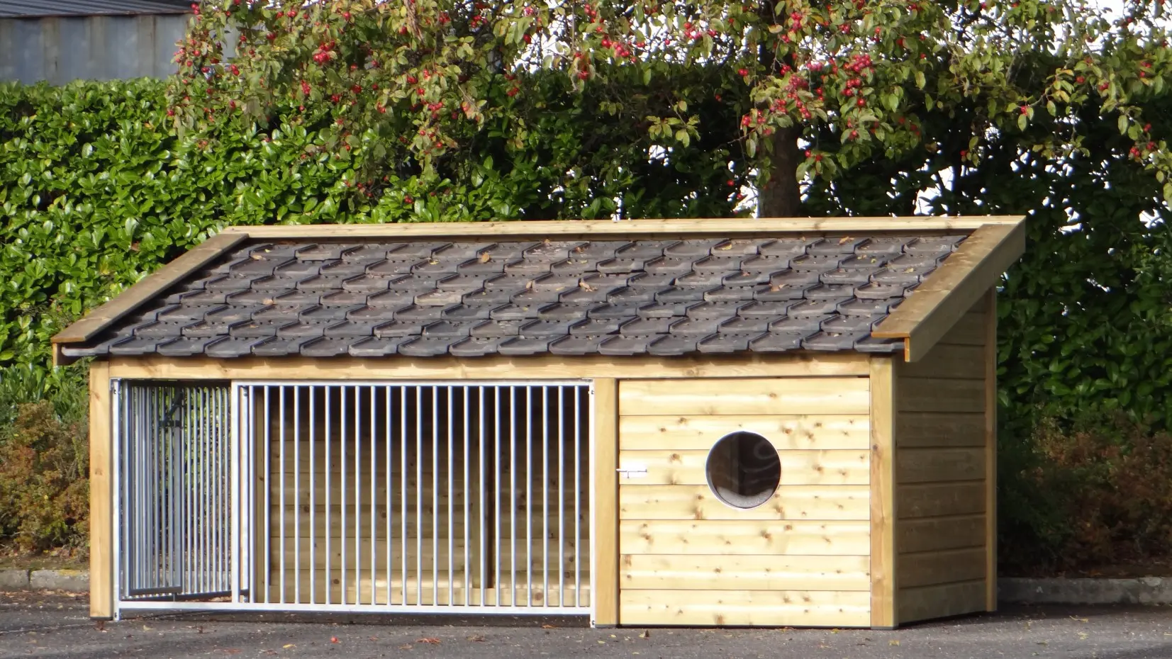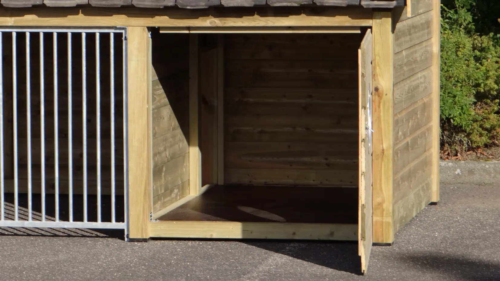 Dog kennel Rex 2 is made of pressure treated spruce wood and is provided with used roof tiles. The kennel has a large sleeping compartment with a plywood floor. The sleeping compartment is insulated, so your dog can be staying outside during the whole year. The kennel is provided with 2 galvanized mesh panels.