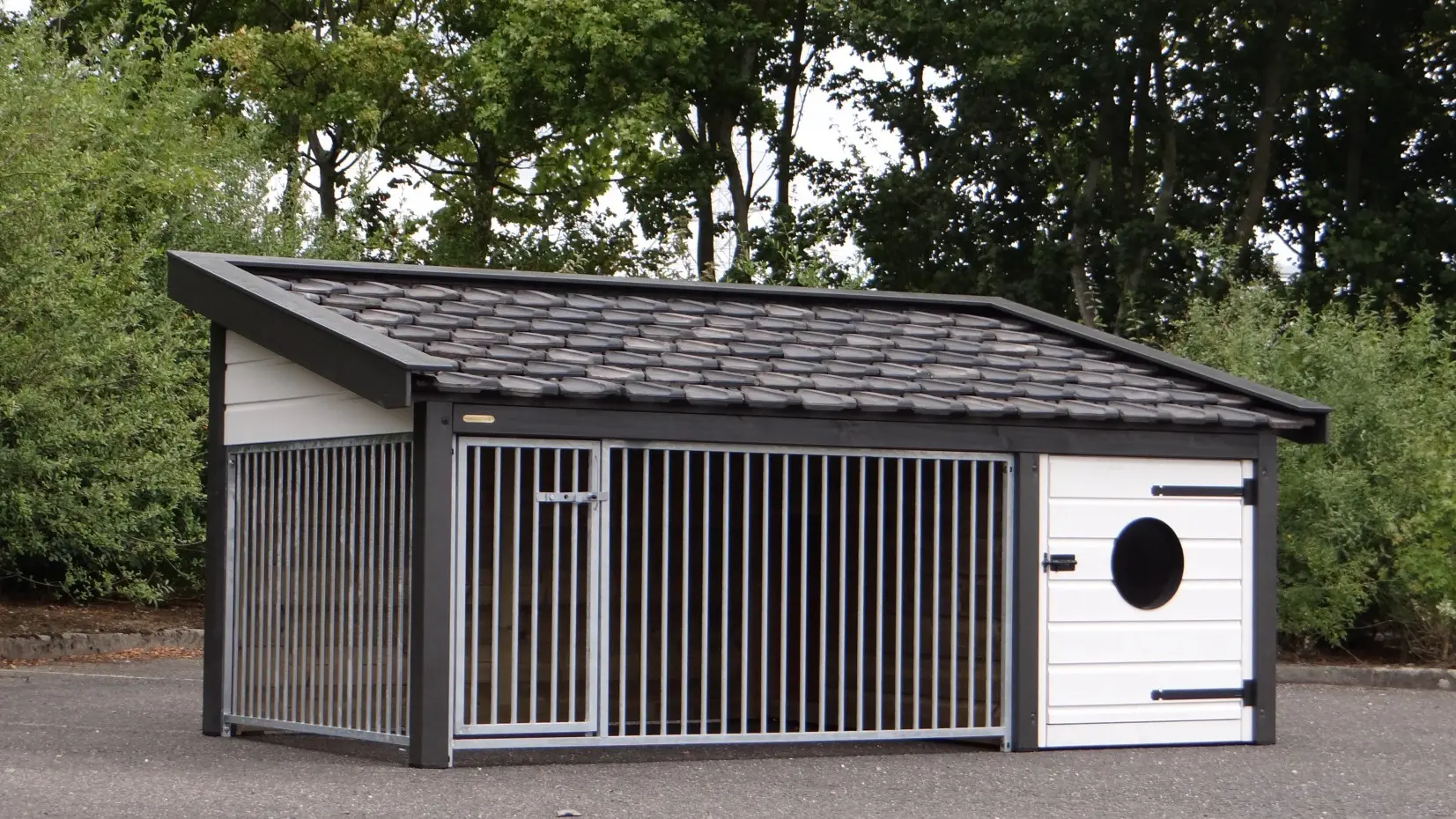 Dog kennel Rex 2 is made of impregnated wood and is painted in the colours white/anthracite. The kennel is provided with used roof tiles, which are available in different colours. The kennel has a large sleeping compartment with a plywood floor. The kennel is provided with 2 galvanized bar panels. It will be delivered as construction kit.