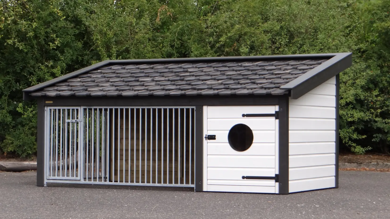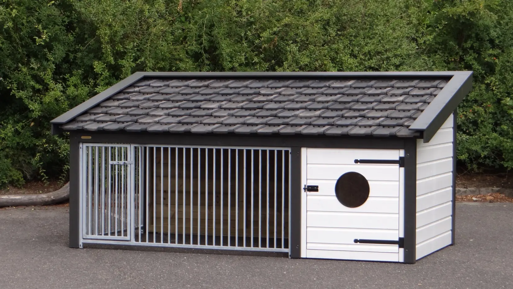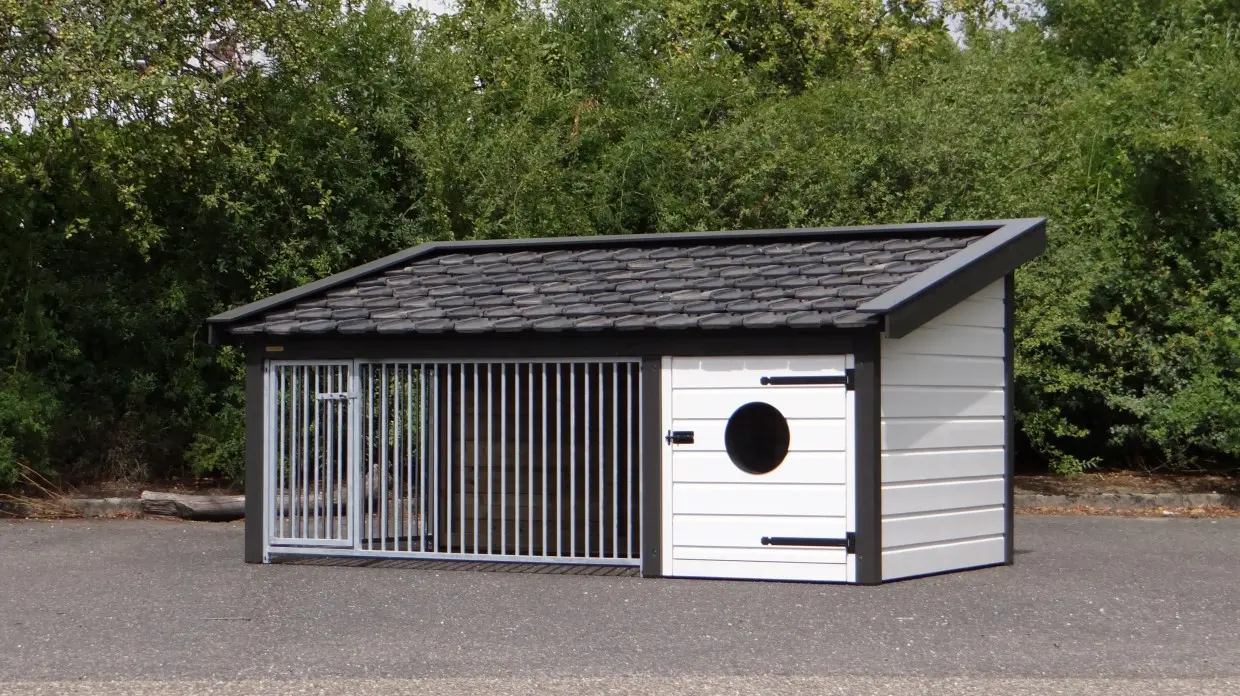 The dog kennel Rex 2 has an insulated sleeping compartment. The kennel is made of impregnated spruce wood and is also provided with second-handed roof tiles. The sleeping compartment has a plywood floor and a window in the door. The bar panels are galvanized. This kennel has an insulated sleeping compartment, so that your dog can stay outside during the whole year. The kennel has been painted in the colors white-anthracite.