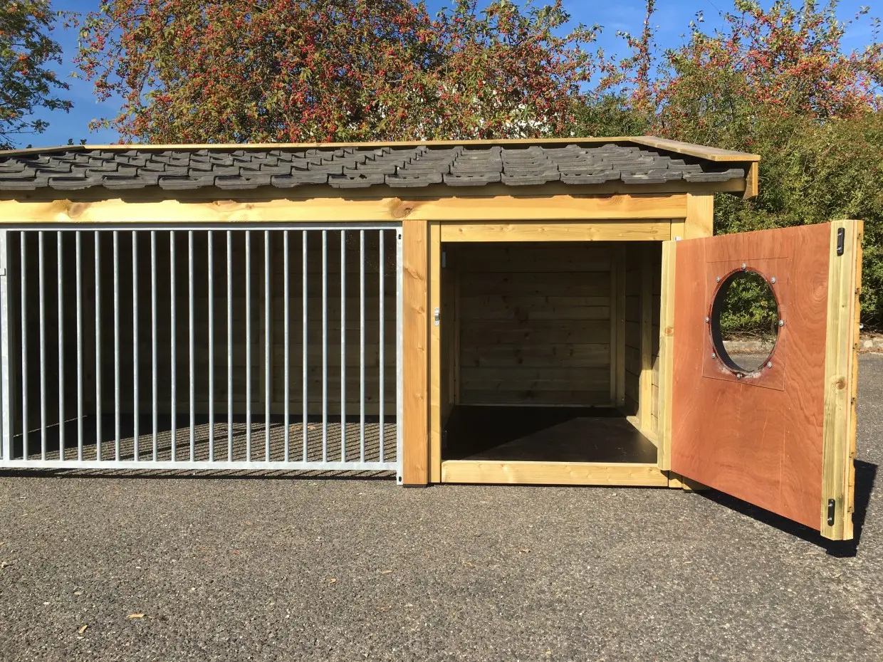 - This doghouse is equipped with used ceramic roof tiles.