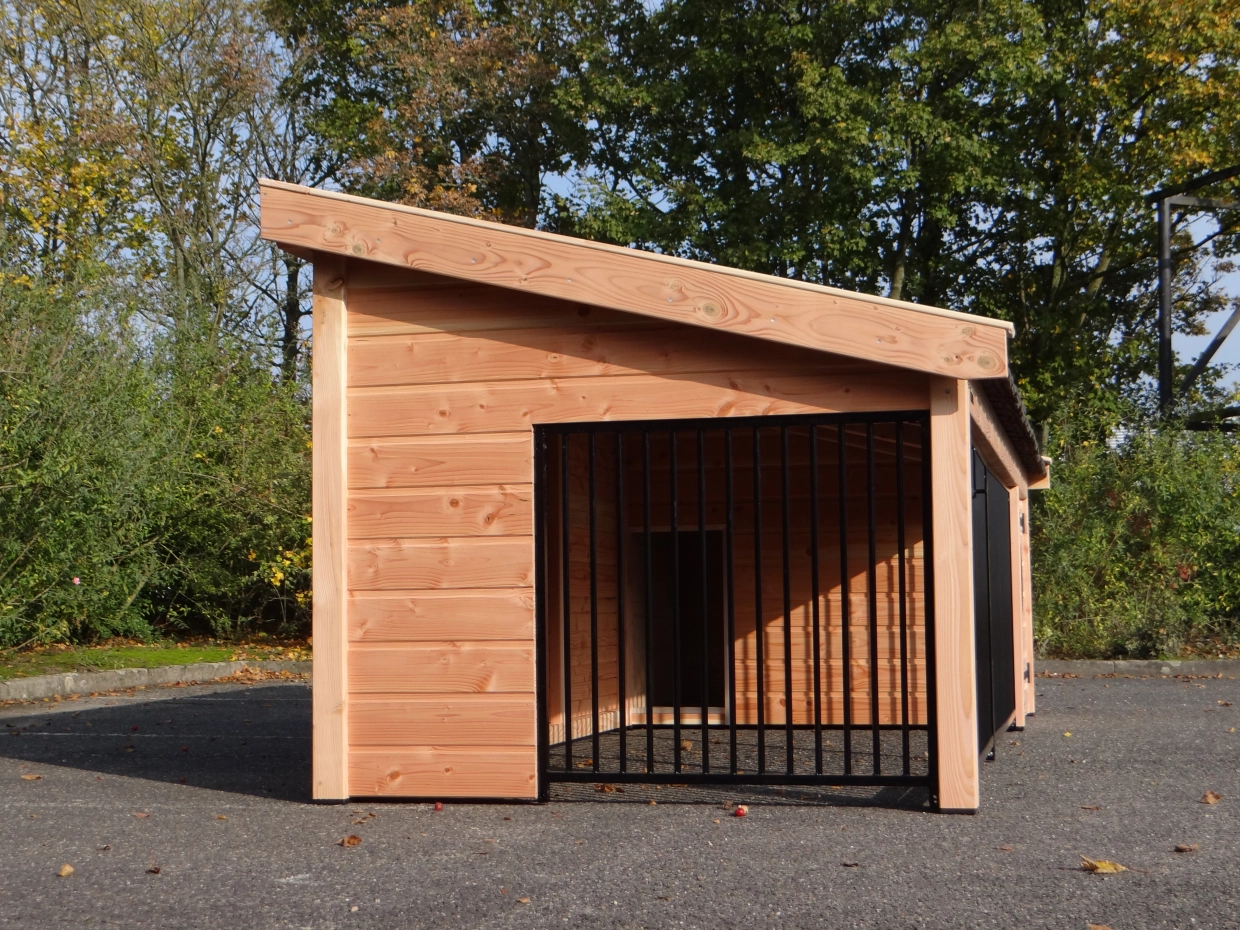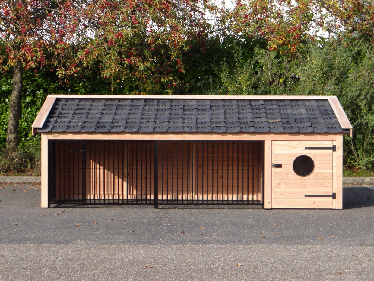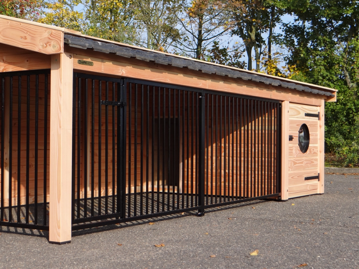 Dog kennel Rex 2XL is made of Douglaswood and is provided with used roof tiles. The kennel has an insulated sleeping compartment. The bar panels are black powdercoated, together with the Douglaswood is it a beautiful combination.