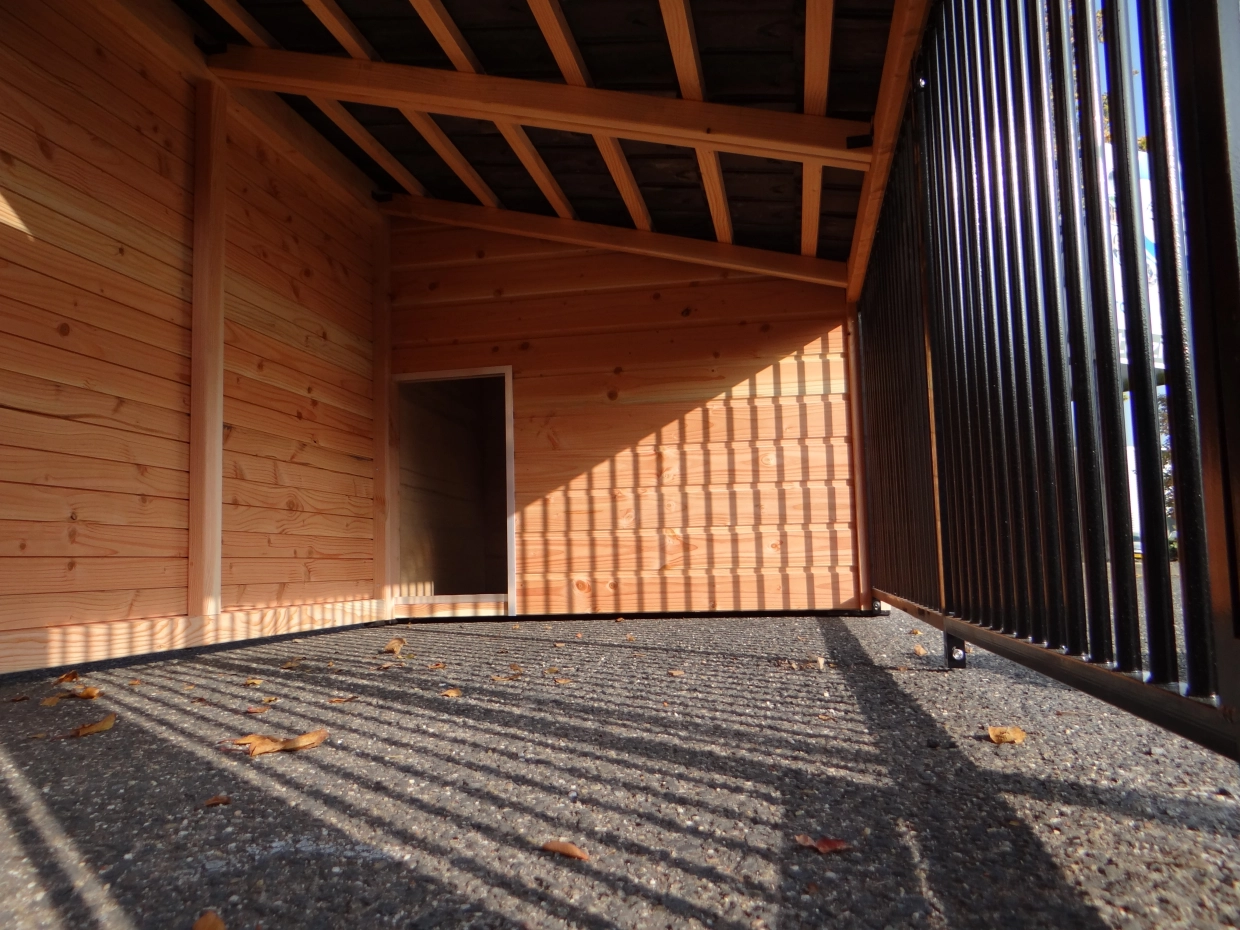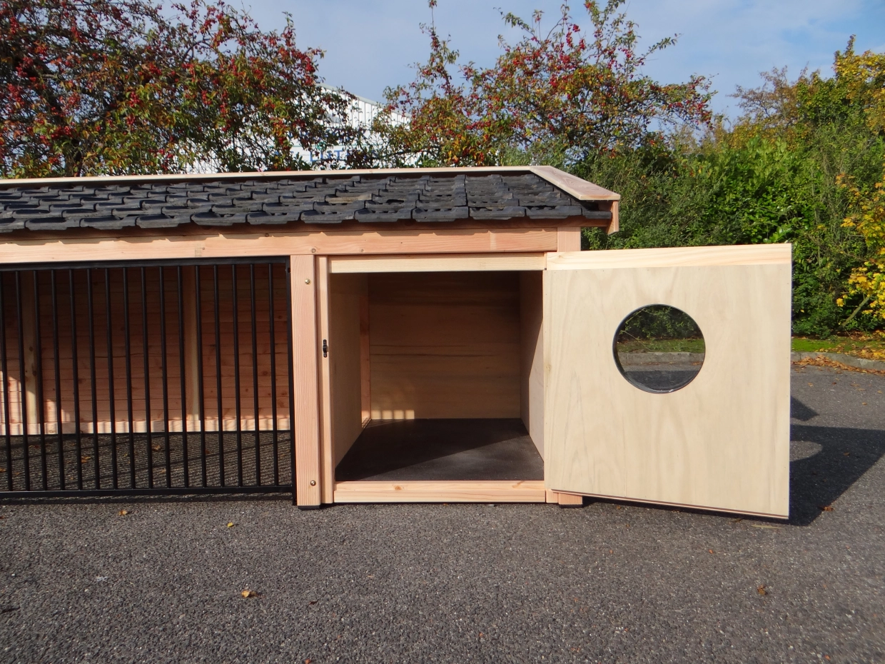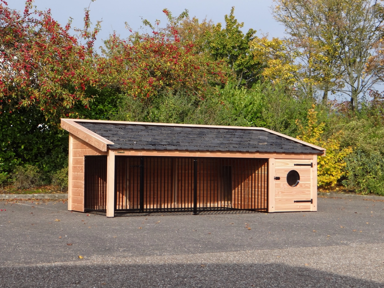 Dog kennel Rex 2XL is made of Douglaswood and is provided with used roof tiles. The kennel has an insulated sleeping compartment. The bar panels are black powdercoated, together with the Douglaswood is it a beautiful combination.