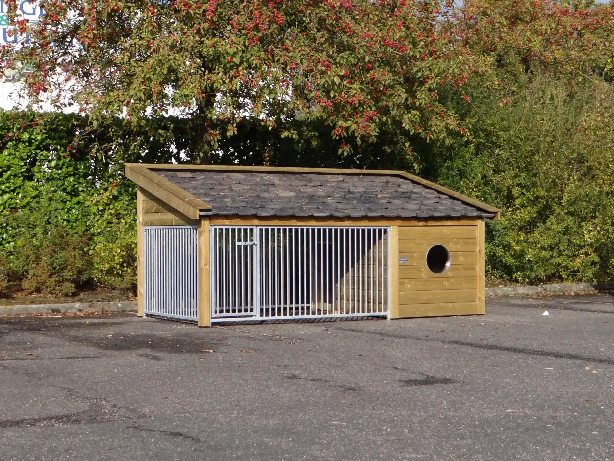 The dog kennel Rex 3 has an insulated sleeping compartment. The kennel is made of pressure-treated spruce wood and is also provided with second-handed roof tiles. The sleeping compartment has a plywood floor and a window in the door. The bar panels are galvanized. This kennel has an insulated sleeping compartment, so that your dog can stay outside during the whole year.