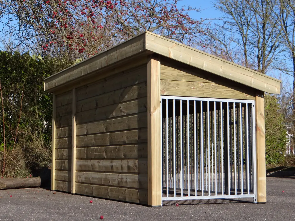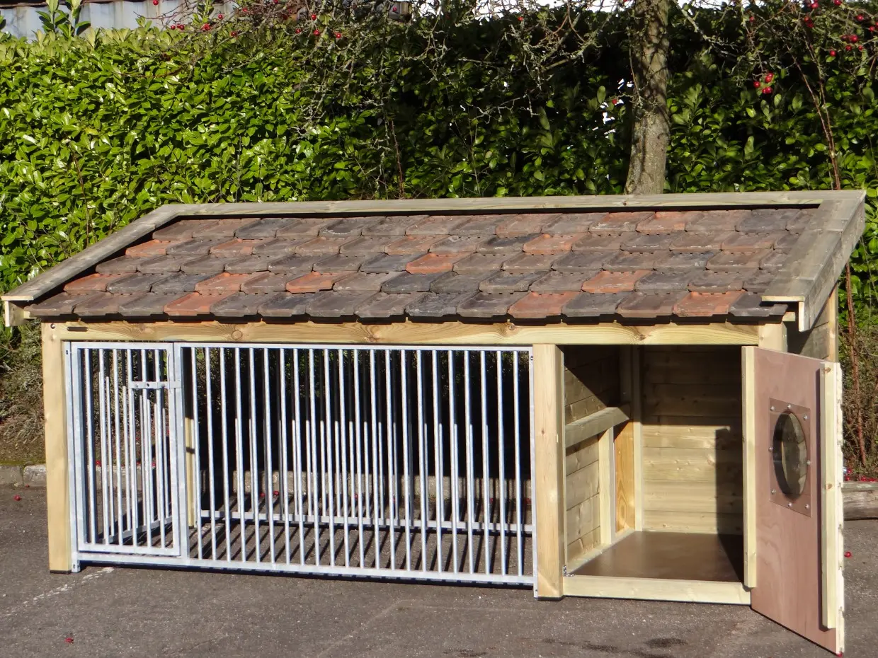 The Roxy 2 dog kennel, featuring an integrated sleeping area and spacious run, is an exceptional outdoor home for your dog. The roof is made of ceramic tiles, the walls and overhangs from pressure treated spruce wood, and the sleeping area floor from hexagrip plywood. A premium-quality kennel offering comfort and style.