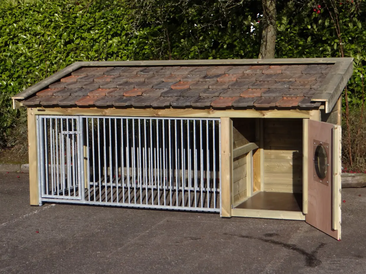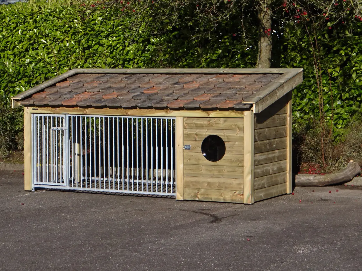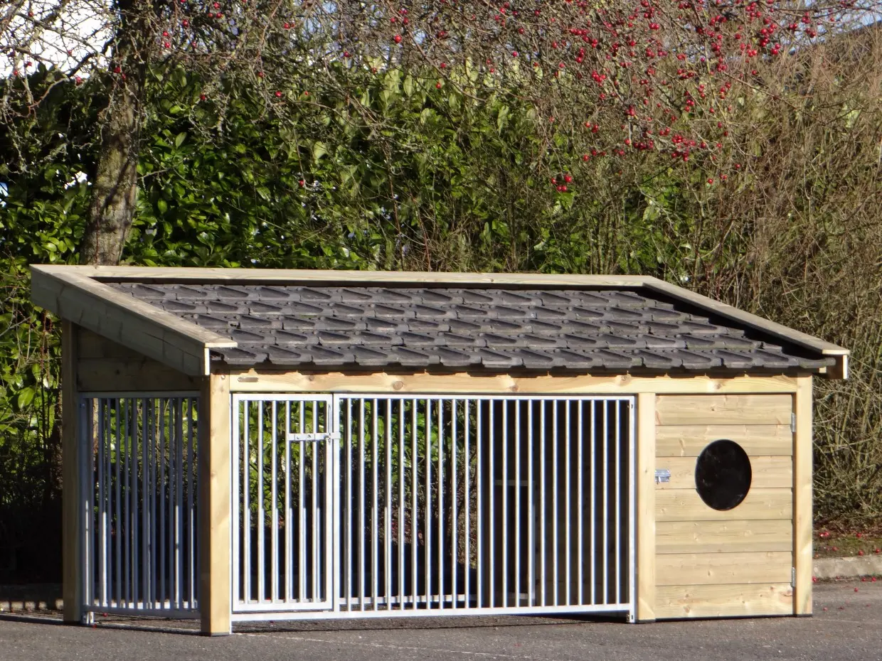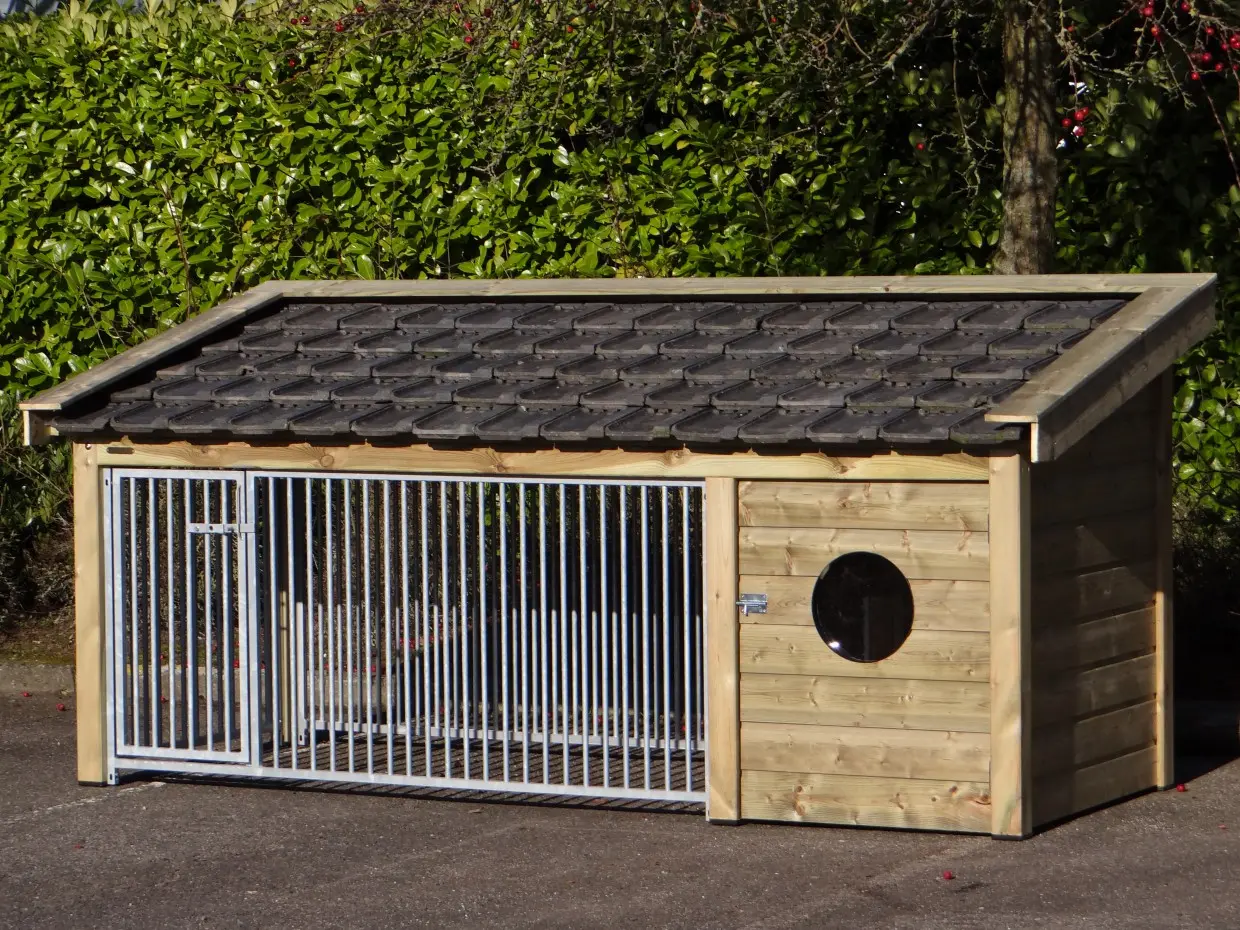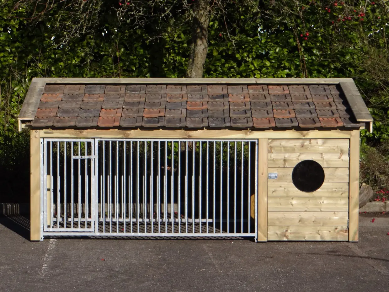 The Roxy 3 dog kennel combines a spacious sleeping area and open run under one roof. The ceramic-tiled roof is available in three colors. Made from pressure treated spruce wood, it requires no maintenance. The hexagrip plywood floor with anti-slip coating is easy to clean. With bars on three sides, Roxy 3 offers a durable, premium outdoor space for your dog.